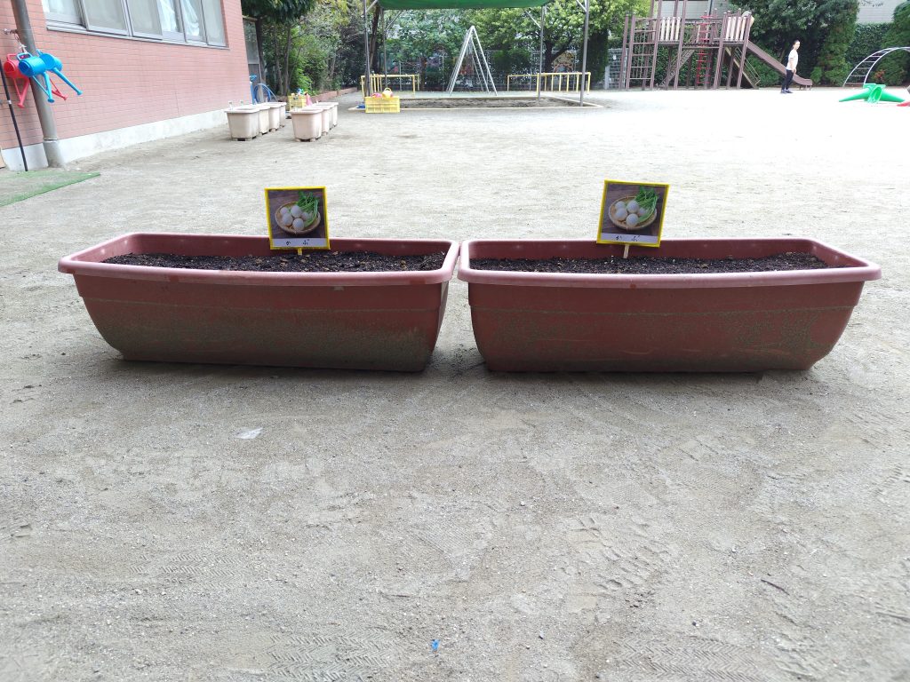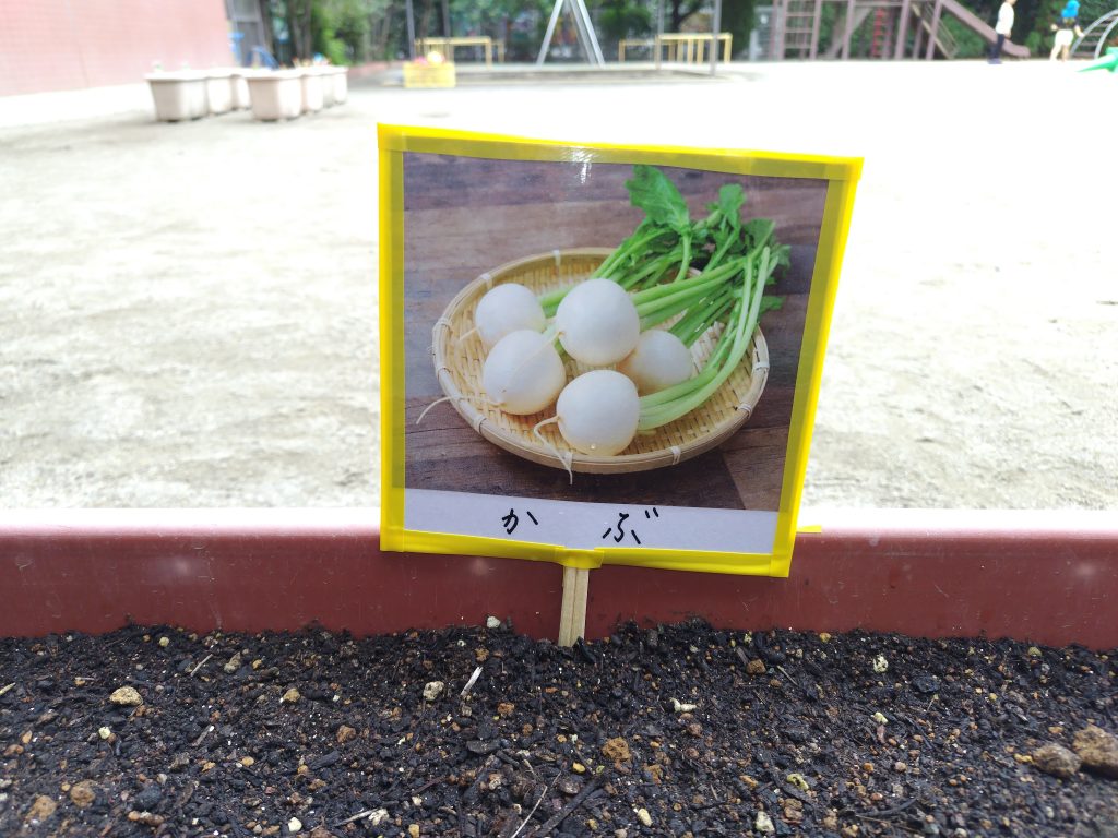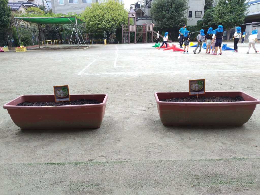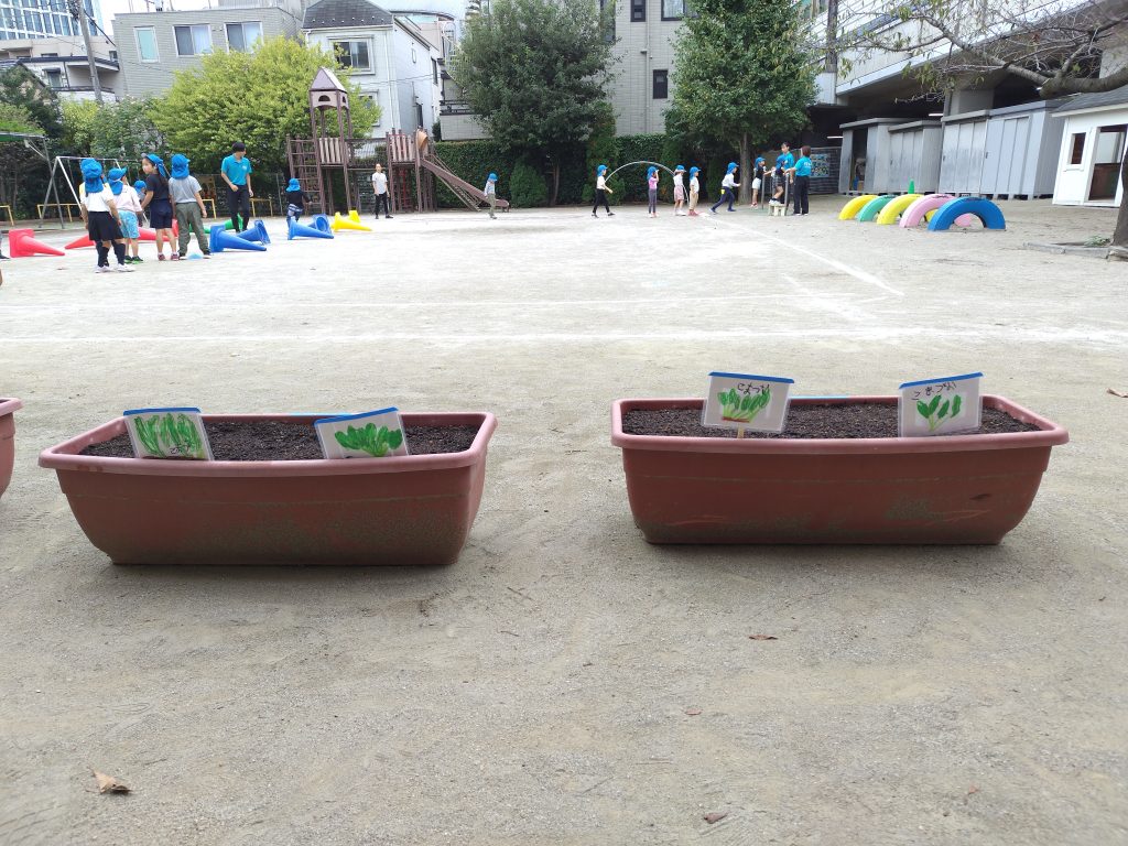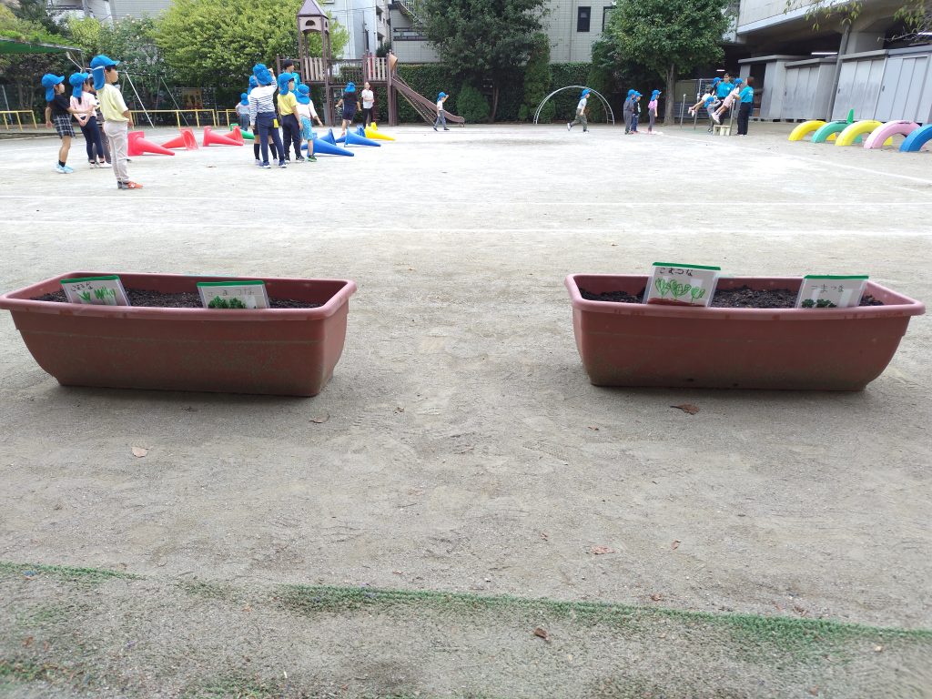 秋の野菜の種をまきました。年少組は「かぶ」、年中組は「ミニ大根」、年長組は「小松菜」。プランター栽培は学年ごと、食育活動の一環です。