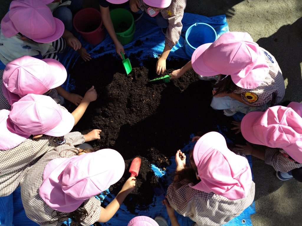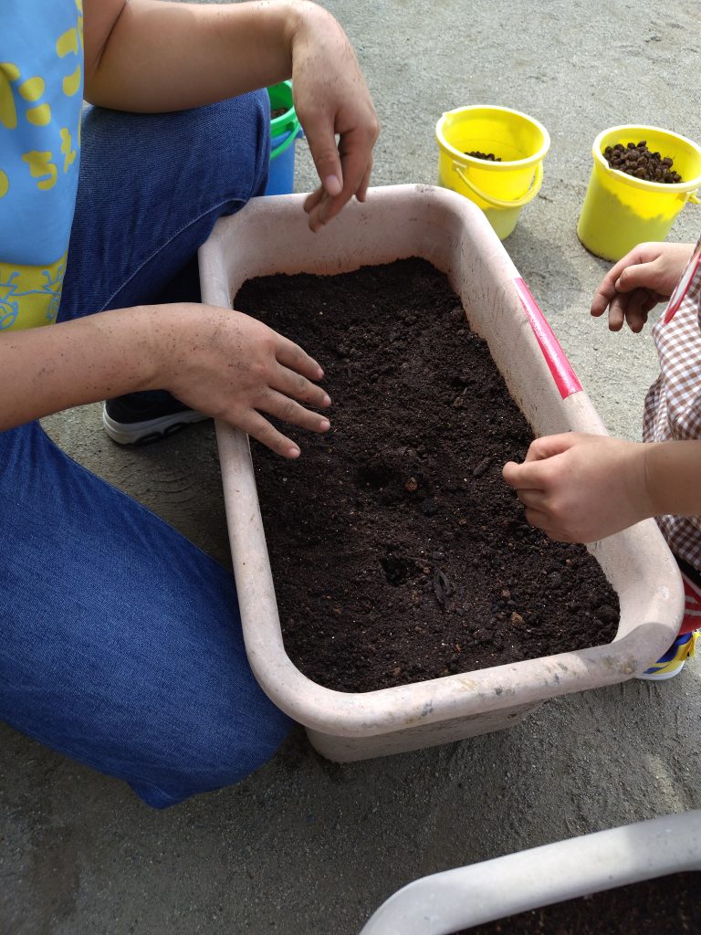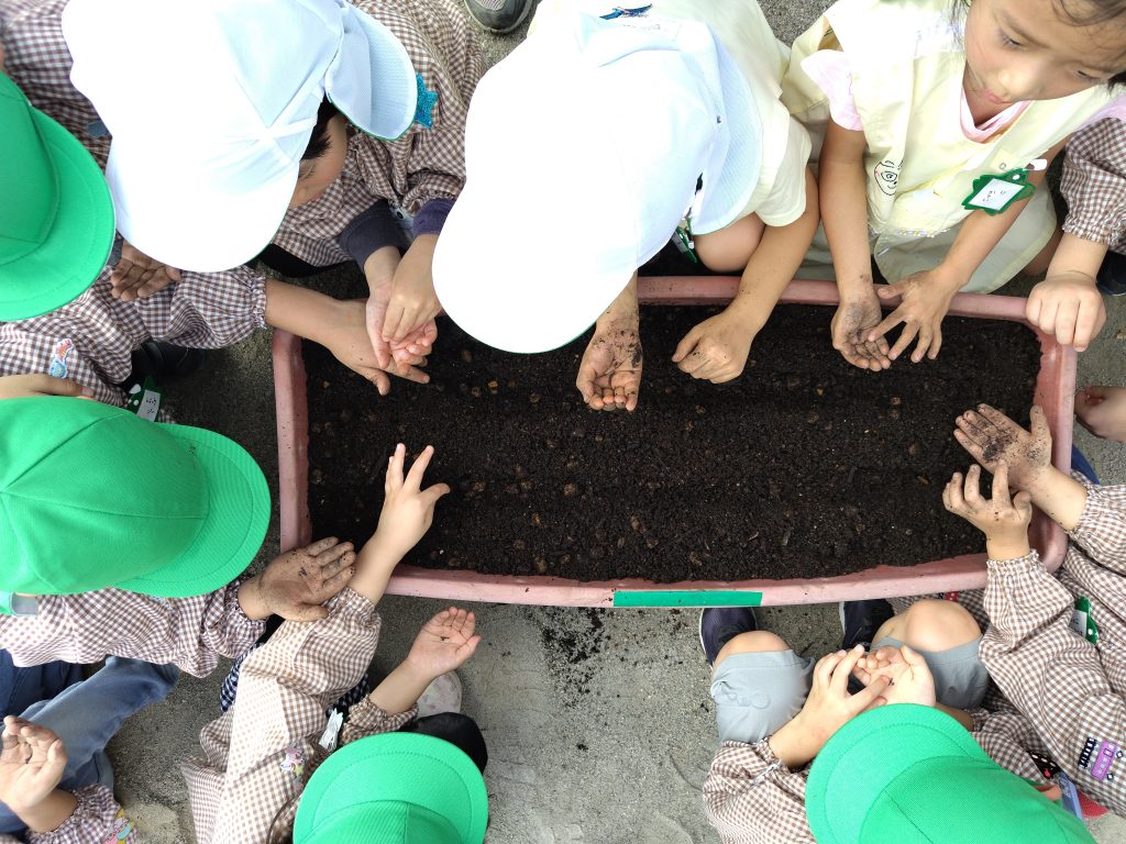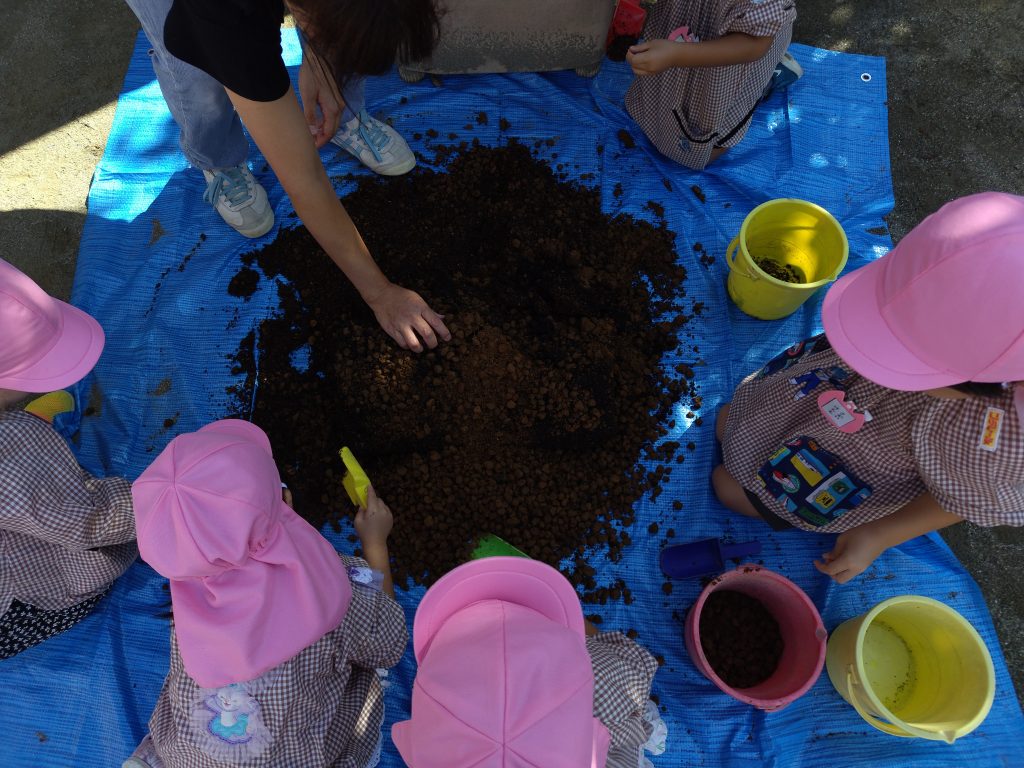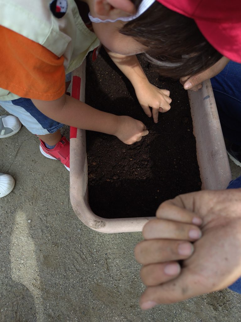 土を混ぜるところから始めました。子どもたち、興味津々、感触や香りを楽しむように手を動かして土を混ぜます。あっという間に手が土だらけ。土づくりは、“出会いの時間”。小さな虫たちがたくさん顔を出します。黒くてすばしっこい虫、もぞもぞ動く白い幼虫。取り除いてバケツに・・・。つかの間の昆虫観察は、物事を掘り下げて考えることに繋がり、子どもたちの世界が広がる体験です。思考や創造性を育む豊かな時間。