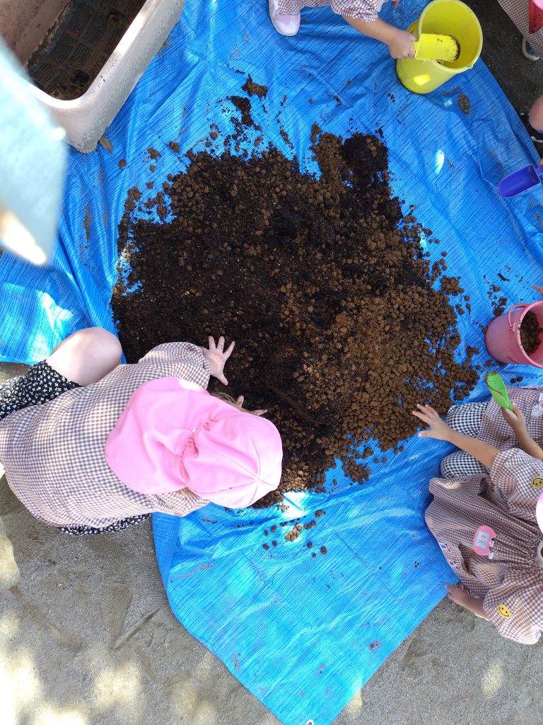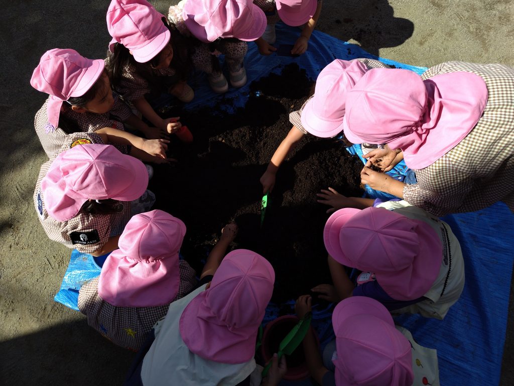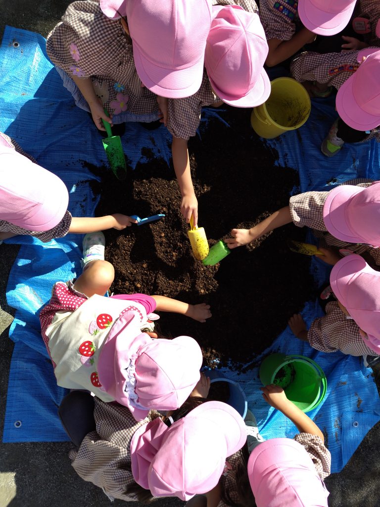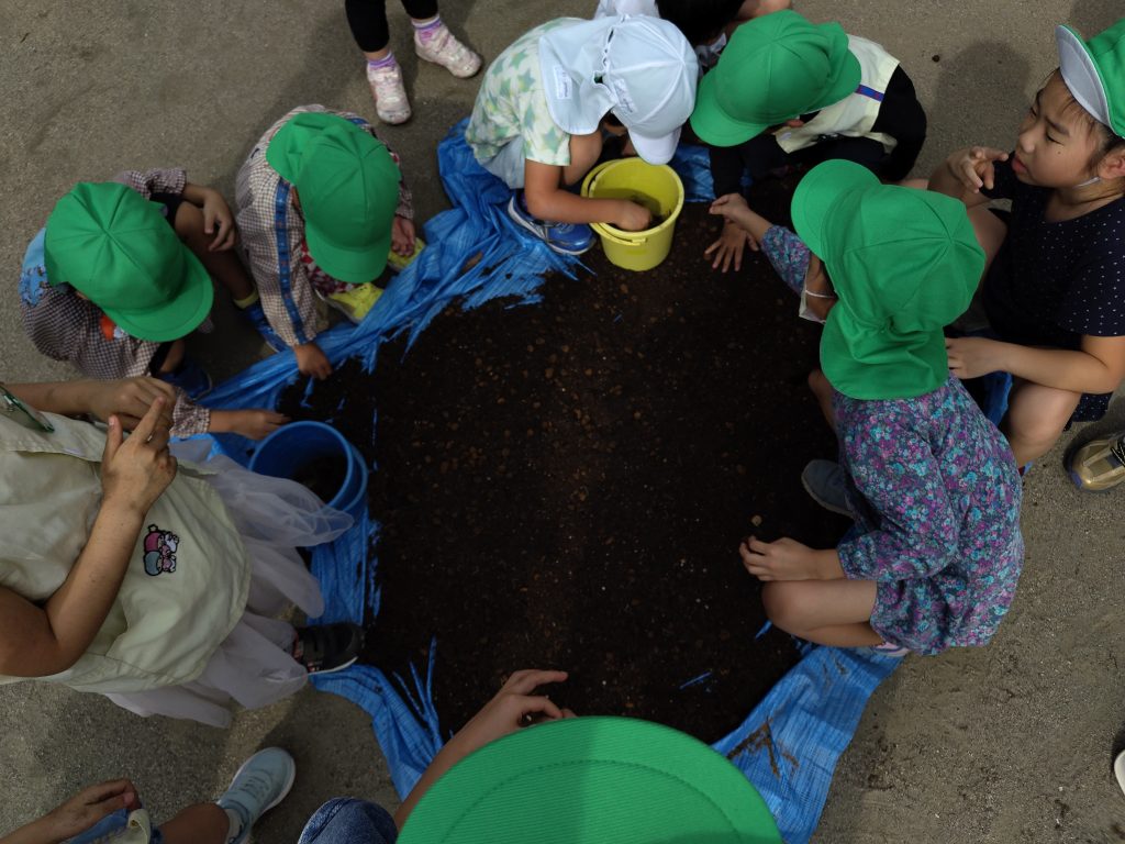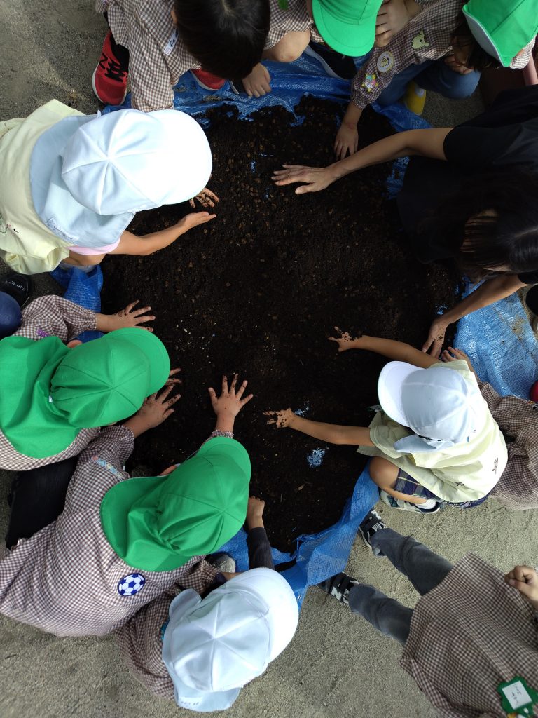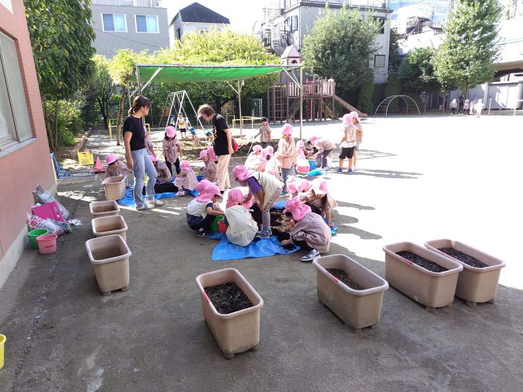 土を混ぜるところから始めました。子どもたち、興味津々、感触や香りを楽しむように手を動かして土を混ぜます。あっという間に手が土だらけ。土づくりは、“出会いの時間”。小さな虫たちがたくさん顔を出します。黒くてすばしっこい虫、もぞもぞ動く白い幼虫。取り除いてバケツに・・・。つかの間の昆虫観察は、物事を掘り下げて考えることに繋がり、子どもたちの世界が広がる体験です。思考や創造性を育む豊かな時間。