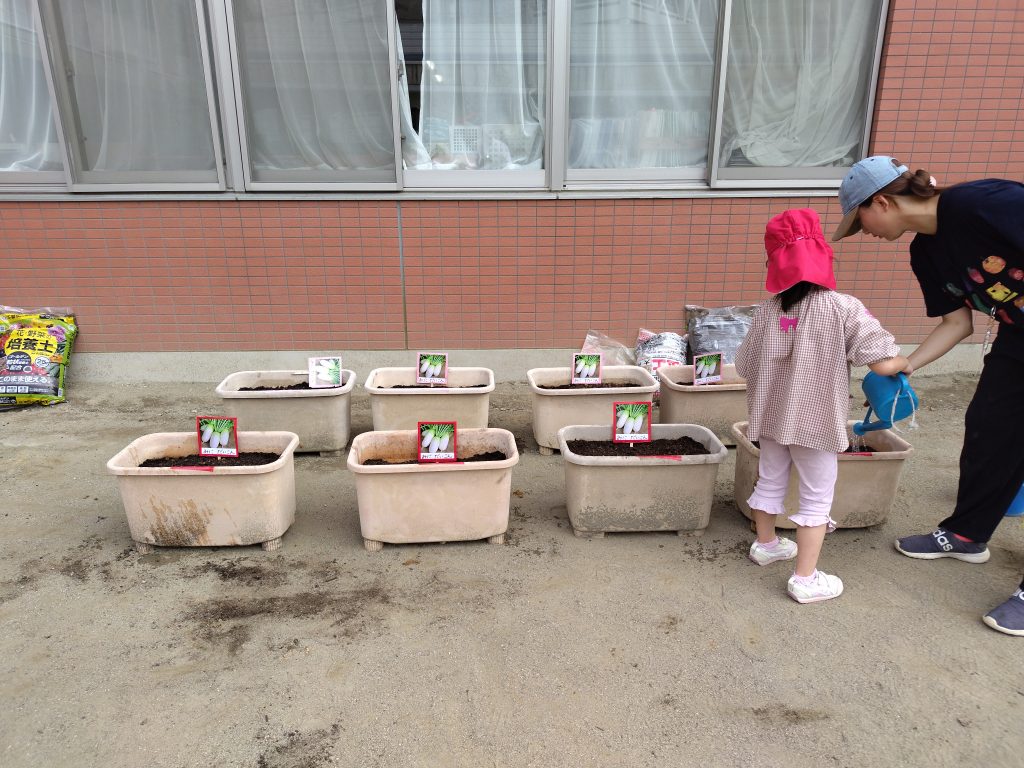 それぞれ、小さな種を落とさないように土の中に入れます。「大きくなぁれ」「はやくめをだしてね」「お水あげるからね」と、小さな声で話しかける子も。これからの生長が楽しみのようです。