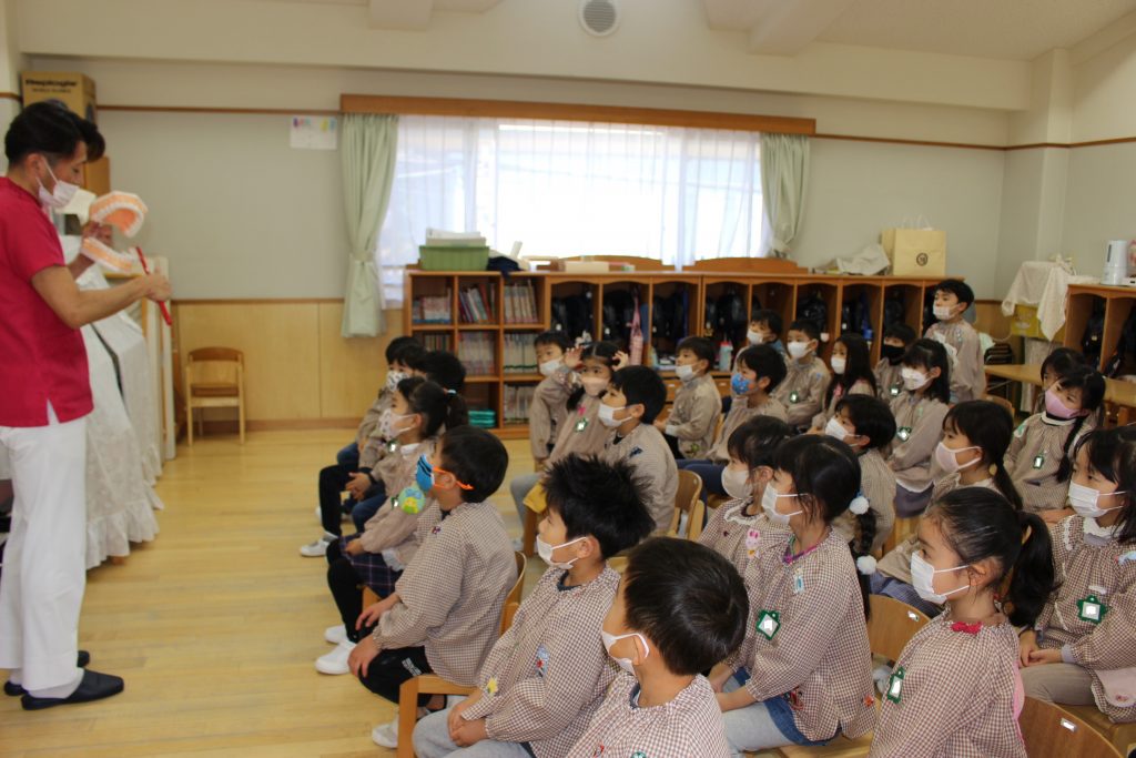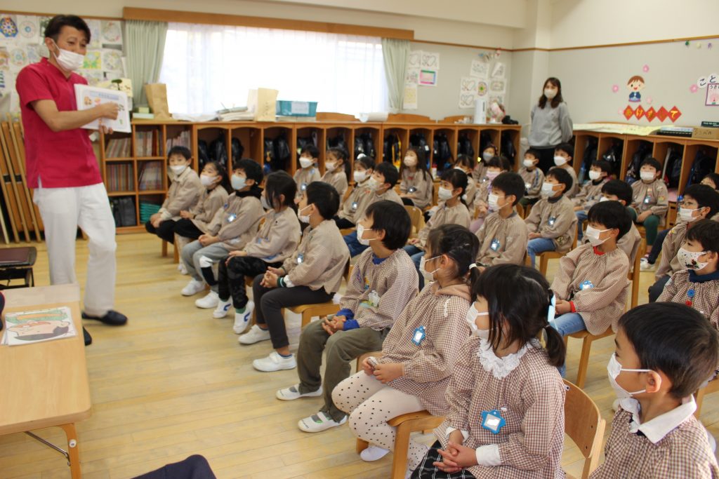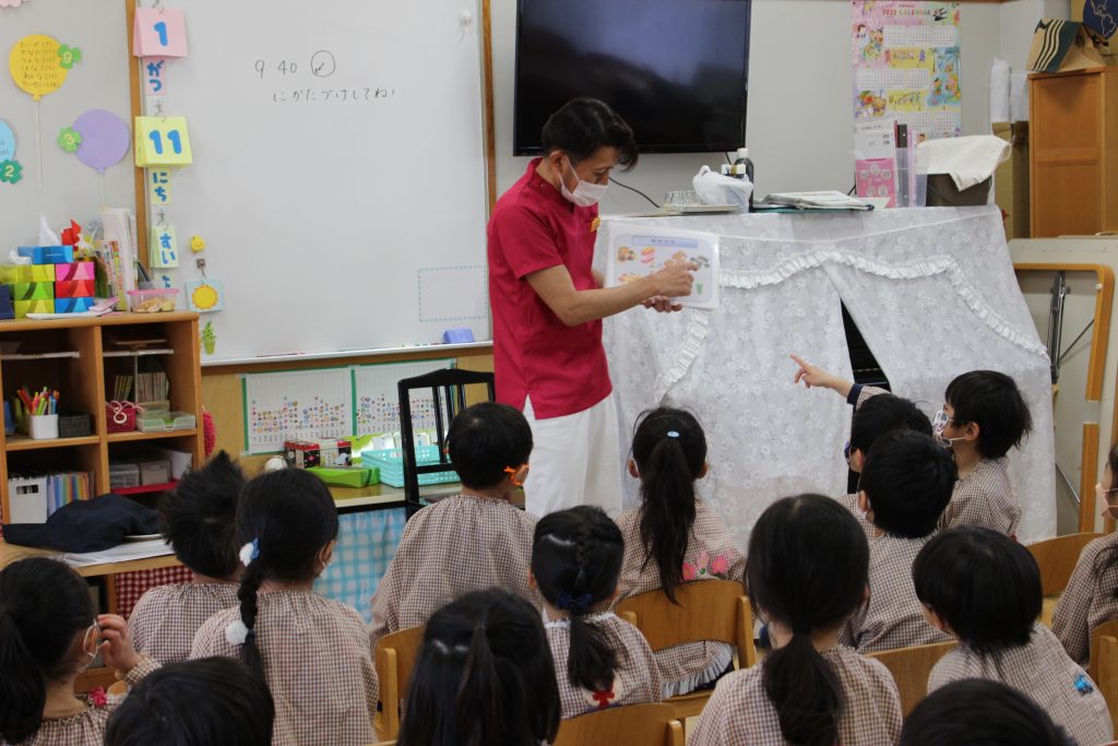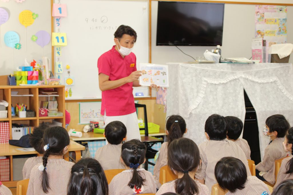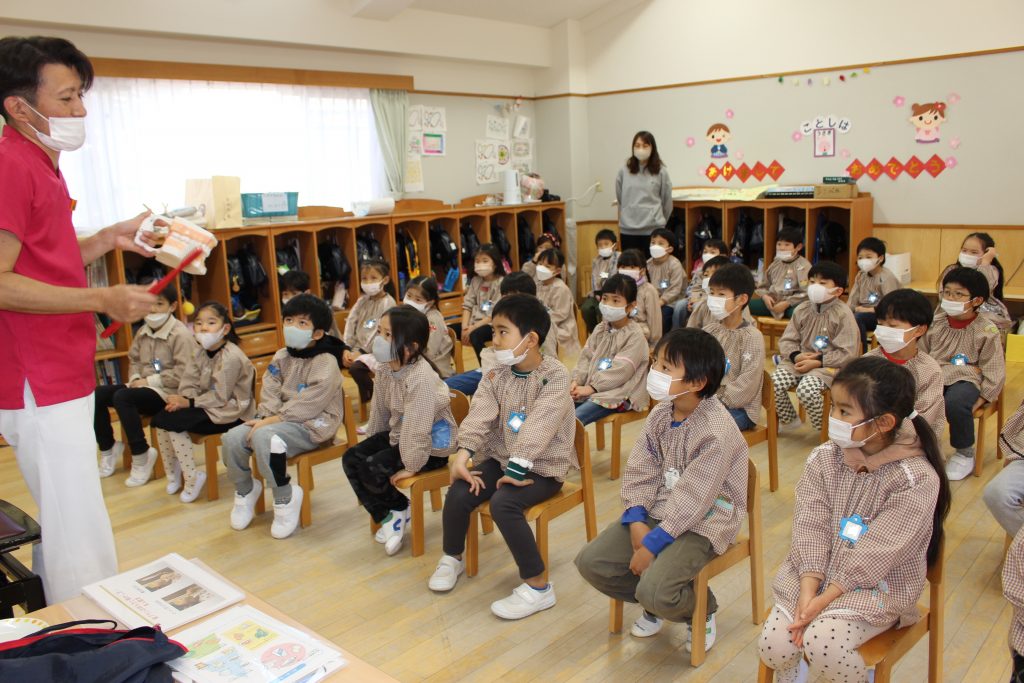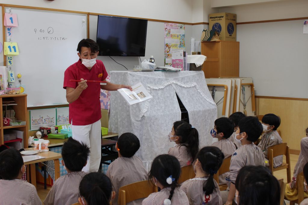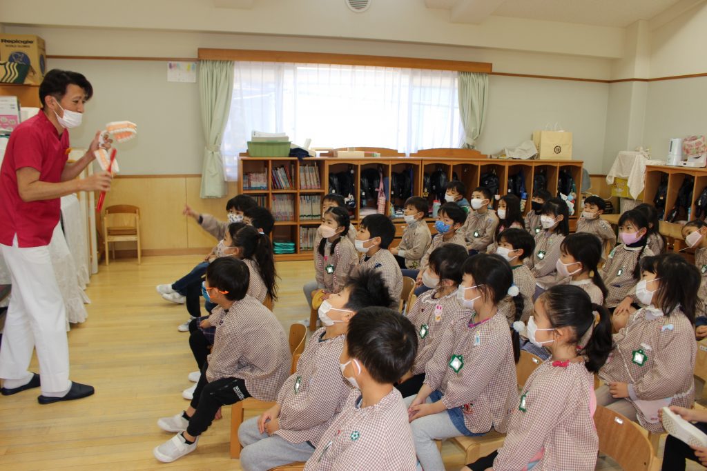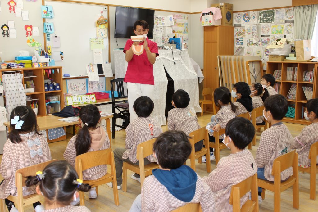 佐藤先生は、本園の卒園生、そして卒園生の保護者というお立場でもあります。子ども達のために、事前にいろいろと準備をしてくださり、歯や歯磨きの大切さをわかりやすく、さまざまな角度から伝えてくださいました。翌日以降には、家庭での歯磨きに変化があった様子。「以前よりも丁寧に磨くようになった。」「歯磨きが上手になった。」「食べたら磨くということを何度も家族に話していた。」など保護者の皆様から嬉しい報告もいただきました。来年度も継続できるよう計画していきます。