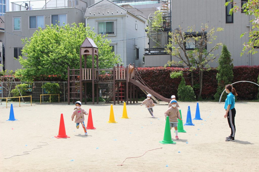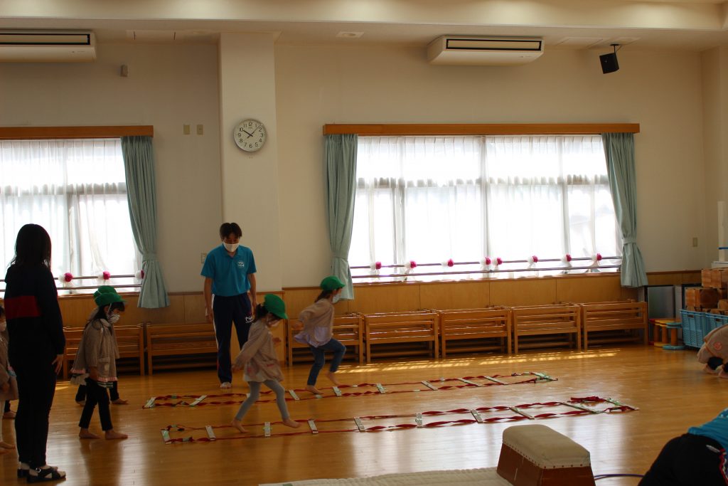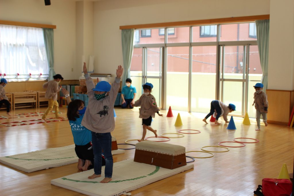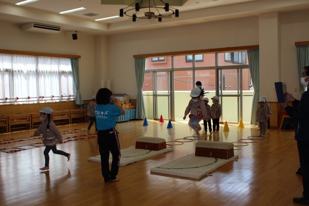 幼児期に必要な運動は、コーディネーショントレーニングであり、リズム・反応・バランス・連結・定位・変換・識別の7つの基本能力から構成されるものだそうです。状況を目や耳などの五感で察知し、それを頭で認知し、具体的に筋肉を動かすといった一連の過程をスムーズに行う能力を養うことを大切にする考えで指導いただきます。