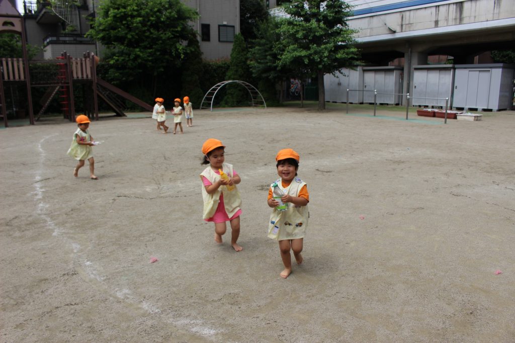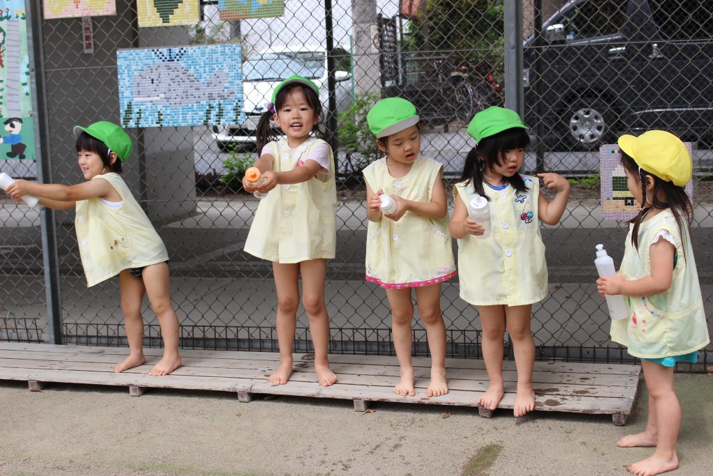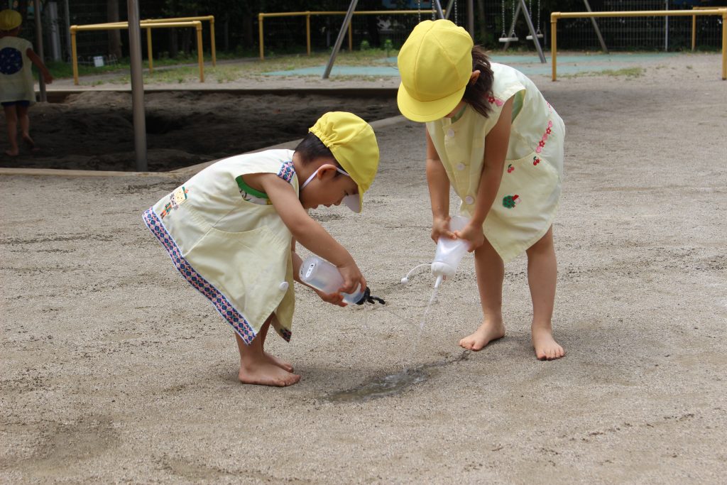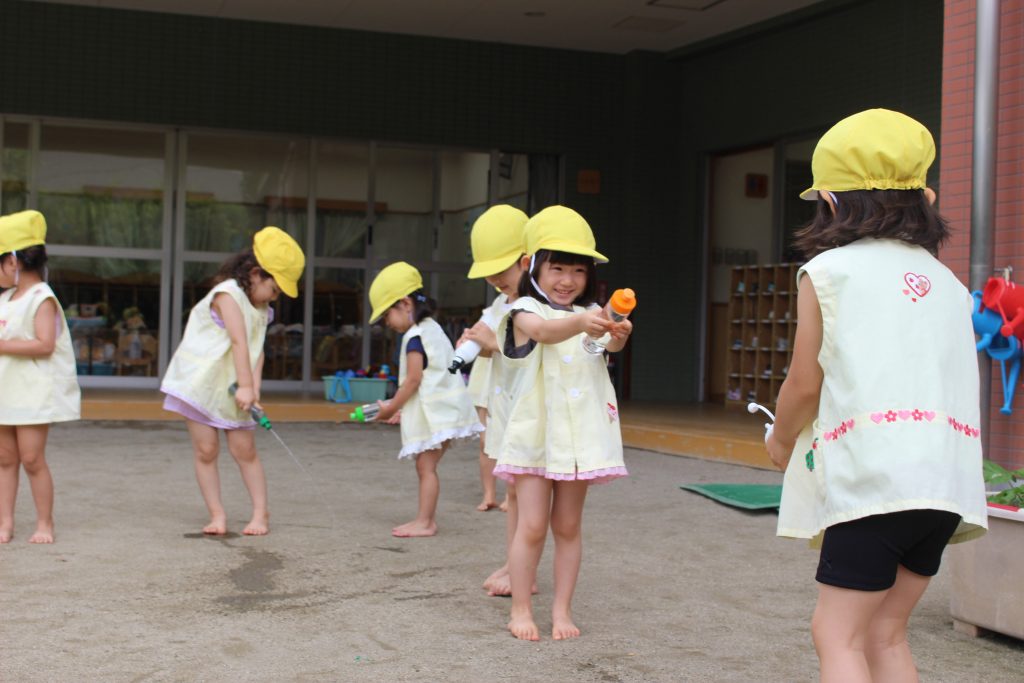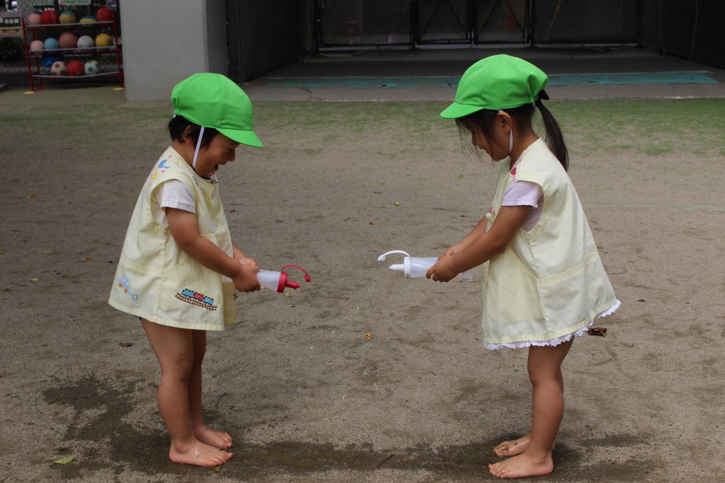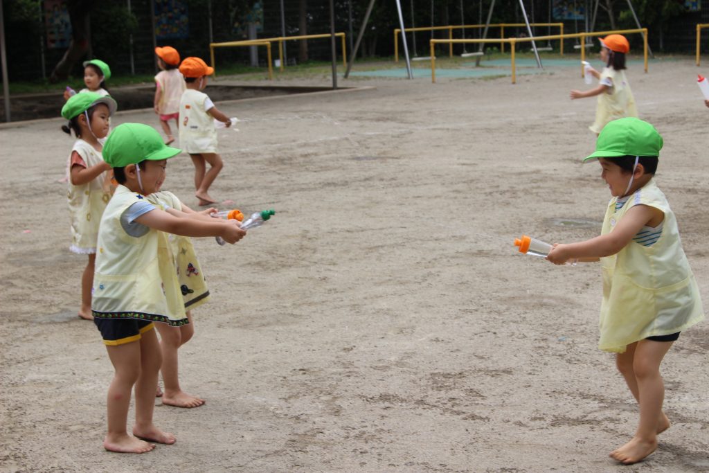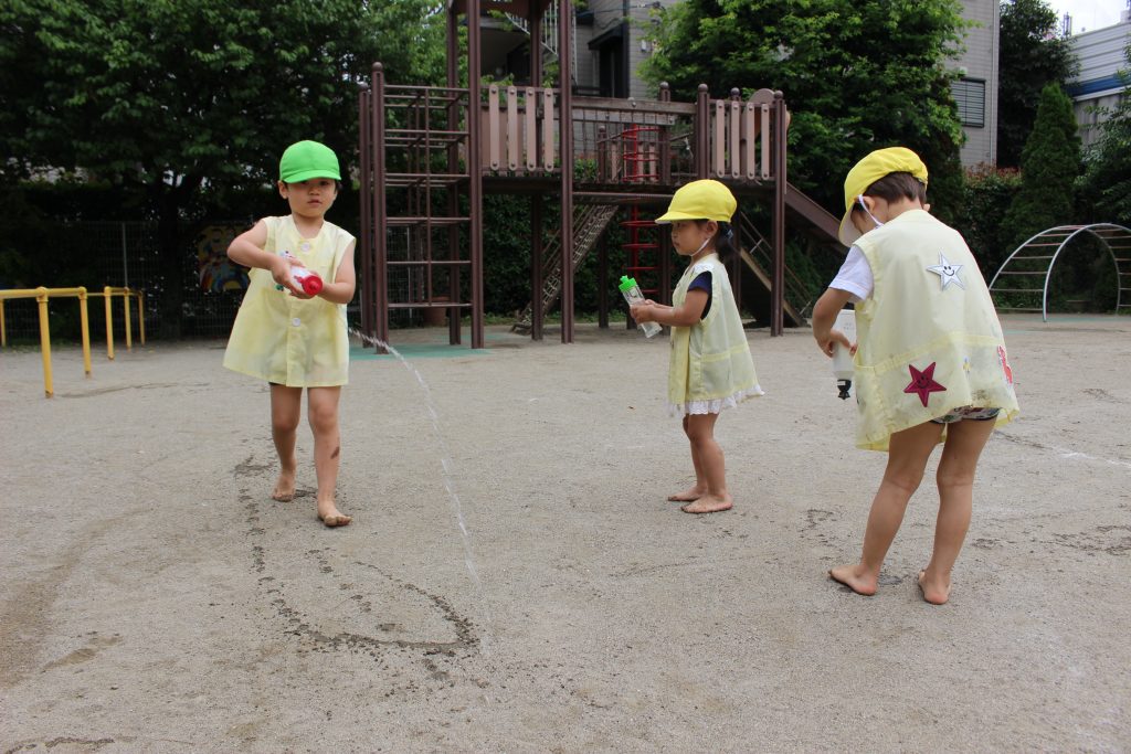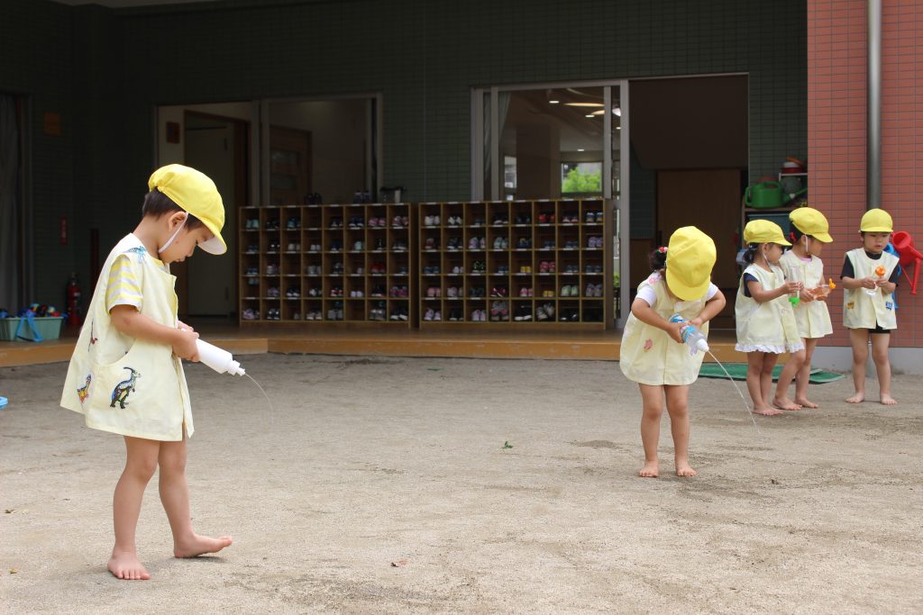 梅雨の晴れ間に水あそびをしました。水あそびは、暑い季節に欠かせないあそびです。特に、年少組の子ども達にとっての水あそびは、園生活が楽しいと感じる大きなきっかけにもなっています。裸足になり、地面の感触を感じながらゆっくりと園庭へ向かう一人ひとりの表情は、新しい世界に足を踏む入れていくようで微笑ましく、こちらも何だかわくわくしてきます。各ご家庭で準備してくださった水鉄砲を手にし、いよいよスタート。ぎゅっと押すと、水が出てくることを繰り返し試す中で、真下の地面に向けたり、遠くに飛ばすことを楽しんだり、友だちとかけ合ったりと笑顔と歓声が園庭中に溢れていました。