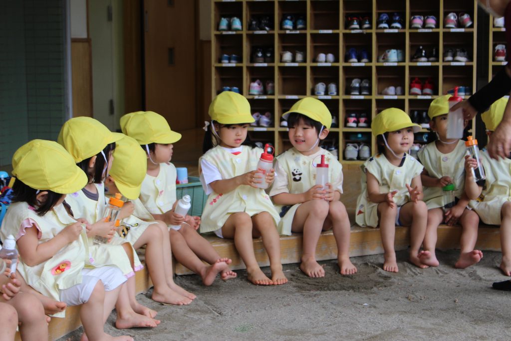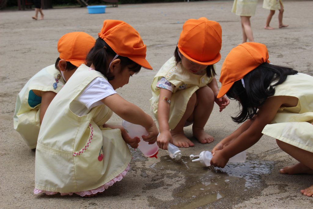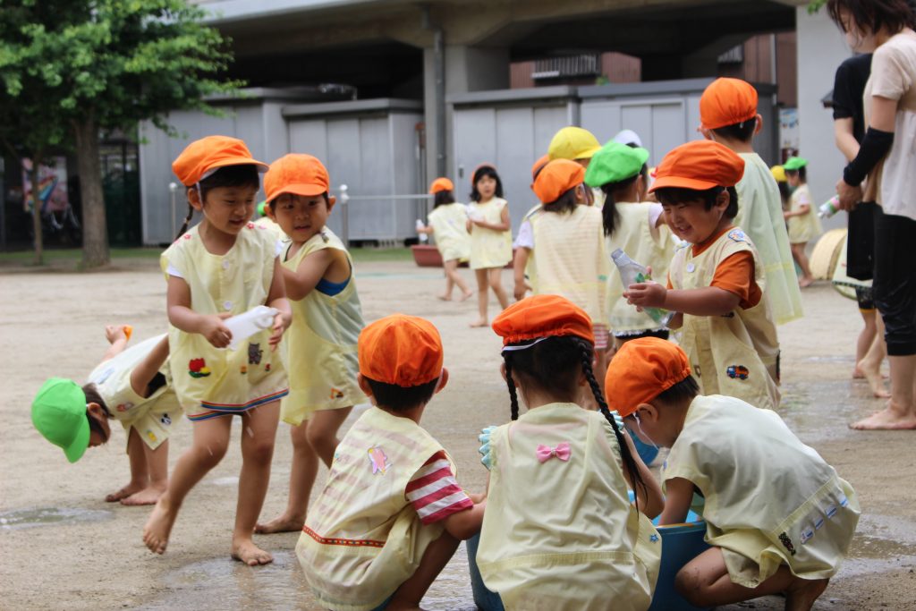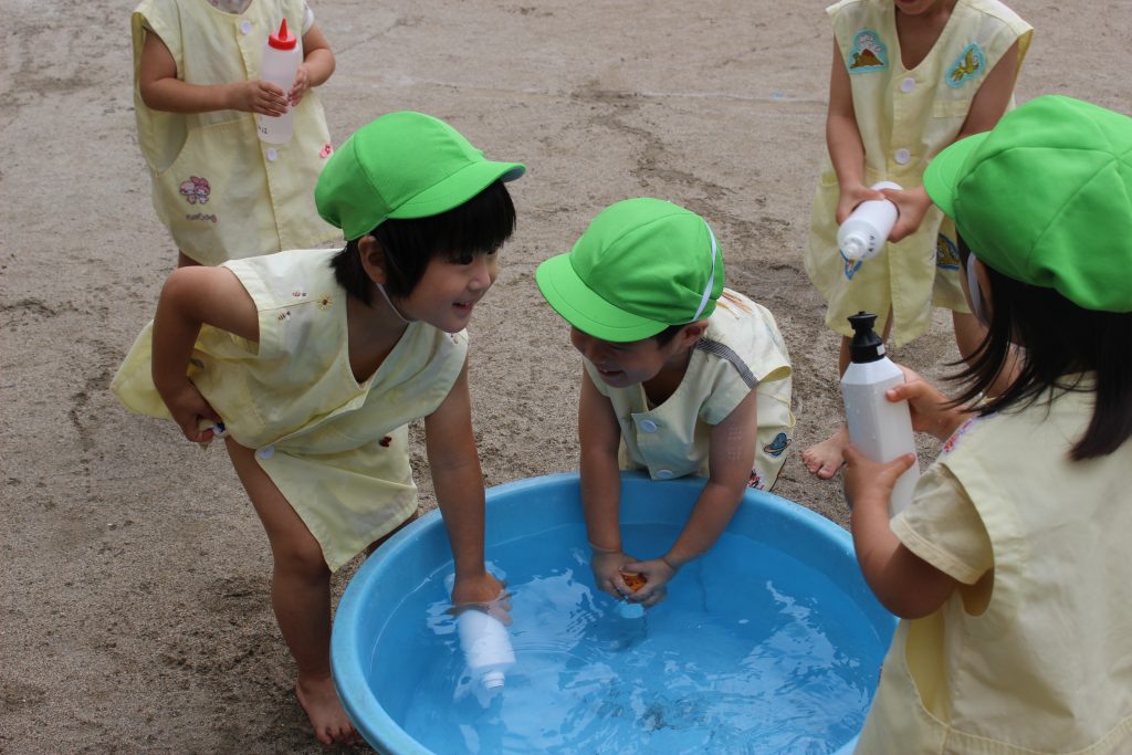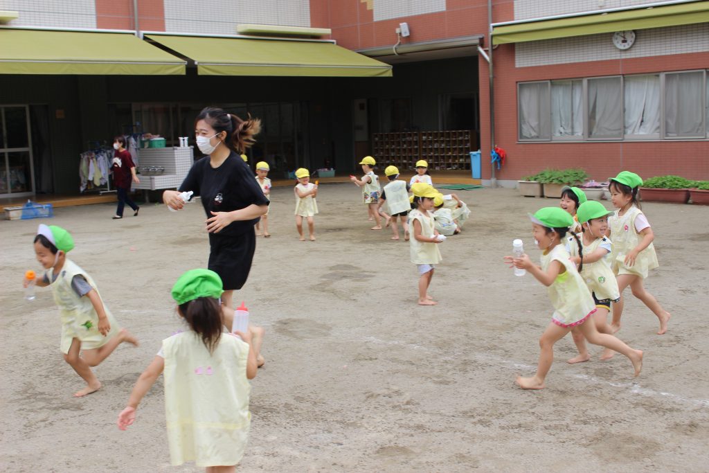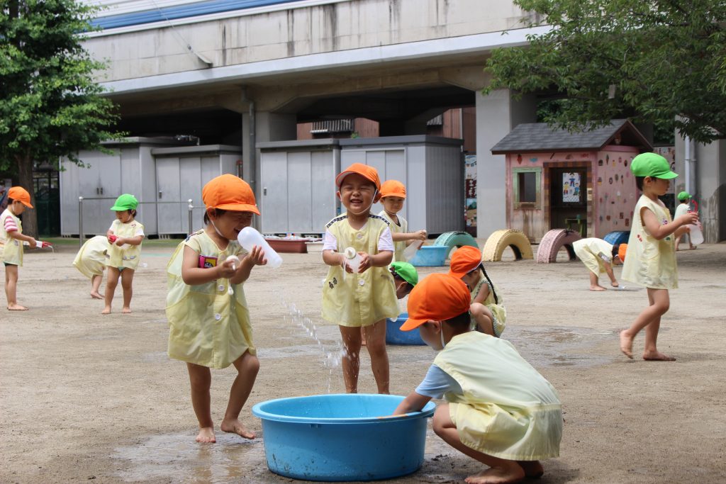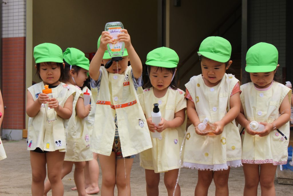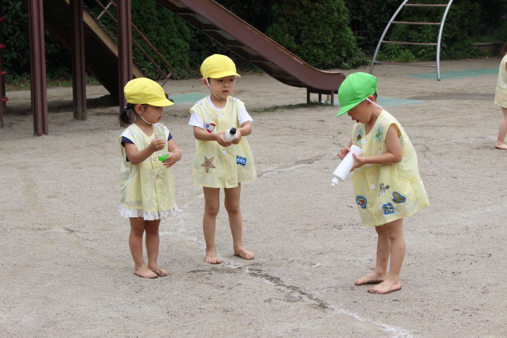 梅雨の晴れ間に水あそびをしました。水あそびは、暑い季節に欠かせないあそびです。特に、年少組の子ども達にとっての水あそびは、園生活が楽しいと感じる大きなきっかけにもなっています。裸足になり、地面の感触を感じながらゆっくりと園庭へ向かう一人ひとりの表情は、新しい世界に足を踏む入れていくようで微笑ましく、こちらも何だかわくわくしてきます。各ご家庭で準備してくださった水鉄砲を手にし、いよいよスタート。ぎゅっと押すと、水が出てくることを繰り返し試す中で、真下の地面に向けたり、遠くに飛ばすことを楽しんだり、友だちとかけ合ったりと笑顔と歓声が園庭中に溢れていました。