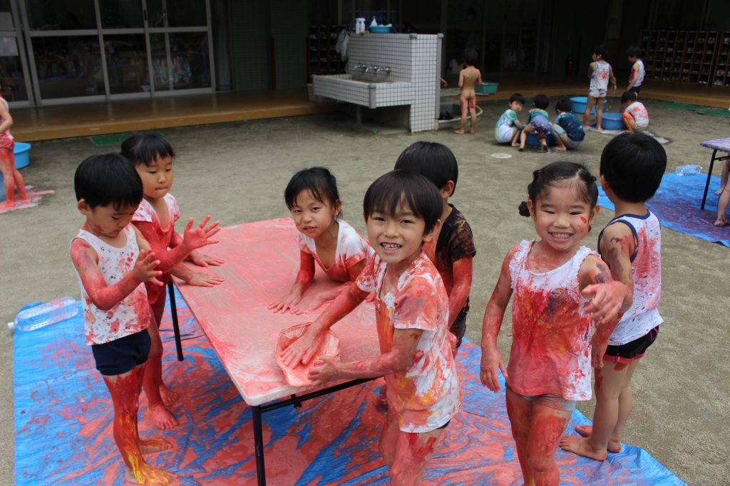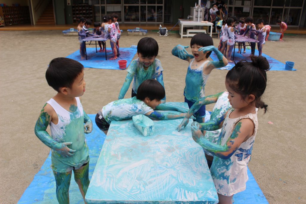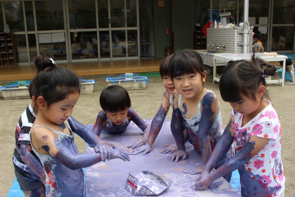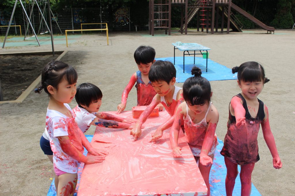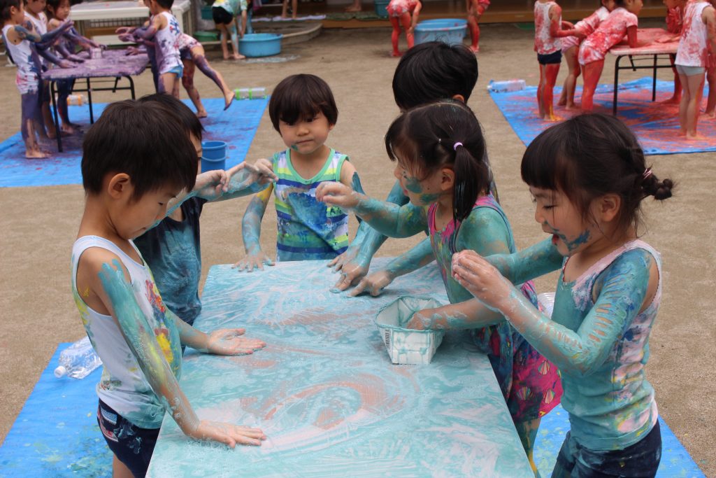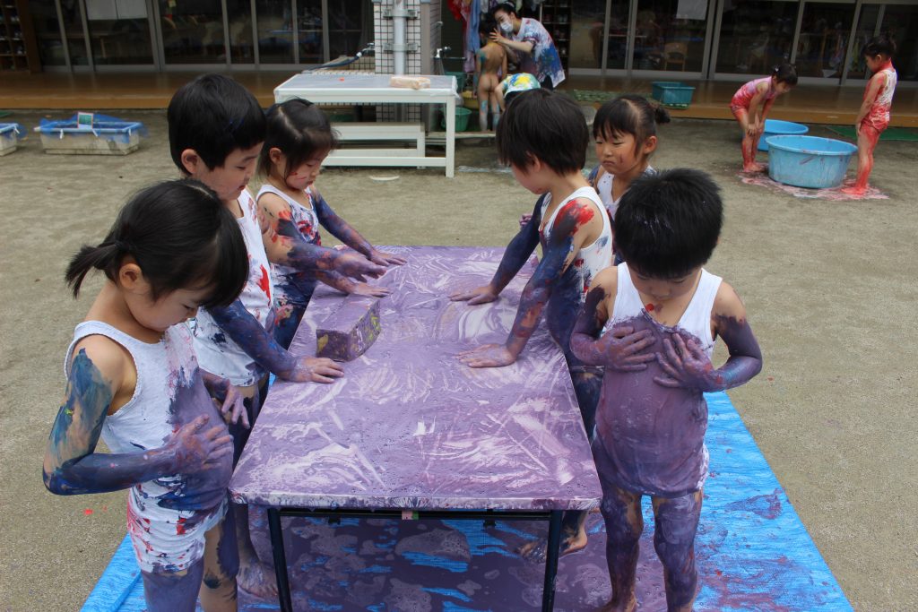 毎年この時期には、年少組がフィンガーペイント、年中組がボディペイントを行います。昨年はそれが叶わず、この日の年中組の子ども達にとっては初めての経験。汚れてもよい服に着替えると、待ちきれない様子で2階から園庭へ降りてきました。机の上に赤、青、緑、黄、白の絵の具が出てくると、指や手から始まり、腕、足など全身で感触を楽しんでいました。「ぬるぬるしてる!」「冷たくて気持ちいいね!」「色が変わった!!」と感じたことを言葉にしたり、友だちとの会話もはずみ、思い思いに心を解放させている姿が印象的でした。