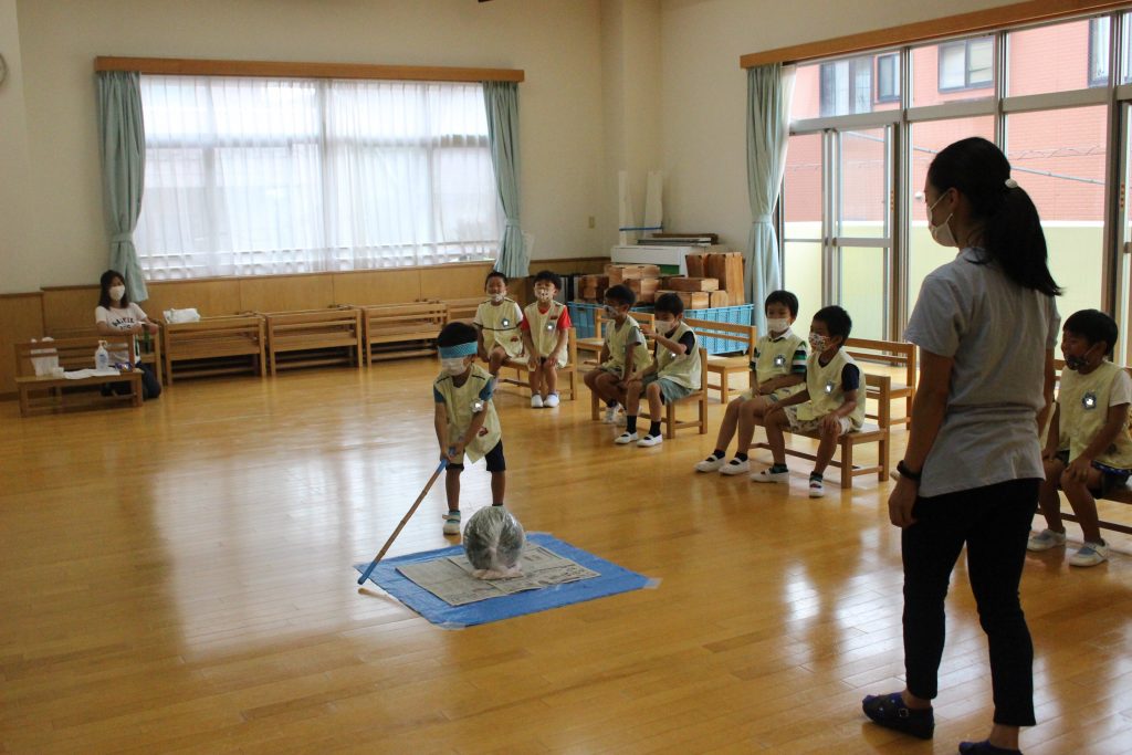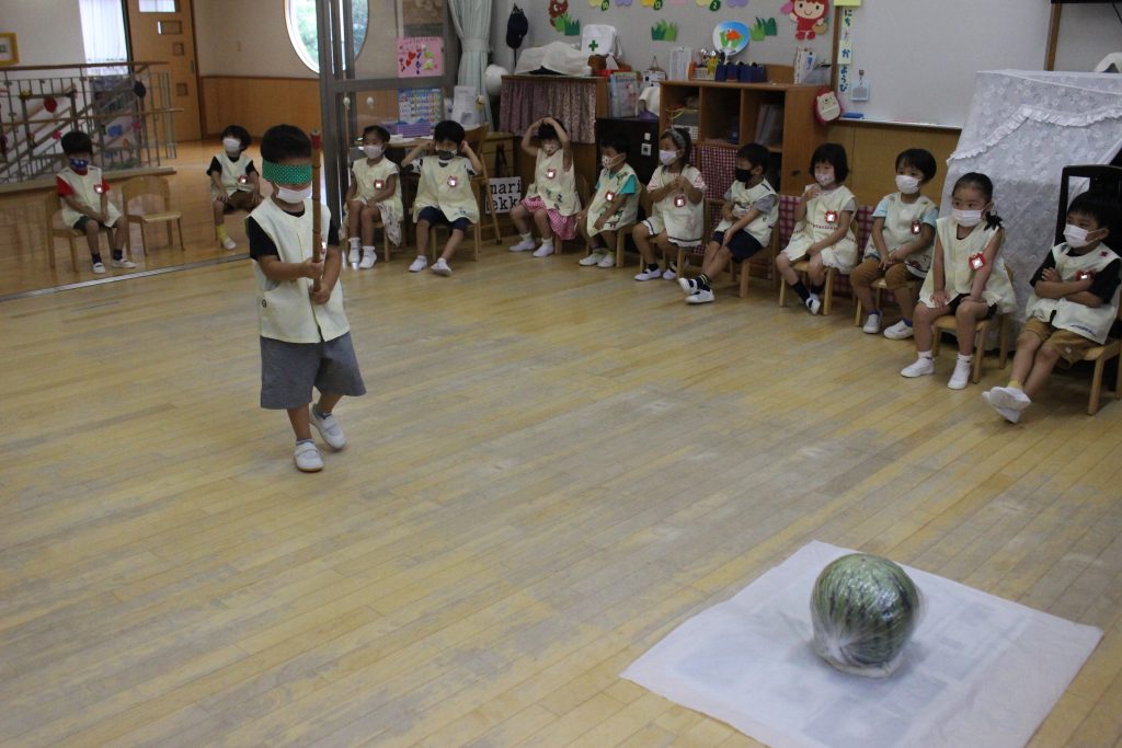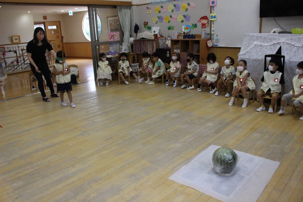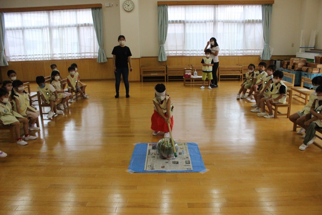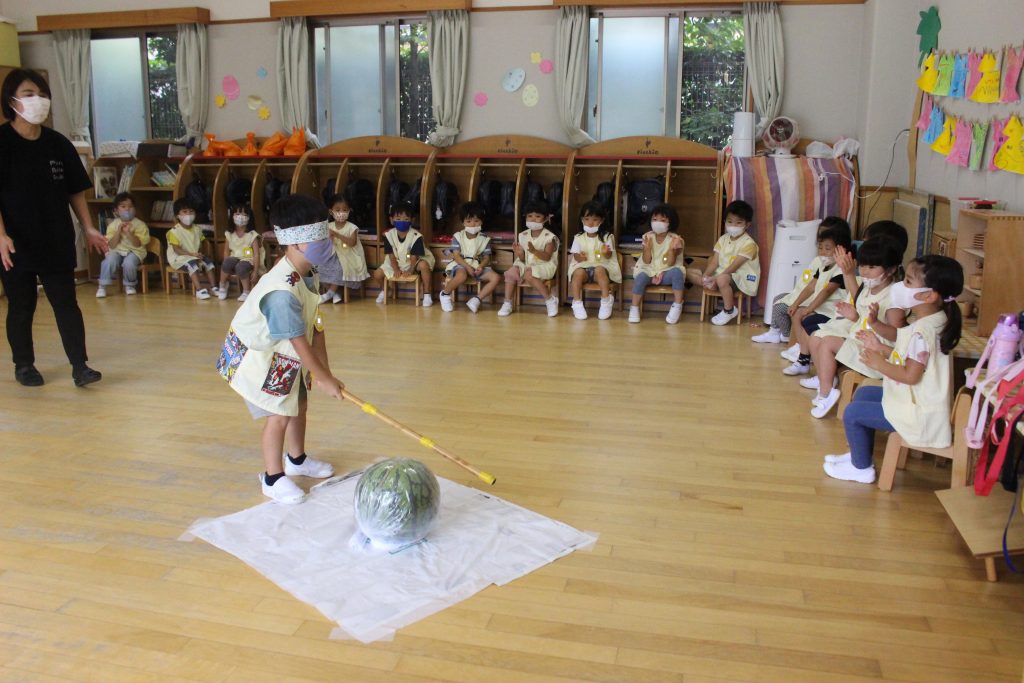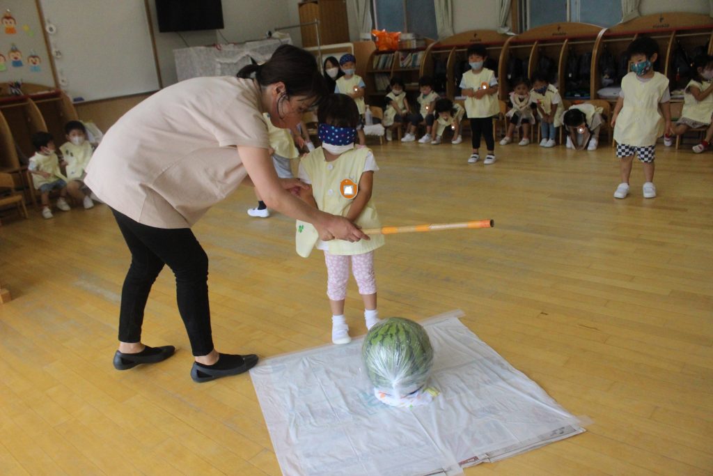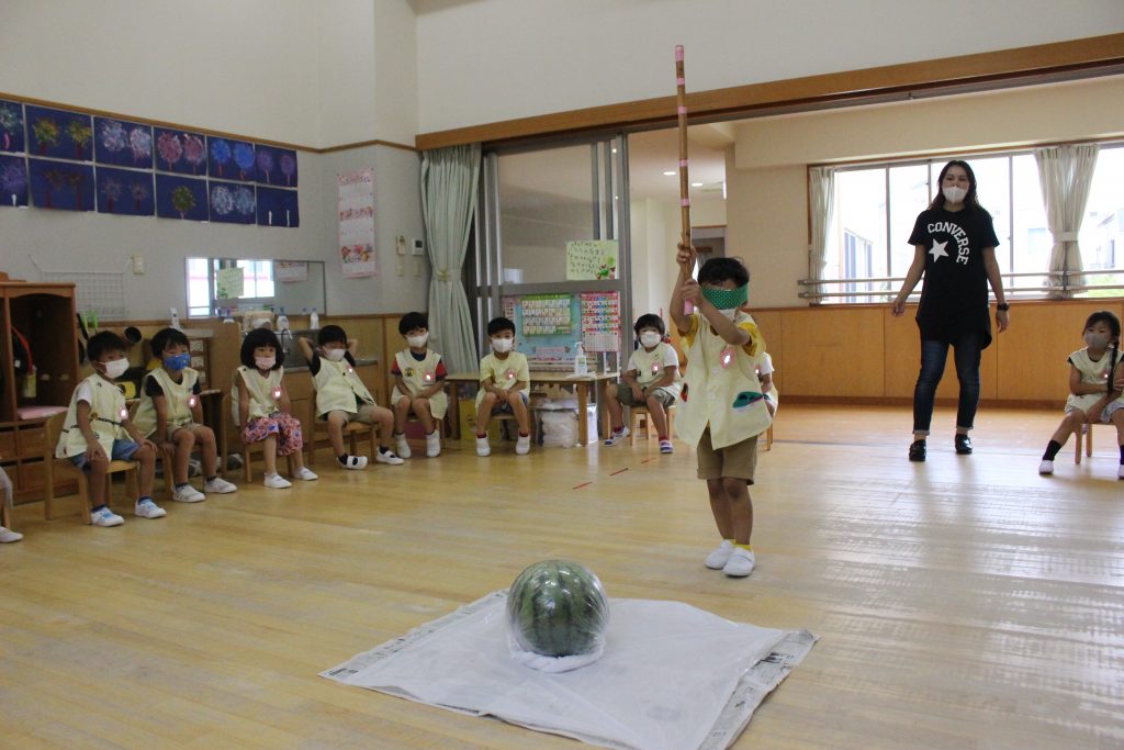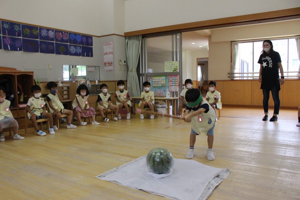 夏期保育がこの日から3日間ありました。7月中旬の終業式から約1か月が経ち、長い休み明けで、少し緊張したり、不安な表情で登園する子もいました。朝の身支度を思い出しながら行ったり、クラスの友だちや先生との時間を過ごしていくうちに、本来の姿を取り戻していくような一日でした。主な活動内容としては、全学年がスイカ割りをしたり、水あそびやシャボン玉あそびを楽しむ学年もありました。