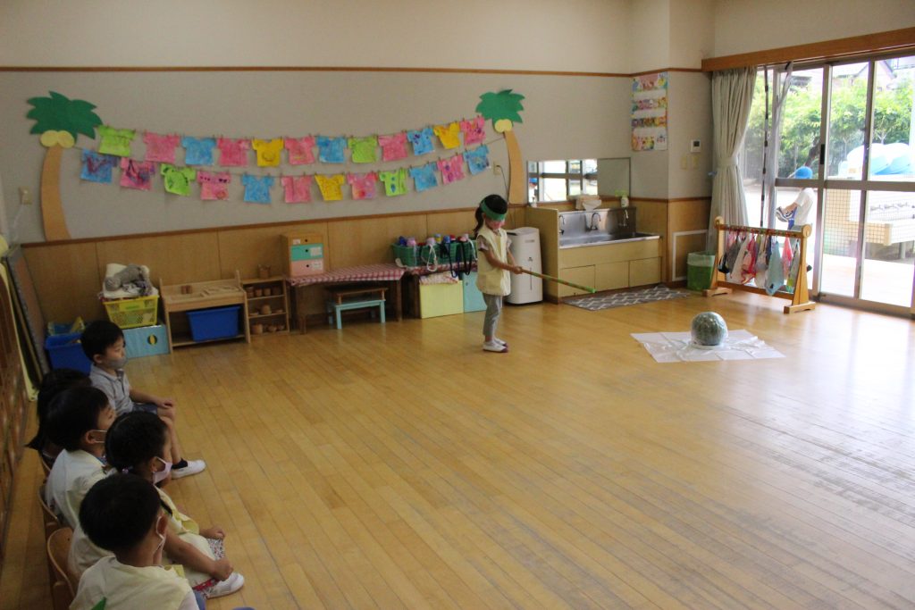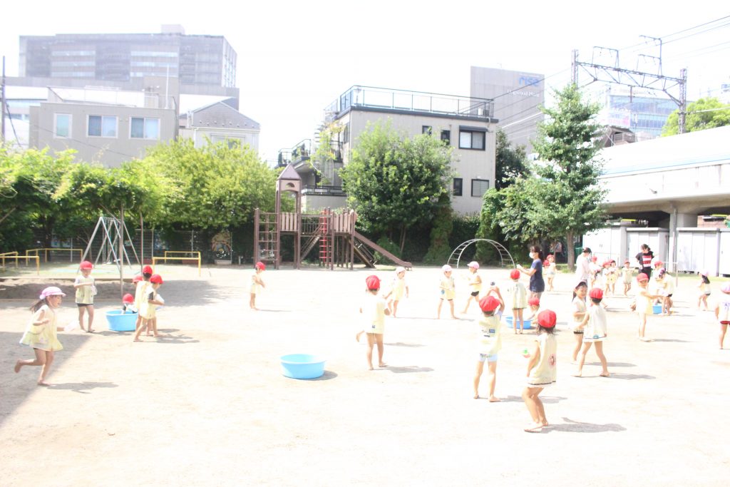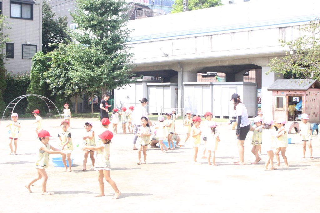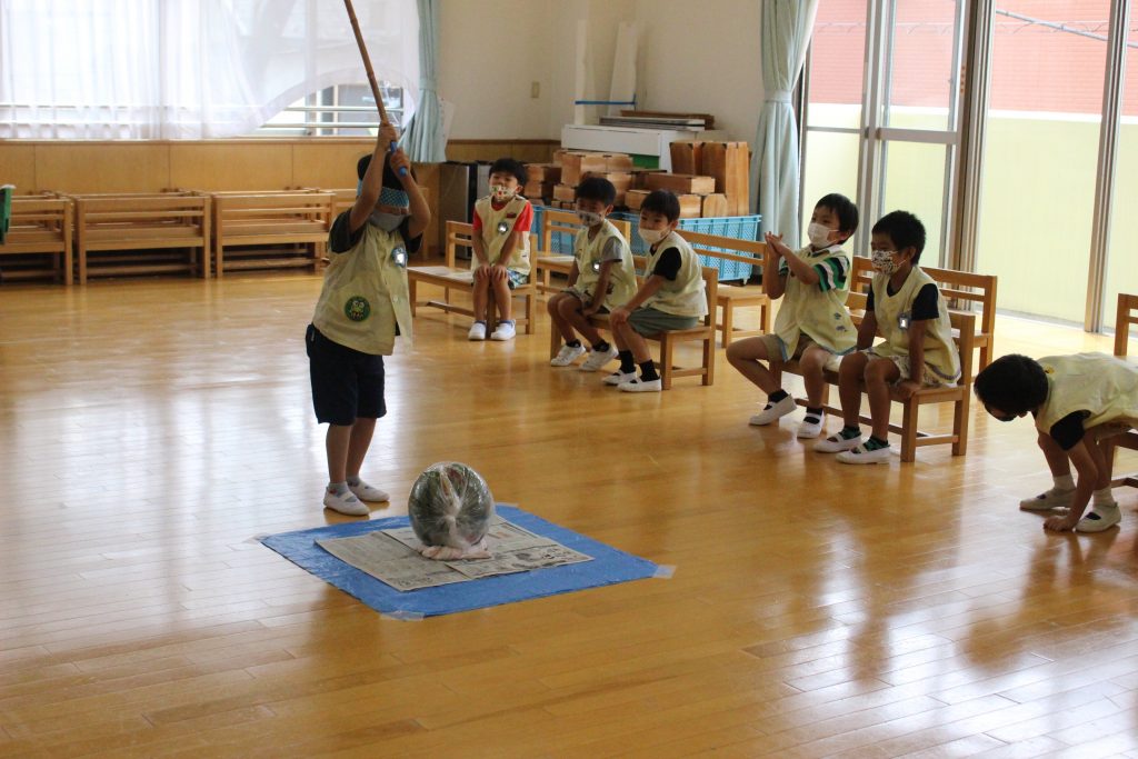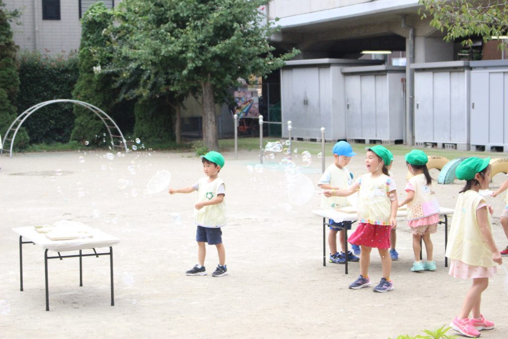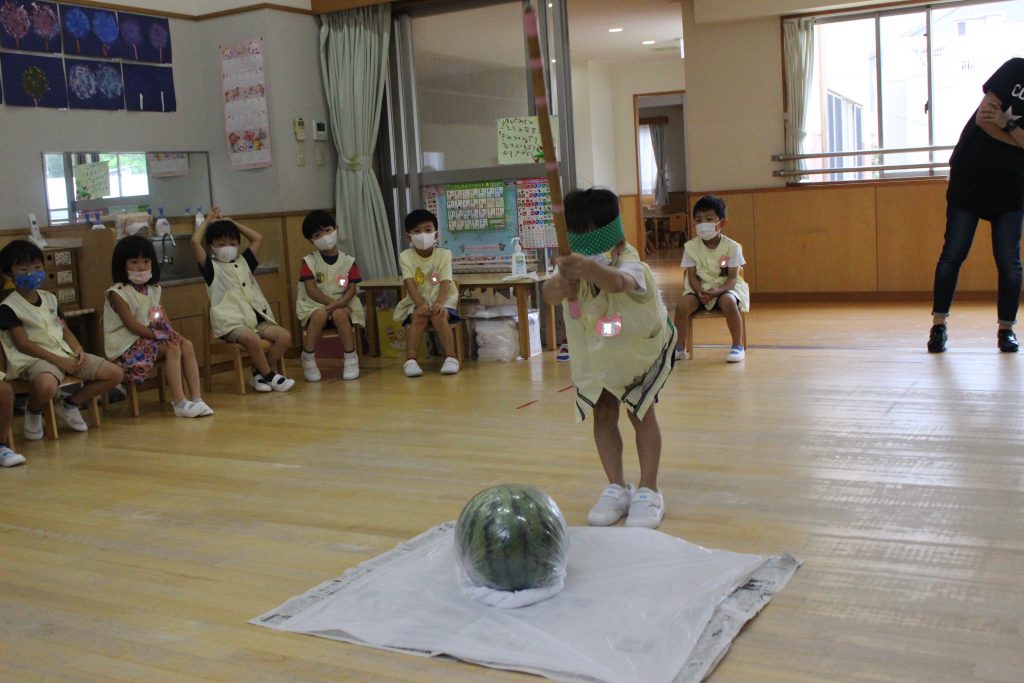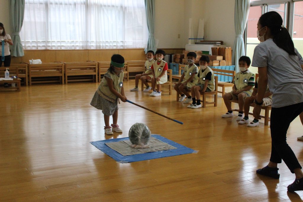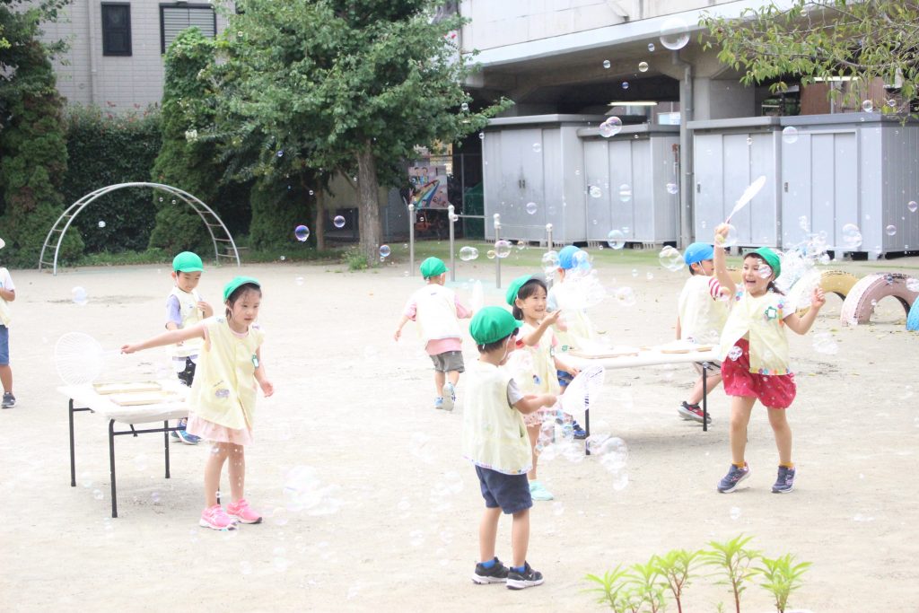 夏期保育がこの日から3日間ありました。7月中旬の終業式から約1か月が経ち、長い休み明けで、少し緊張したり、不安な表情で登園する子もいました。朝の身支度を思い出しながら行ったり、クラスの友だちや先生との時間を過ごしていくうちに、本来の姿を取り戻していくような一日でした。主な活動内容としては、全学年がスイカ割りをしたり、水あそびやシャボン玉あそびを楽しむ学年もありました。