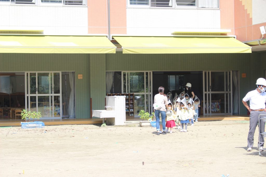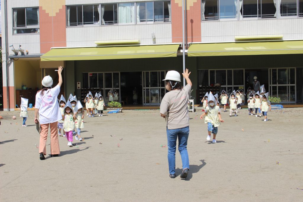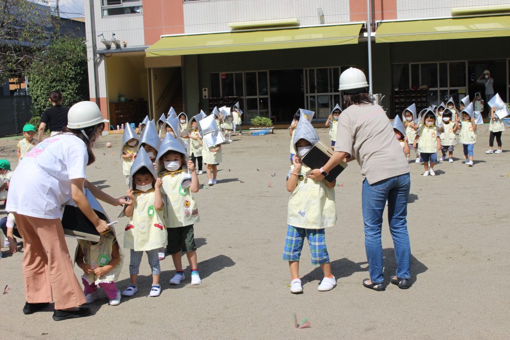 9月1日は防災の日。始業式に園長先生から話をしていただきましたが、大きな災害はいつ起きるかわかりません。その際に動揺したり、不安を感じて動けなくなったり、泣き出してしまう子もいるかもしれません。そうなることを少しでも防ぎ、速やかに避難できるようこの日に避難訓練を実施しました。今月は地震の想定。園内放送が入ったら、机などの下に隠れて身体を守り、机の脚をぎゅっとおさえたり、防災頭巾をかぶり、担任の誘導のもと避難場所まで移動するといった一連の動きを確認しました。1学期の訓練から、避難時の約束である「おさない、かけない、しゃべらない、もどらない」の頭文字をとった「お・か・し・も」を思い出して逃げるように伝えています。今回は慌てて小走りで避難したり、少し話し声が聞こえたり、防災頭巾をかぶることに時間がかかったりする様子が見られていたので、各クラスで事後指導をしました。