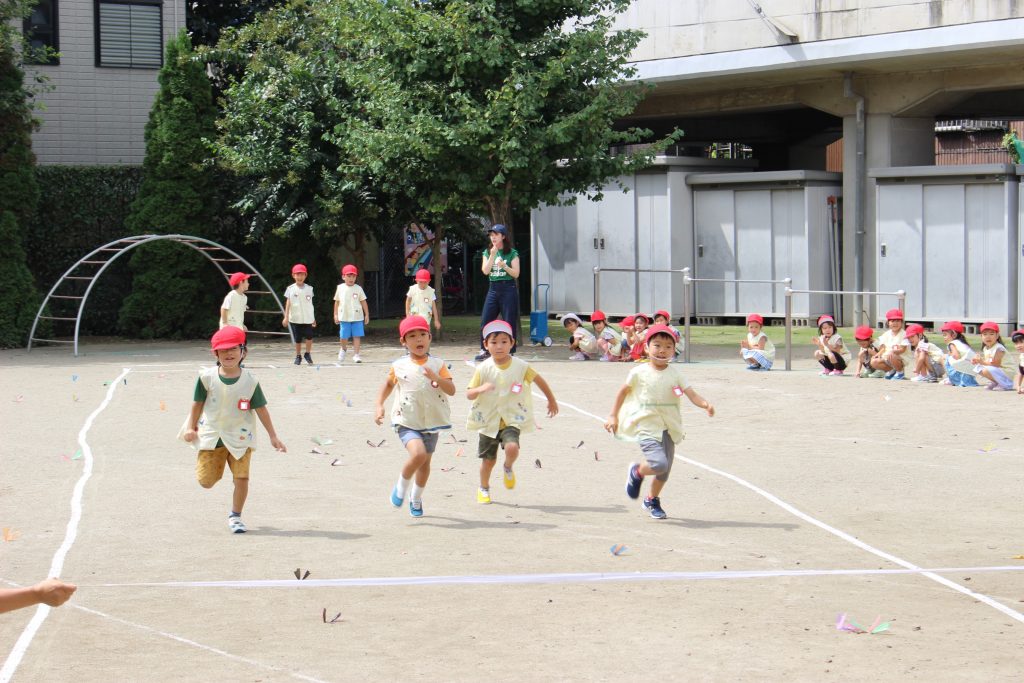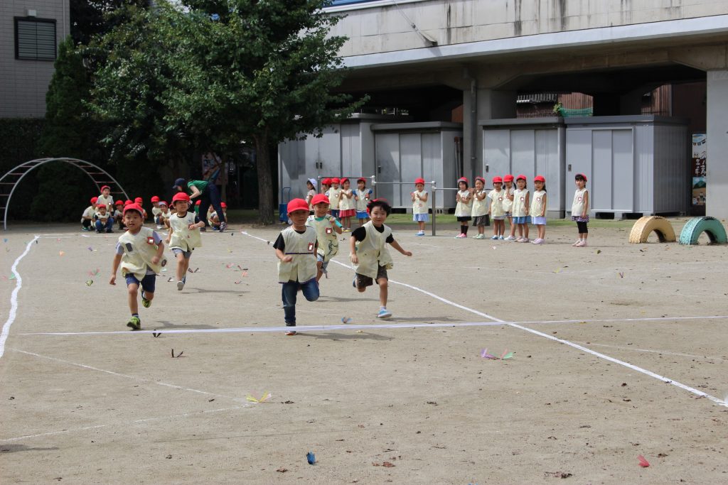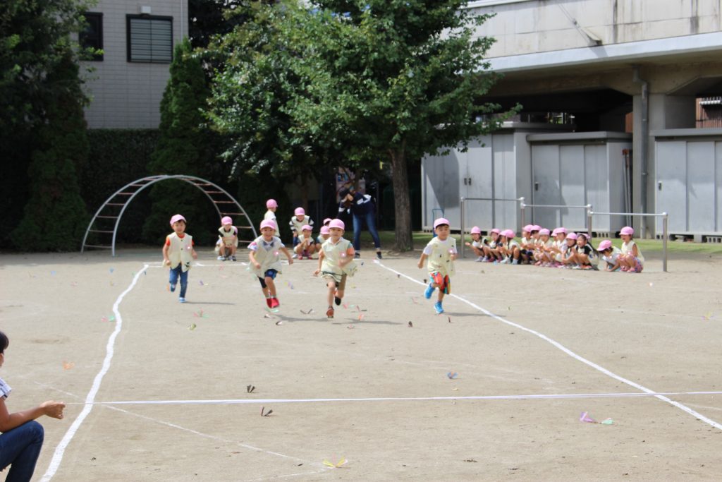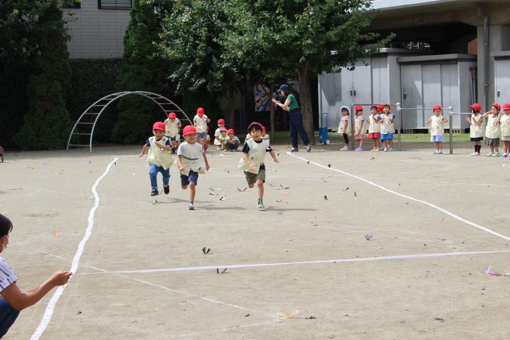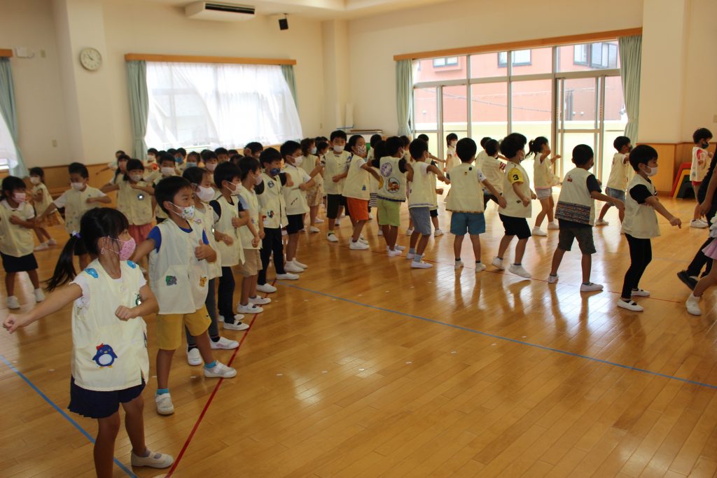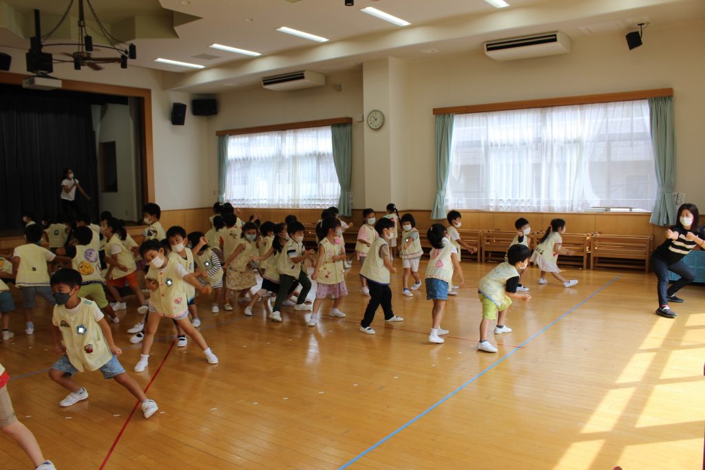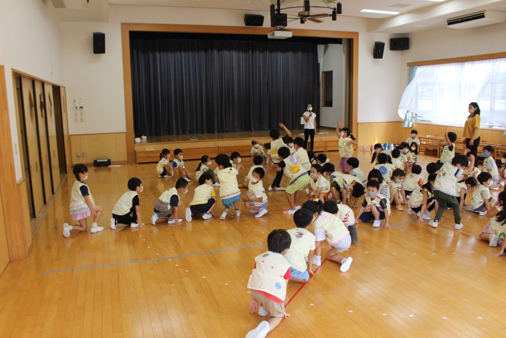 その後は、年中組が園庭でかけっこ、年長組は遊戯室で遊戯。運動会活動も日増しに活発になってきました。年中組のかけっこは、まっすぐゴールまで走りきることを教わっていました。年長組は、遊戯の振り付けをほとんどの子が大体を憶えている様子。身体を大きく動かし、隊形移動も友だちと協力しながらと取り組む姿にやる気が伝わってきました。