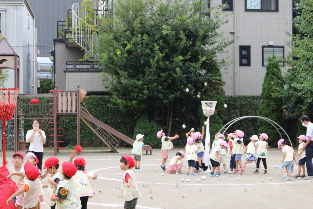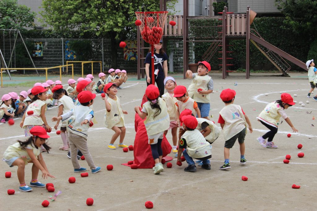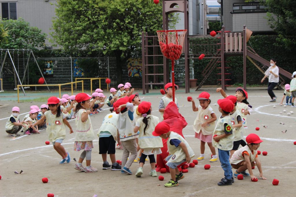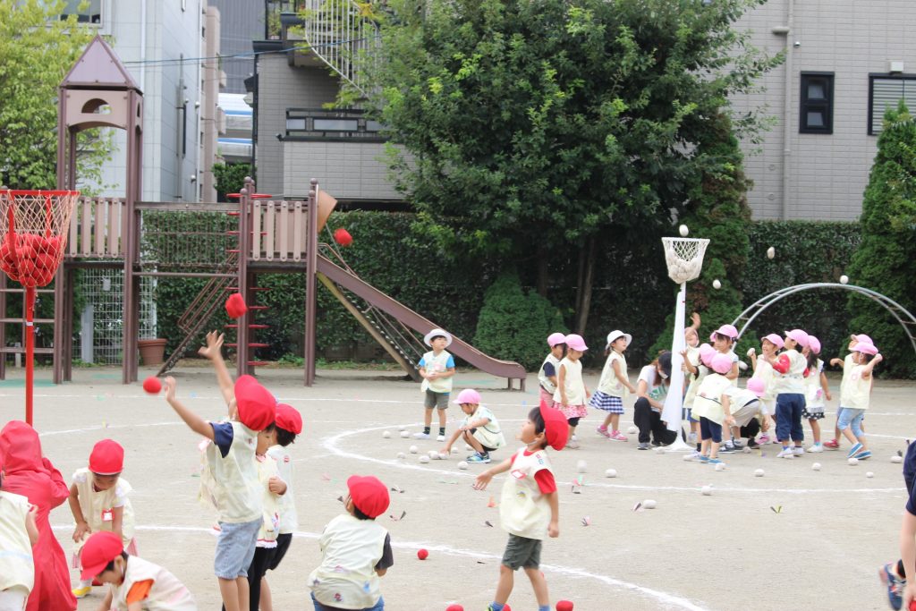 玉入れを年中組が園庭で行いました。前回は遊戯室を使って、クラス毎に分れて玉入れの仕方やルールを担任から教わり、この日は2回目。玉入れで必要な投げる動作は、経験の有無で左右されるものになります。今年の年中組の子ども達はどのような姿だろうかと活動の様子をしばらく見ていました。どちらのクラスも時間内に拾って投げての動作を繰り返すことにおもしろさを感じ、かごに向かって入れようとする意志が見られていました。前日になかなか玉が入らないと担任から聞いていましたが、予想を覆す41個ずつの引き分けとなり、子ども達はどちらのクラスも喜んでいました。