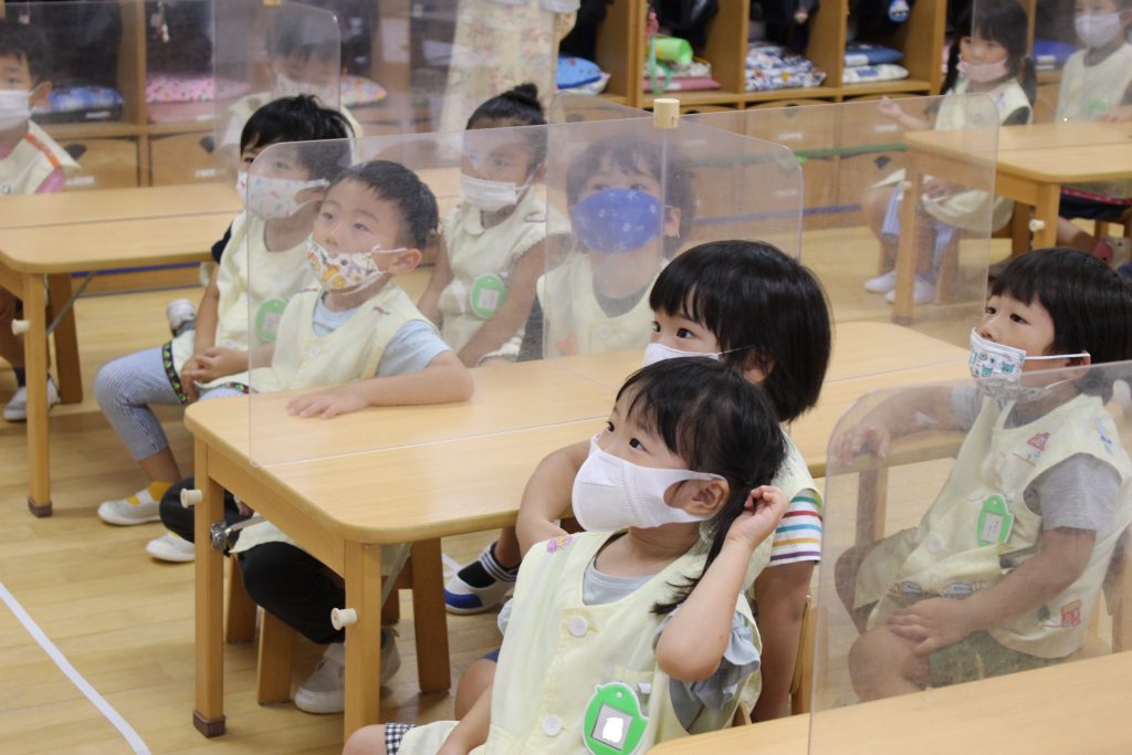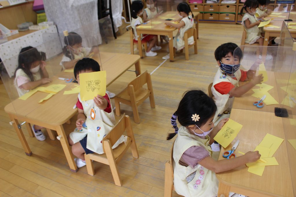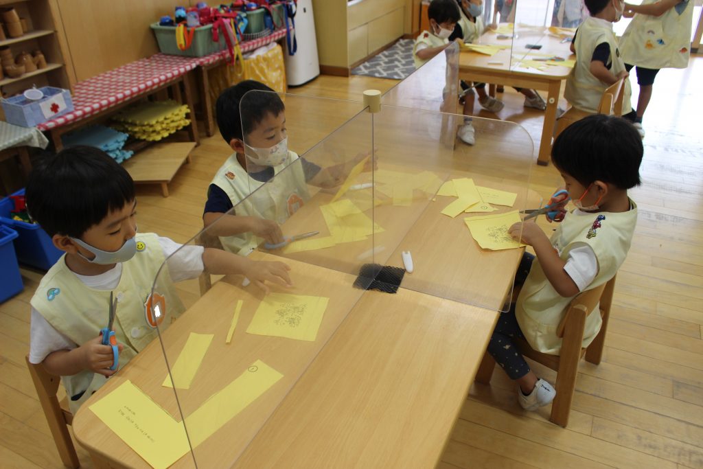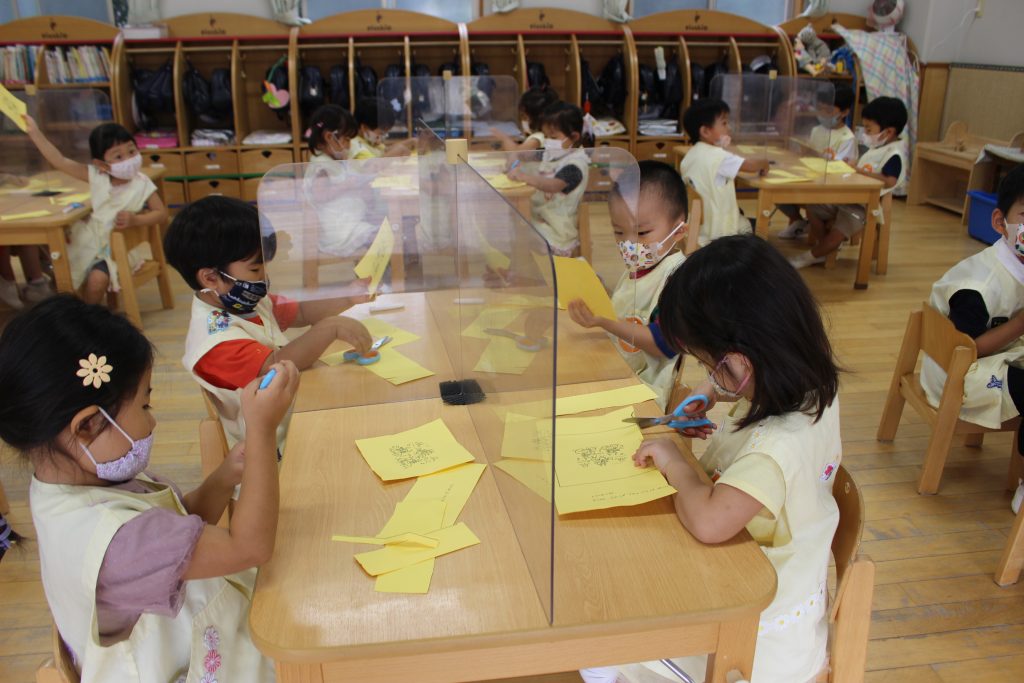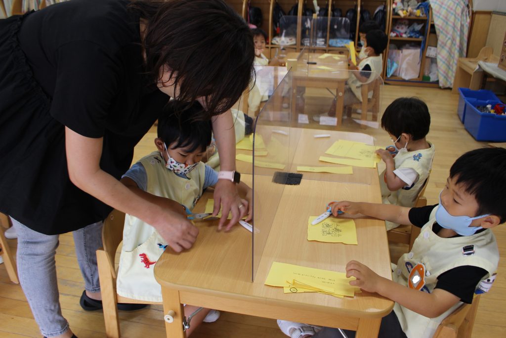 年少組は、菓子皿作りを今月から始めました。コロナ禍になる前は、毎月の誕生会の日にお菓子を園内で食べ、そのお菓子を入れるためのお皿を事前に自分で作るという本園の伝統的な制作活動がありました。昨年から飛沫感染防止の観点から、お菓子は持ち帰って各ご家庭で食べてもらうことに変わりました。しかし、お菓子は食べないけど、菓子皿制作は子ども達に経験してほしい活動内容であると考え、どの学年も行っています。学年や時期によって、使う道具や出来上がりの形、難易度などがそれぞれ異なります。この日に初めて経験する年少組は、四角い平面のお皿。黒い線の上をよく見ながら、はさみで切る活動です。1学期からはさみを使った制作はしていましたが、長く続く黒い線を切ることは初めてです。まずは、はさみの使い方を思い出し、持っていないほうの手でしっかりと紙を持ちながら線上を切り進むということへの挑戦でした。まだ、はさみの持ち方が身についていなかったり、線ではないところを切ったりと、個別で担任から指導してもらう子もいました。菓子皿制作を積み重ねていくことで、道具の扱いに慣れ、指先をうまくコントロールして動かしたり、最後まで自分で作り上げる達成感を感じたり、集団で話を聞く姿勢(態度、理解や集中力など)を身につけるなどたくさんのことを学んでいけるよう計画や指導をしていきます。