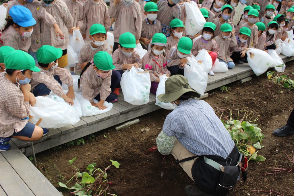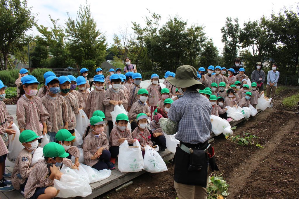 年長組が二子玉川ライズの屋上菜園へサツマイモと落花生の収穫体験に行ってきました。1学期に自分たちで植えたサツマイモの苗が大きく生長し、この日にいよいよ芋掘りです。初めに今までお世話をしてくださっていた箱根植木の方に挨拶をし、早速掘り方を教えていただきました。