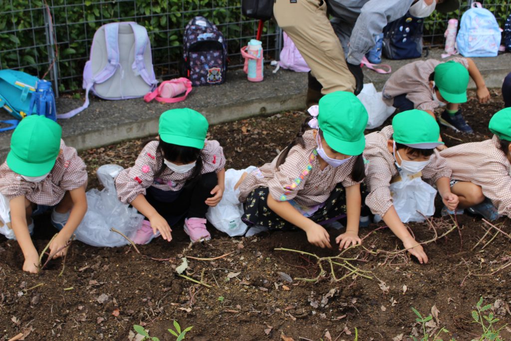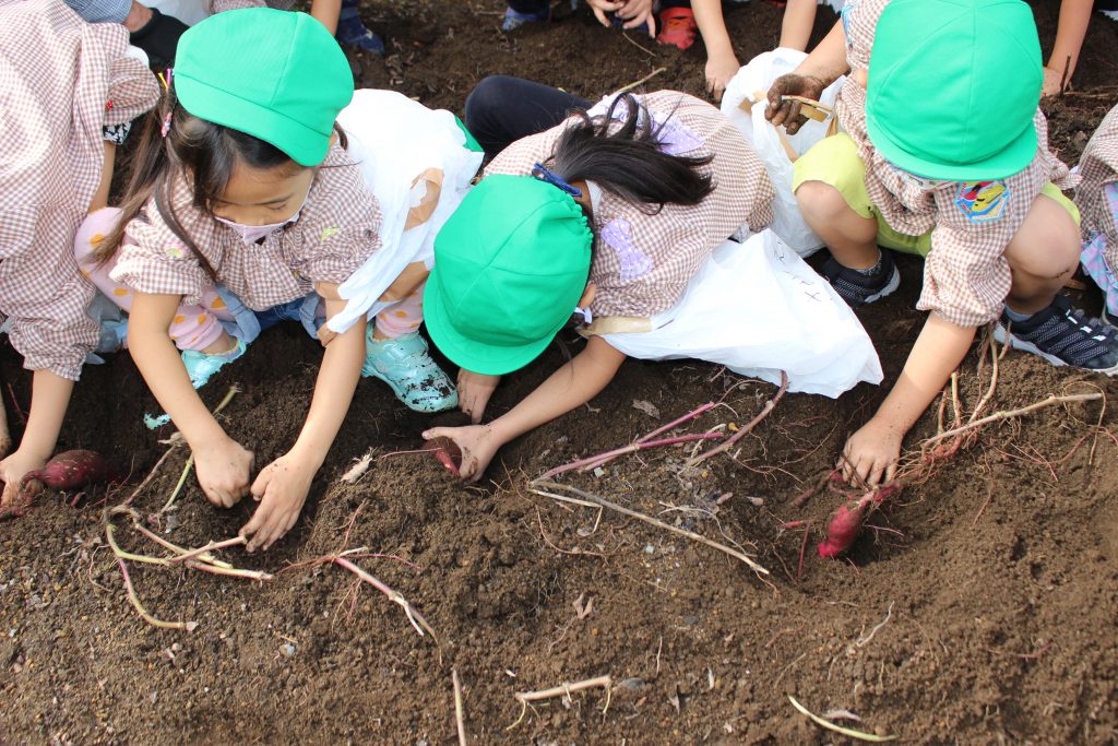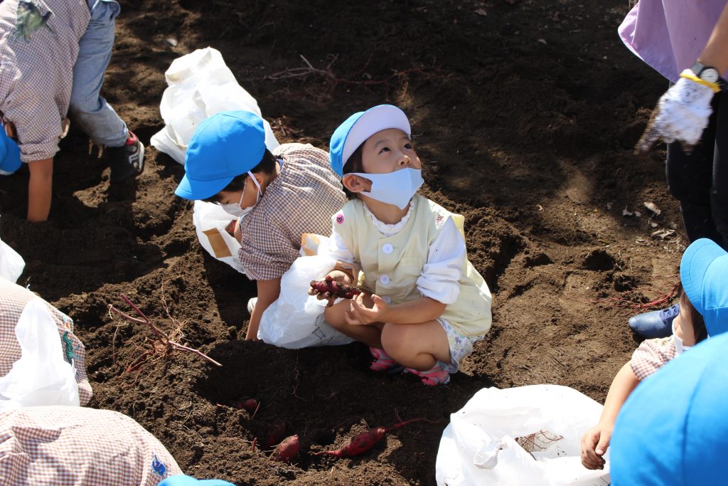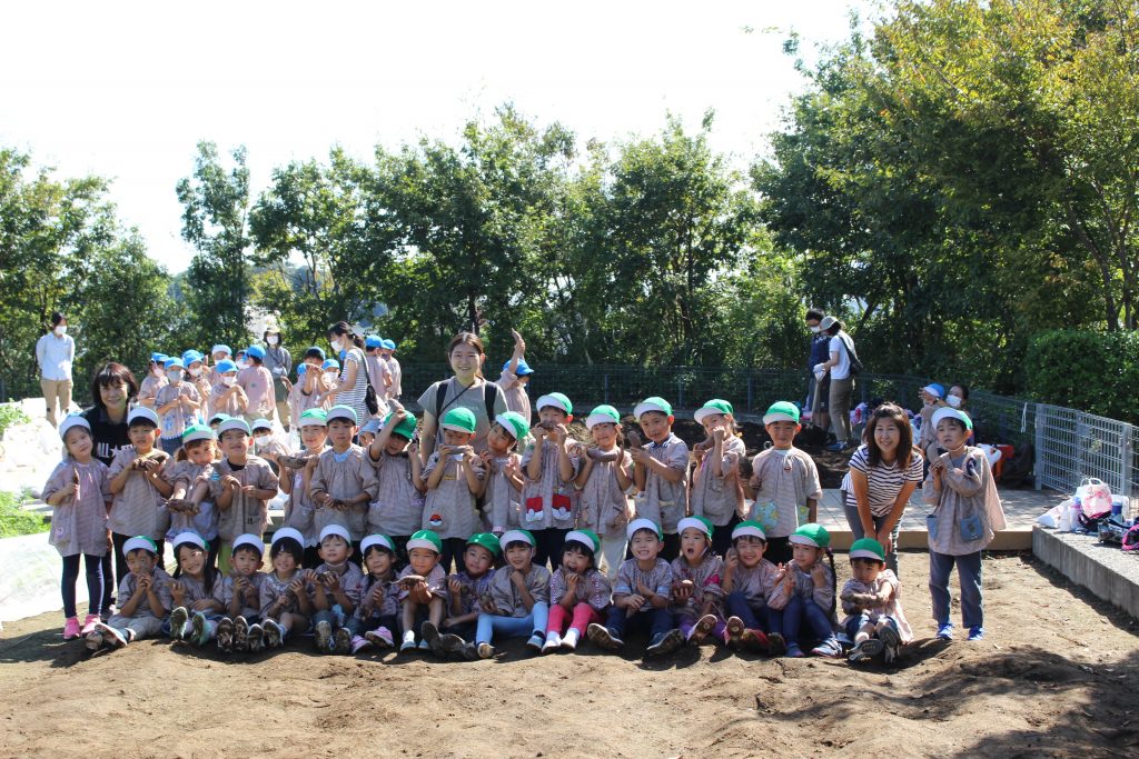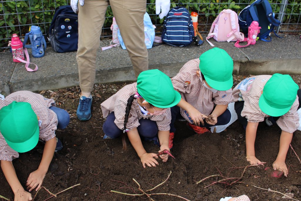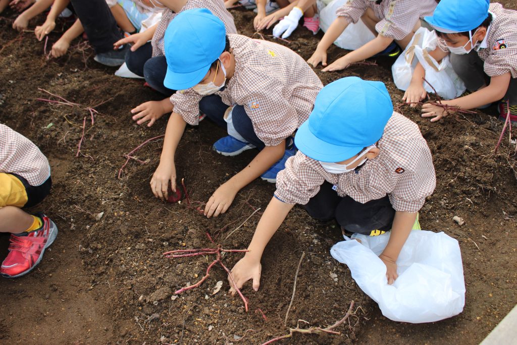 今年は、前日の雨で土が湿っており、硬くなった土の中にあるサツマイモがぬけません。それでも、あきらめずに掘り進め、収穫することができました。掘ったサツマイモの大きさや量に差がありましたが、それも自然のものならではです。帰る前にはサツマイモを手に持ってクラスで写真撮影もしました。
