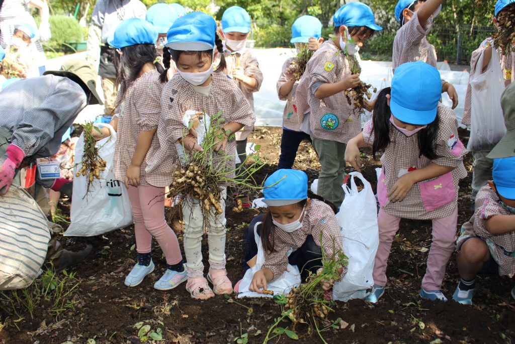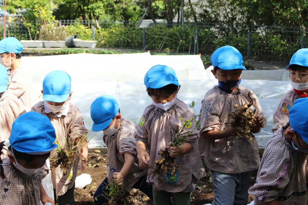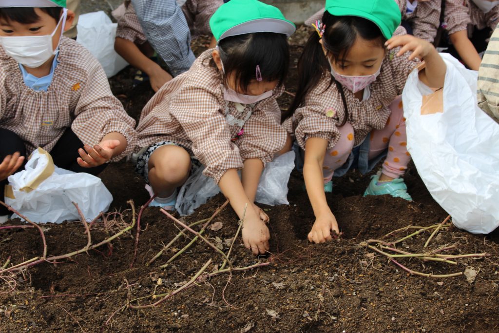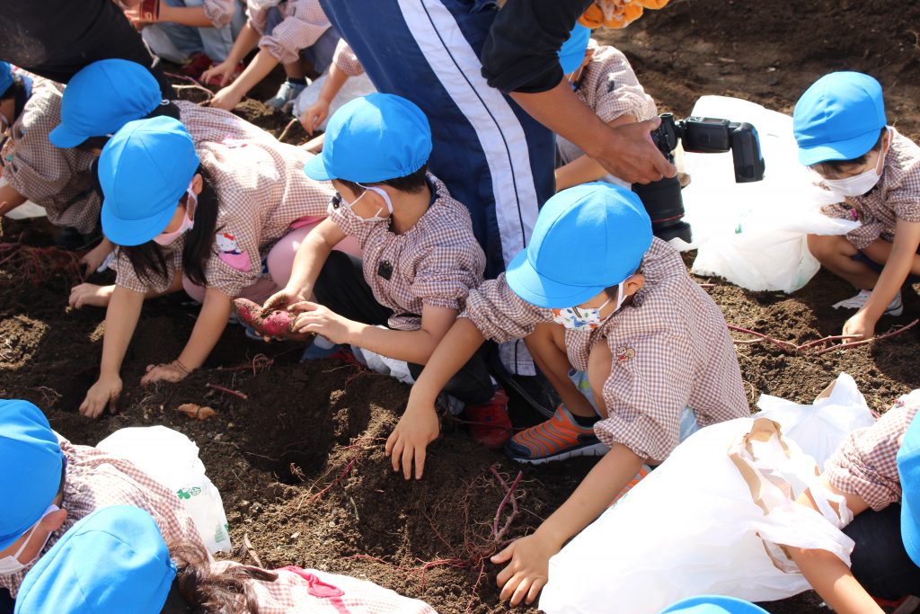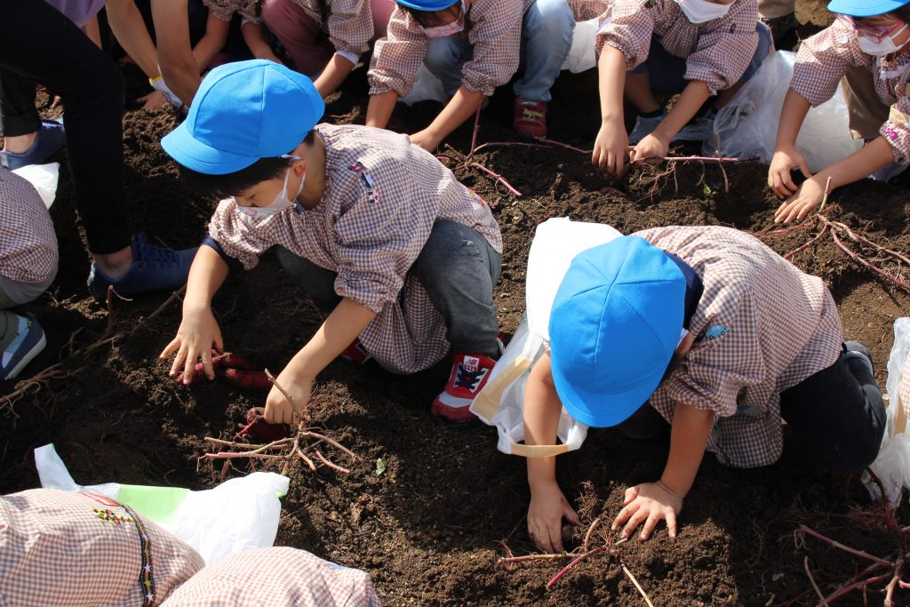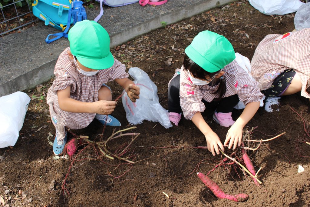 今年は、前日の雨で土が湿っており、硬くなった土の中にあるサツマイモがぬけません。それでも、あきらめずに掘り進め、収穫することができました。掘ったサツマイモの大きさや量に差がありましたが、それも自然のものならではです。帰る前にはサツマイモを手に持ってクラスで写真撮影もしました。