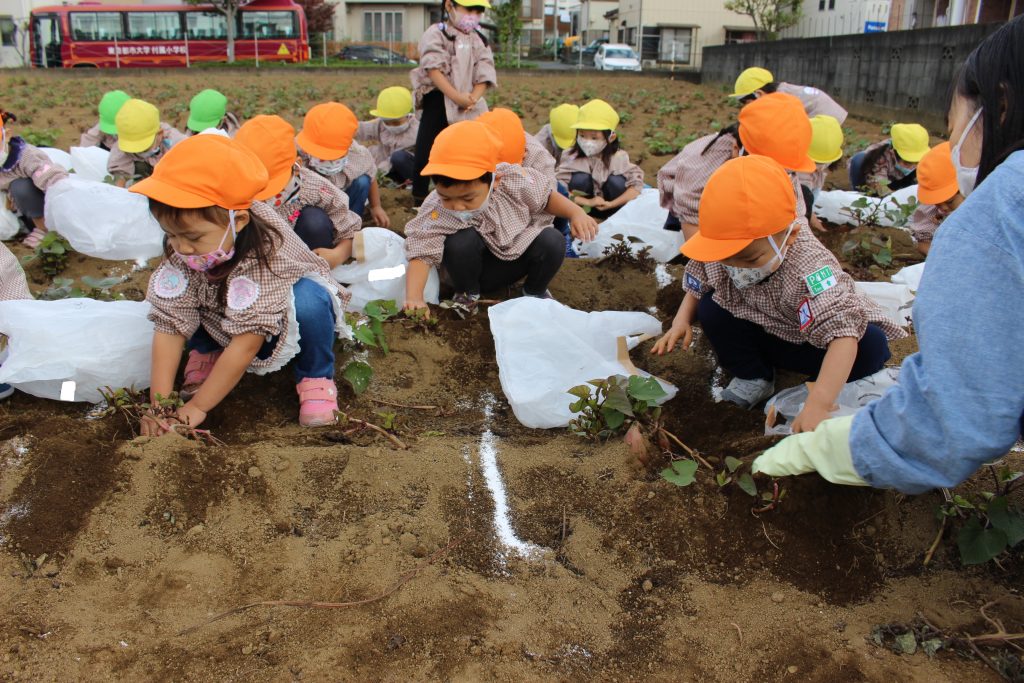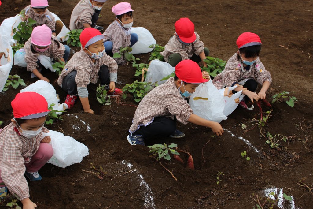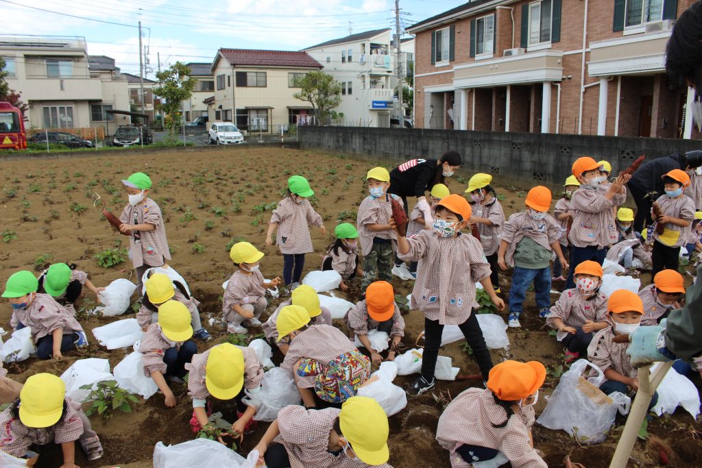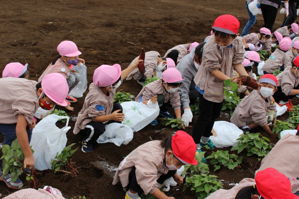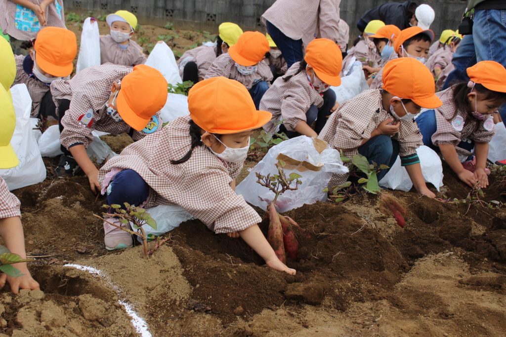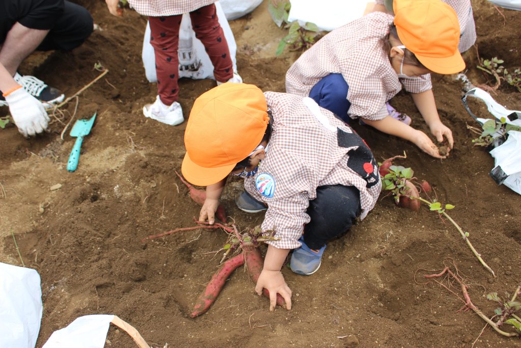 帰りのバスの中で、「持って帰ったら何の料理を作ってもらう?」と年少組の子ども達に聞くと、「私はてんぷらが好き。」「ケーキにしたらどうかな?」「スイートポテト!」など次々に返事がもどってきました。『ベニアズマ』という関東を中心に東日本で多く栽培される品種を掘りました。ホクホクした食感で甘味が強いのが特徴だそうです。子ども達が自分で収穫した喜びもつまったサツマイモをご家庭で満喫してくださいね。