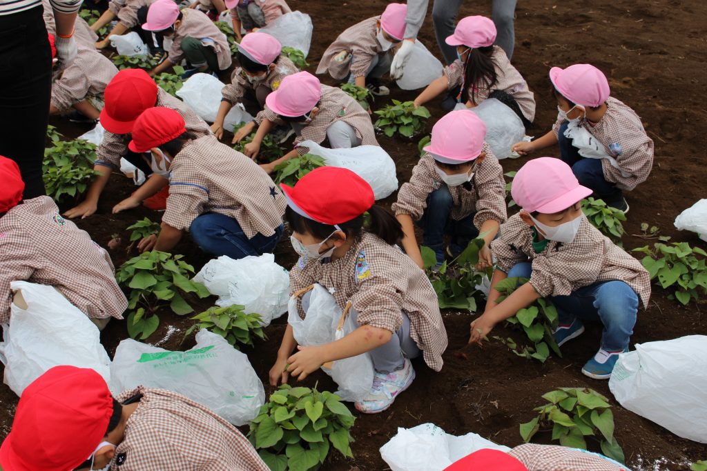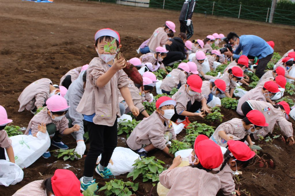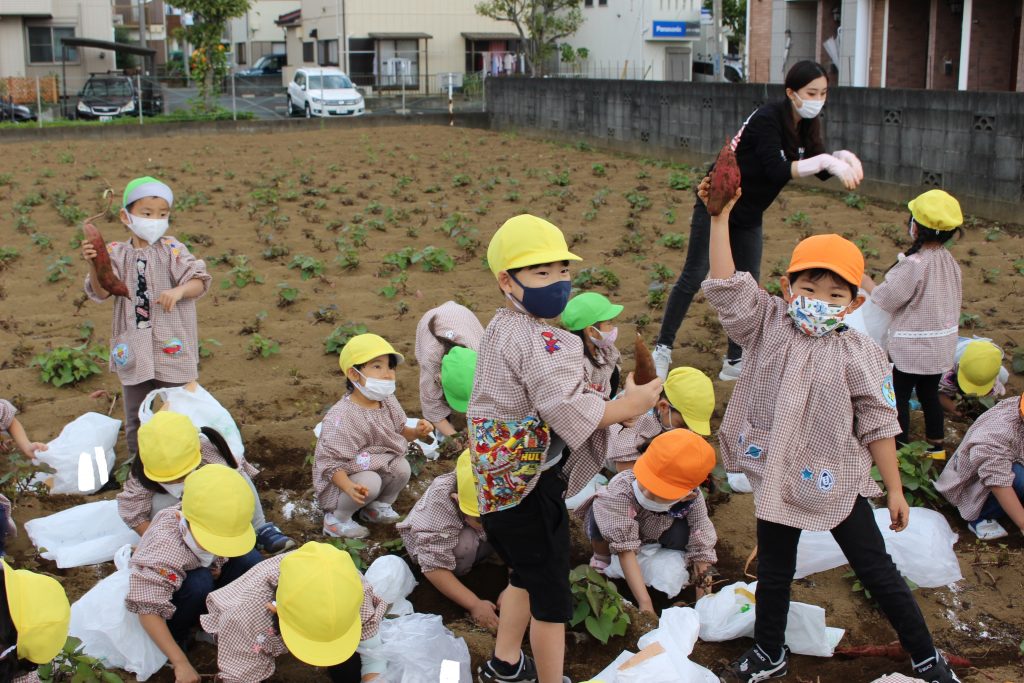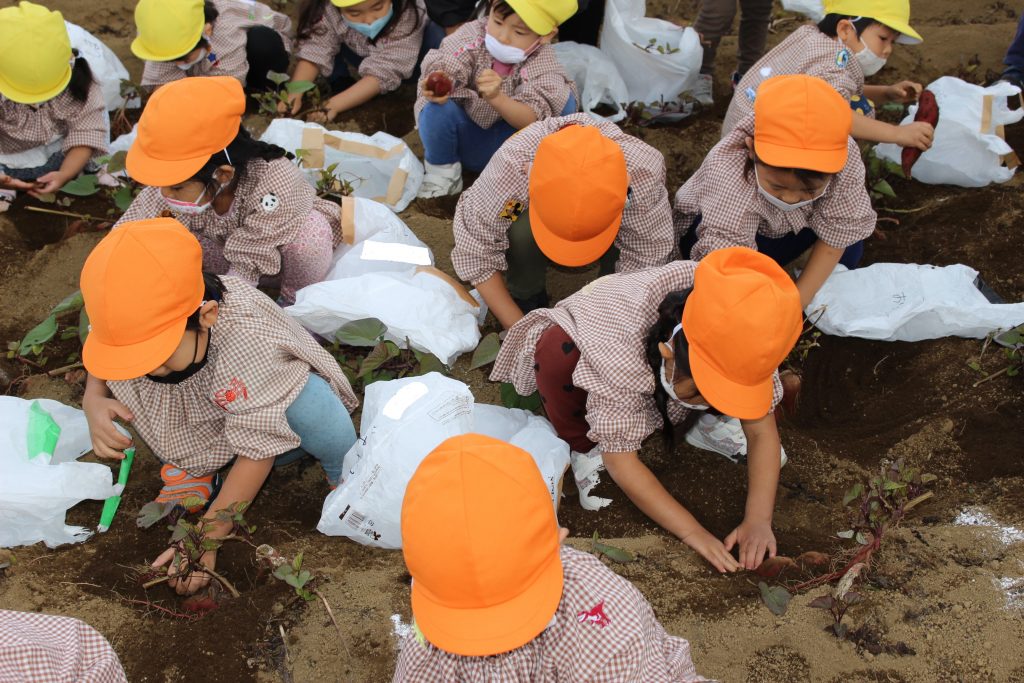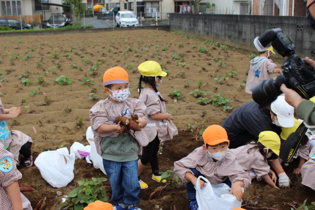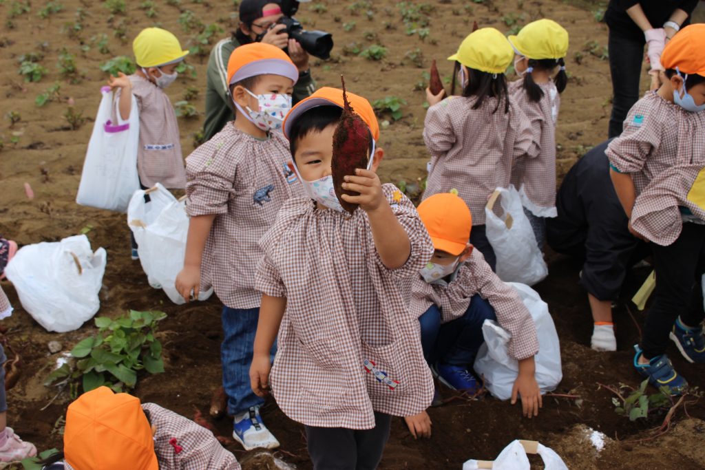 帰りのバスの中で、「持って帰ったら何の料理を作ってもらう?」と年少組の子ども達に聞くと、「私はてんぷらが好き。」「ケーキにしたらどうかな?」「スイートポテト!」など次々に返事がもどってきました。『ベニアズマ』という関東を中心に東日本で多く栽培される品種を掘りました。ホクホクした食感で甘味が強いのが特徴だそうです。子ども達が自分で収穫した喜びもつまったサツマイモをご家庭で満喫してくださいね。