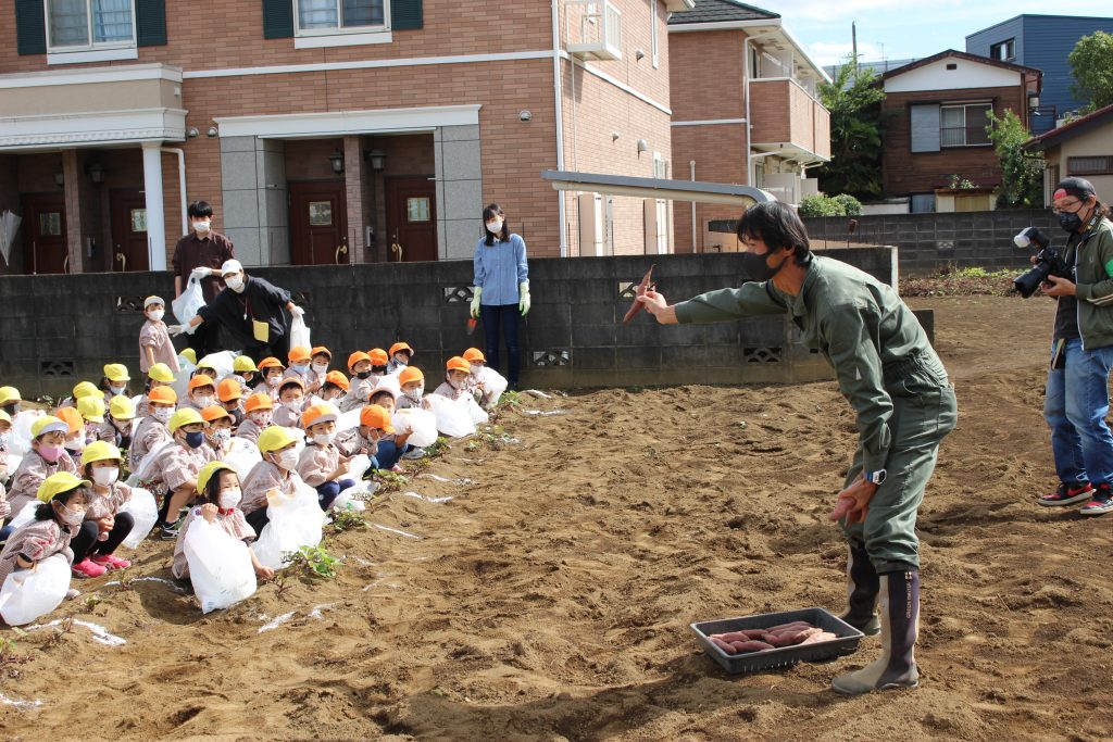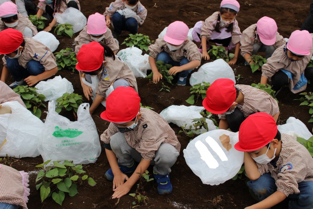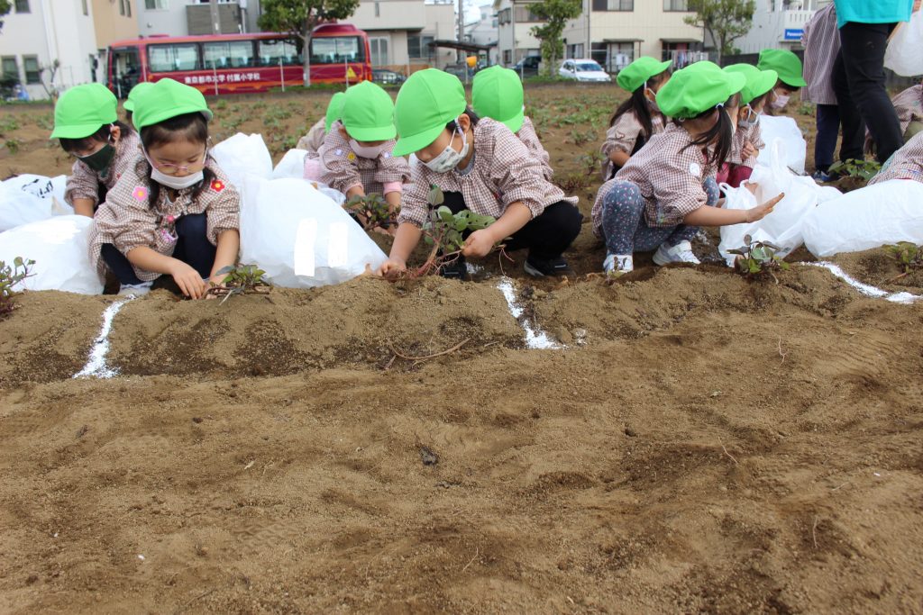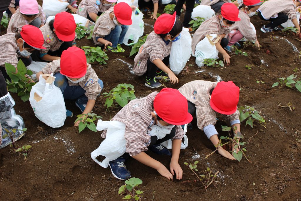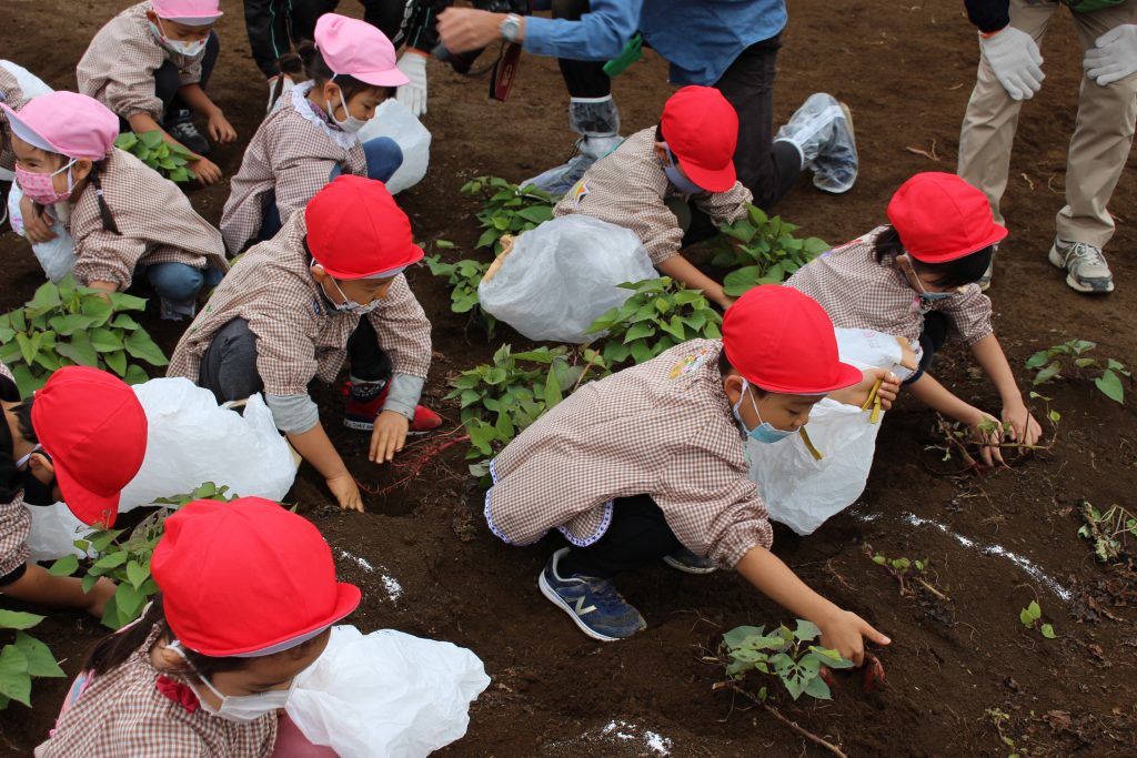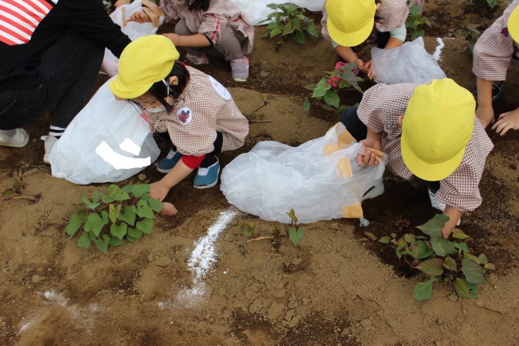帰りのバスの中で、「持って帰ったら何の料理を作ってもらう?」と年少組の子ども達に聞くと、「私はてんぷらが好き。」「ケーキにしたらどうかな?」「スイートポテト!」など次々に返事がもどってきました。『ベニアズマ』という関東を中心に東日本で多く栽培される品種を掘りました。ホクホクした食感で甘味が強いのが特徴だそうです。子ども達が自分で収穫した喜びもつまったサツマイモをご家庭で満喫してくださいね。