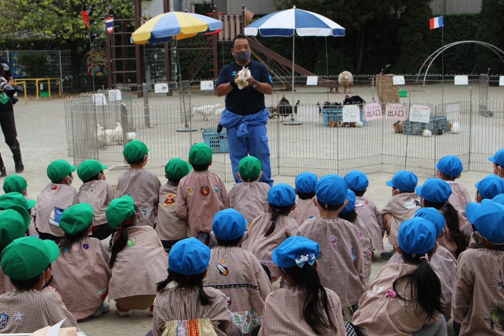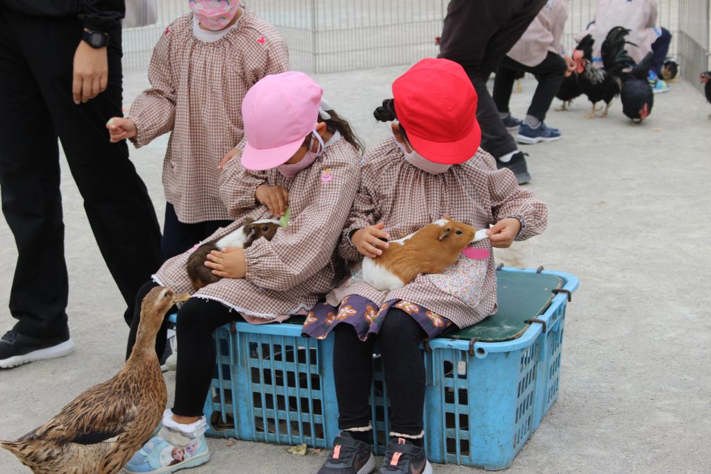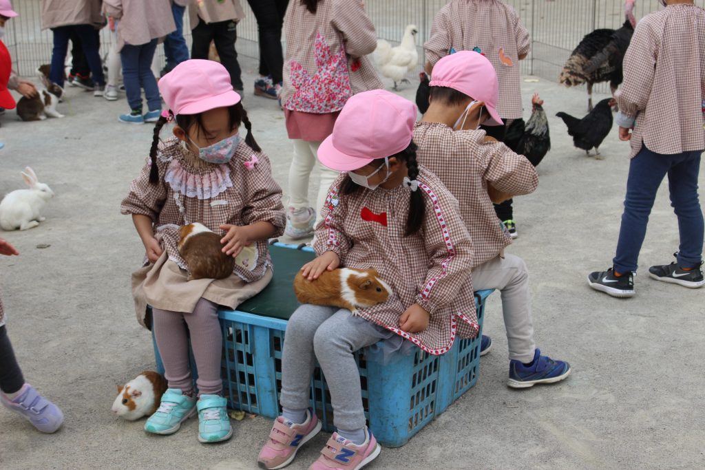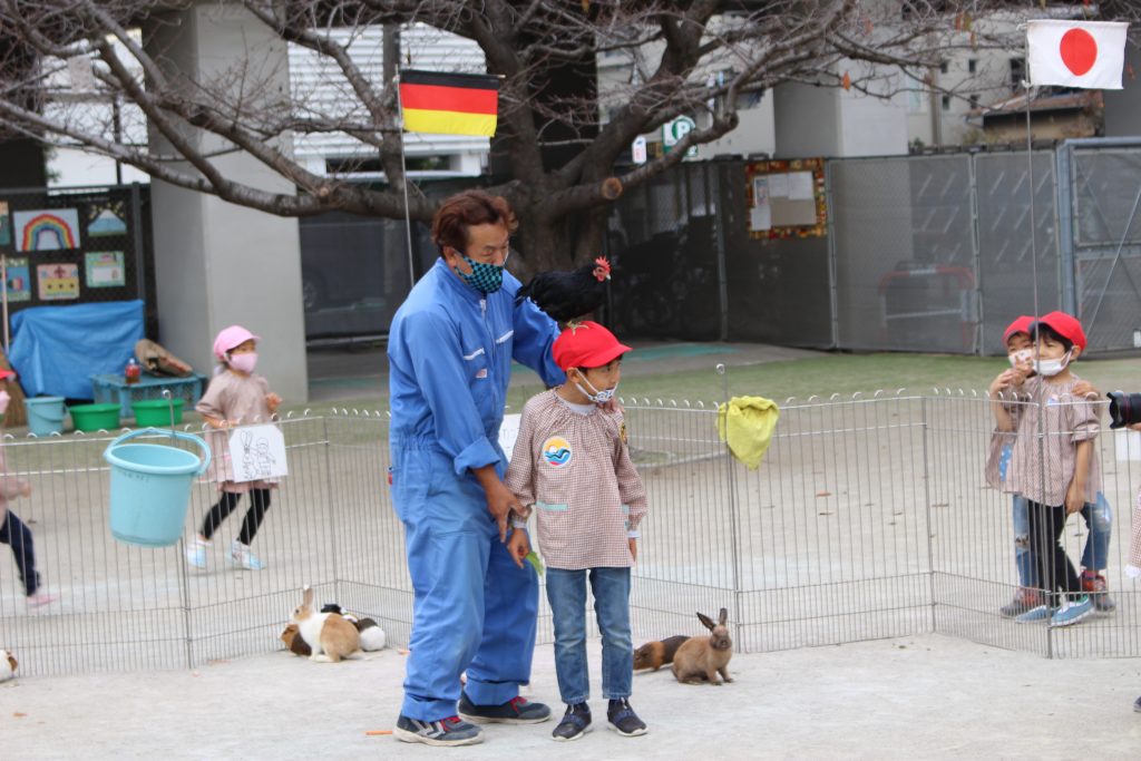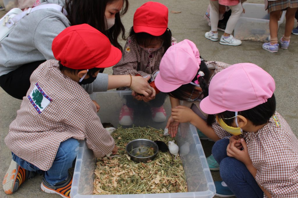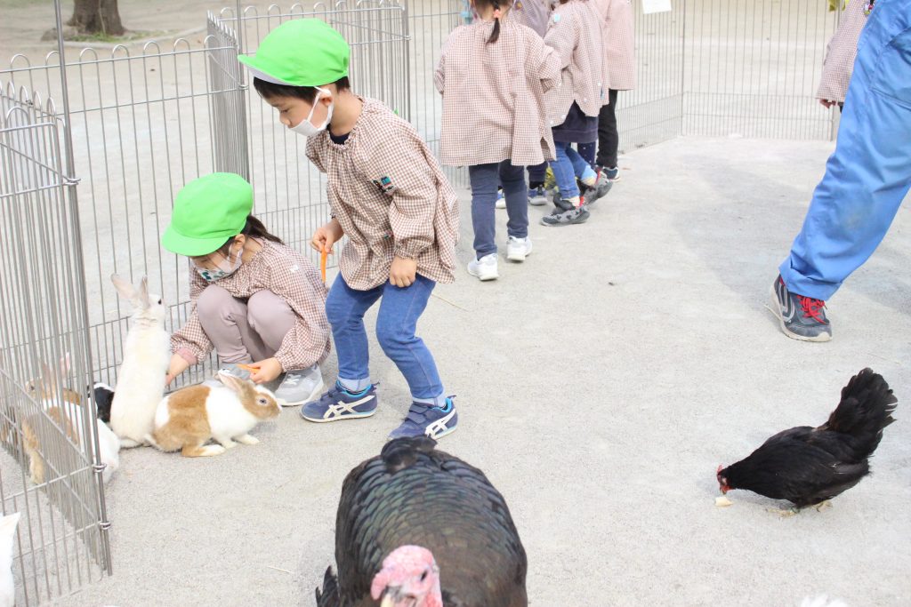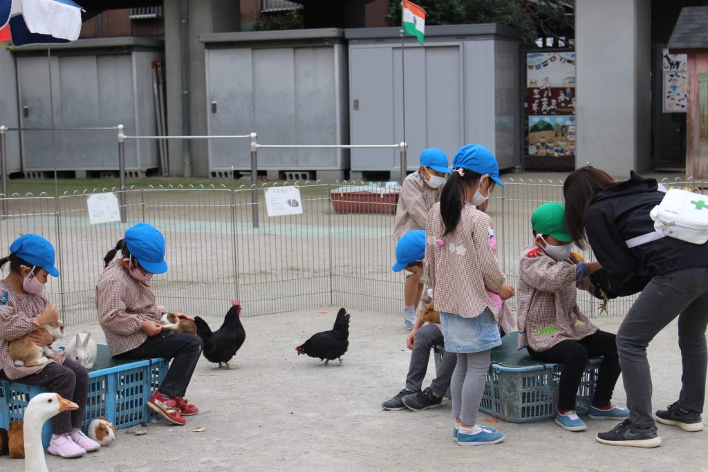 さまざまな動物とかかわる中で、動物に親しみを感じ、優しく思いやりをもって触れたり、関心を広げる体験ができたようです。「ふわふわしてる!」「小さくてかわいい。」「少し怖い!」「優しい目をしているよ。」など動物に触れた時の感触や思ったことを友だちや担任たちと共感し合う様子が印象的でした。天気が少し心配でもありましたが、本園の特色の一つである『本物に触れる教育』の行事として実施することができ、五感を使い、一人ひとりの感性がまた少し豊かになったのではないかと思います。