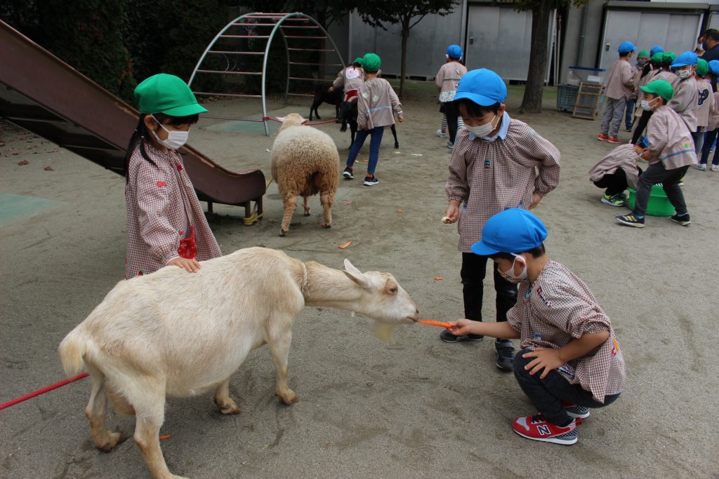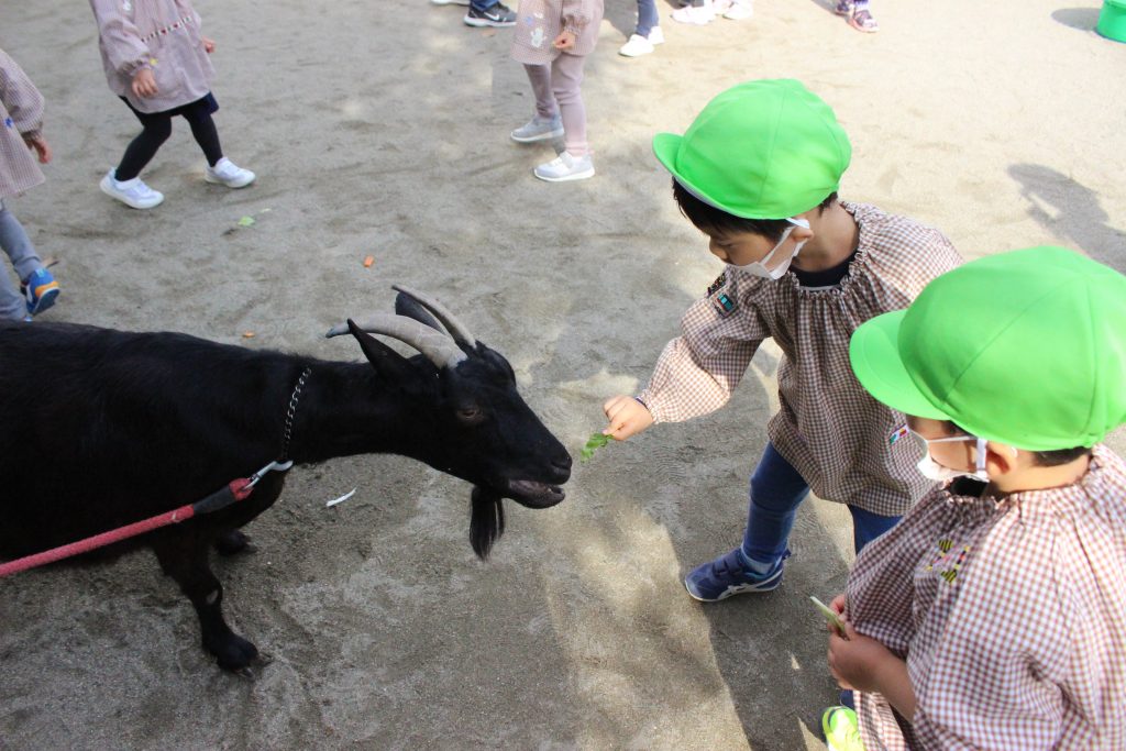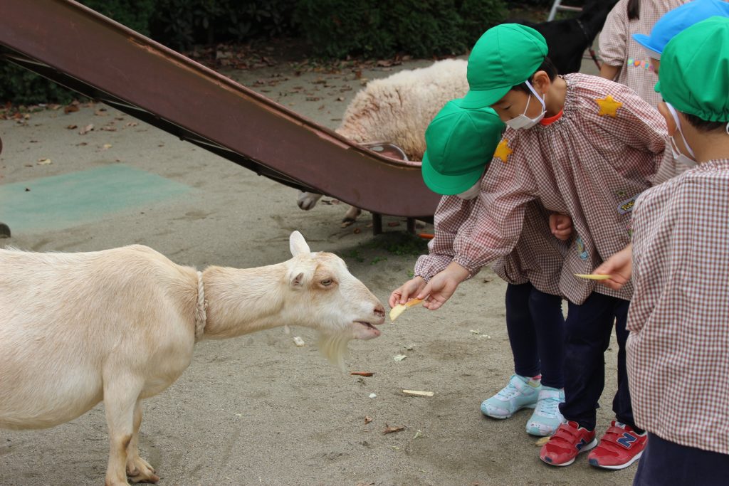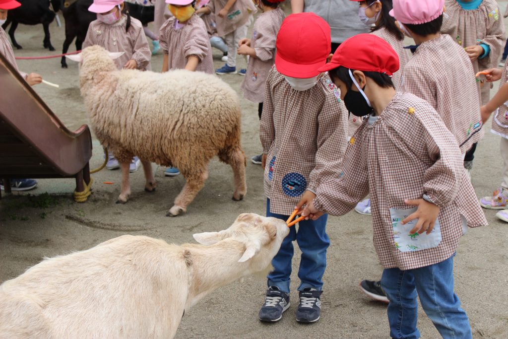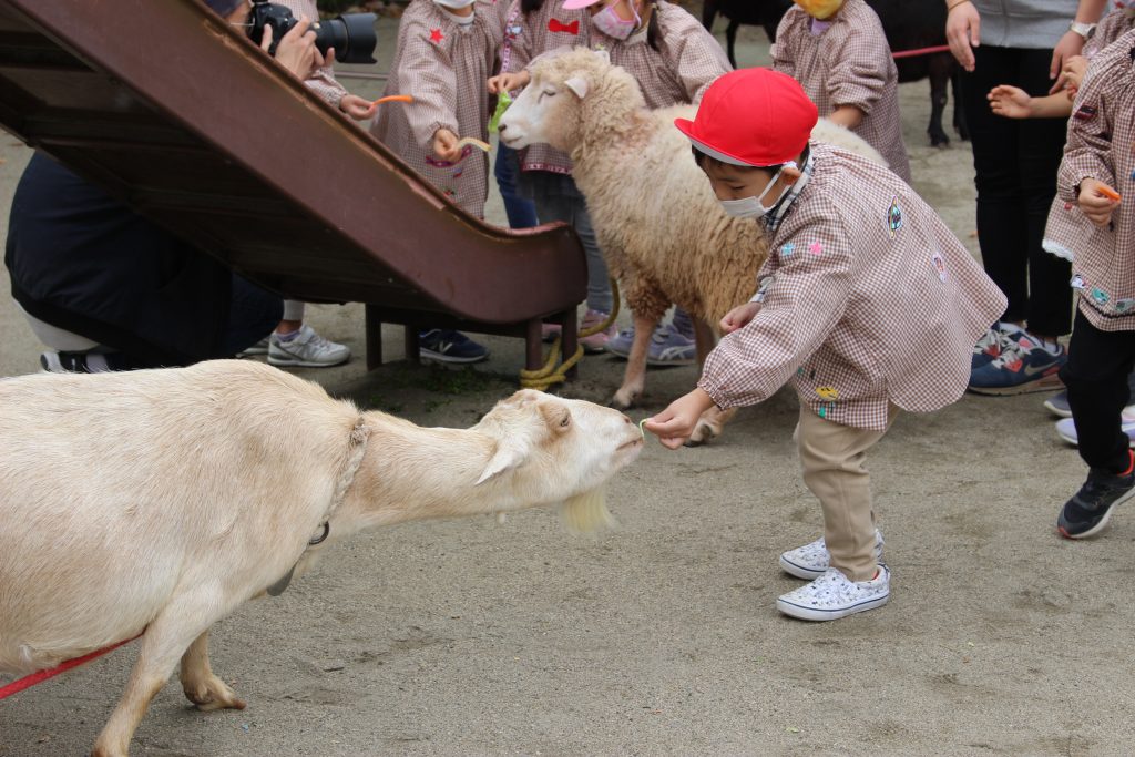 一年に一度園庭にたくさんの動物が来る『移動動物村』。この日の朝、子どもたちが登園する頃には、園庭に賑やかな鳴き声があちらこちらで聞こえてきました。「今、ヤギの声が聞こえたよ!」「羊じゃない?」「ウサギさん、かわいいね!」といつもと違う園庭に目を輝かせ、興味津々。身支度を終えると、動物の動きをしばらく観察したり、早く触れてみたい、餌をあげたいという気持ちを言葉で表す子も多くいました。