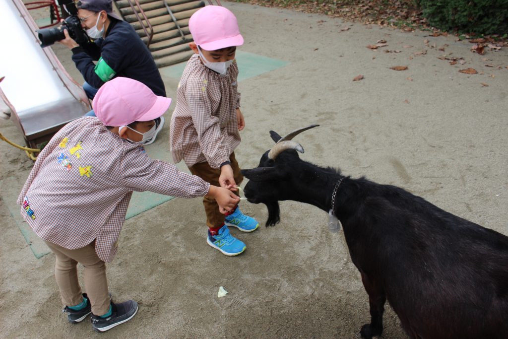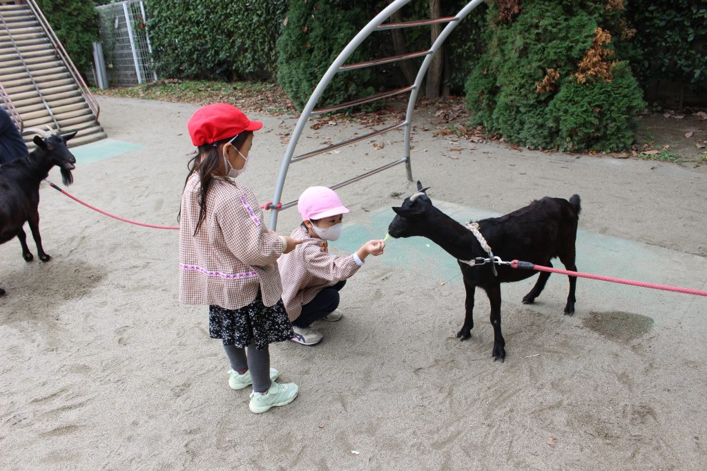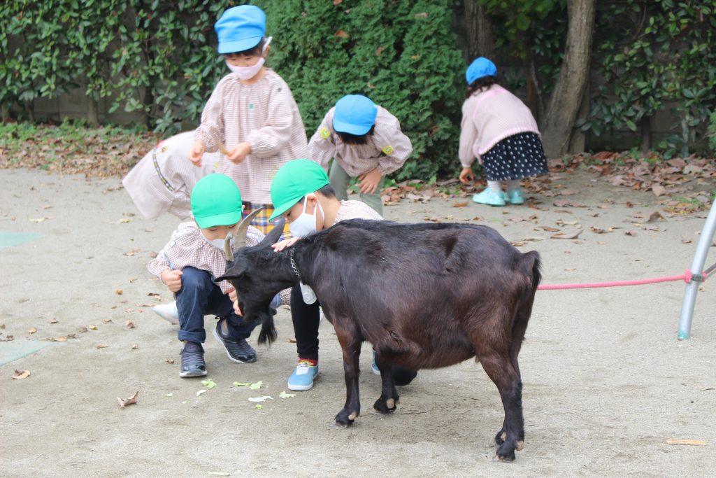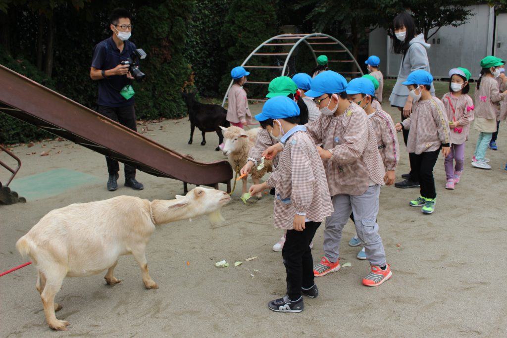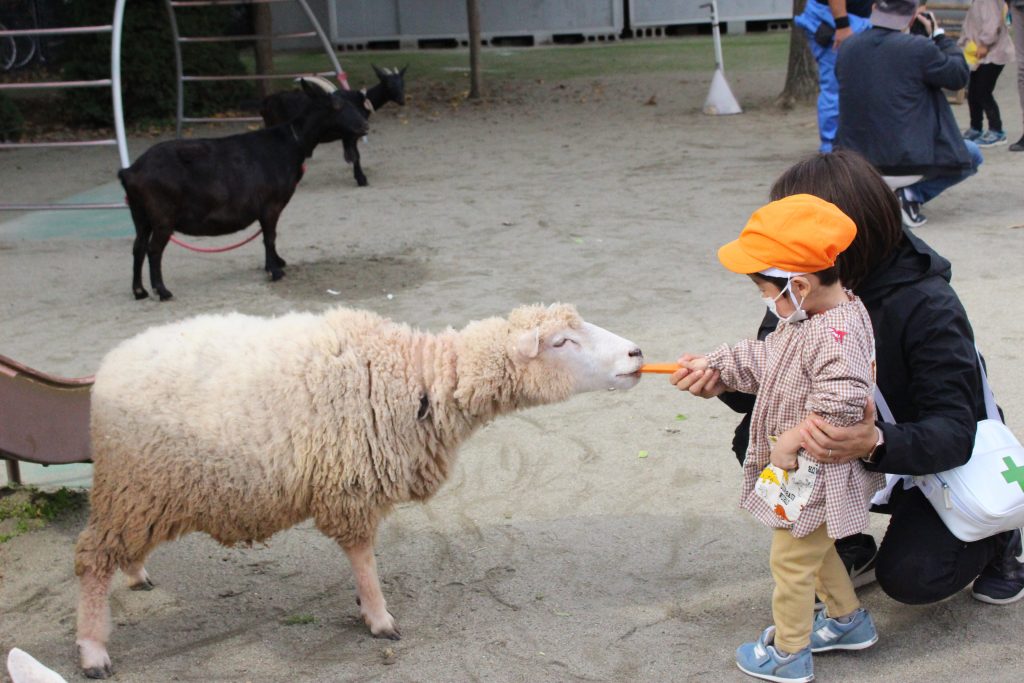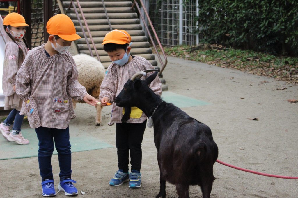 一年に一度園庭にたくさんの動物が来る『移動動物村』。この日の朝、子どもたちが登園する頃には、園庭に賑やかな鳴き声があちらこちらで聞こえてきました。「今、ヤギの声が聞こえたよ!」「羊じゃない?」「ウサギさん、かわいいね!」といつもと違う園庭に目を輝かせ、興味津々。身支度を終えると、動物の動きをしばらく観察したり、早く触れてみたい、餌をあげたいという気持ちを言葉で表す子も多くいました。