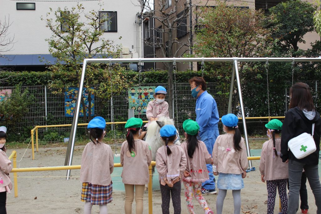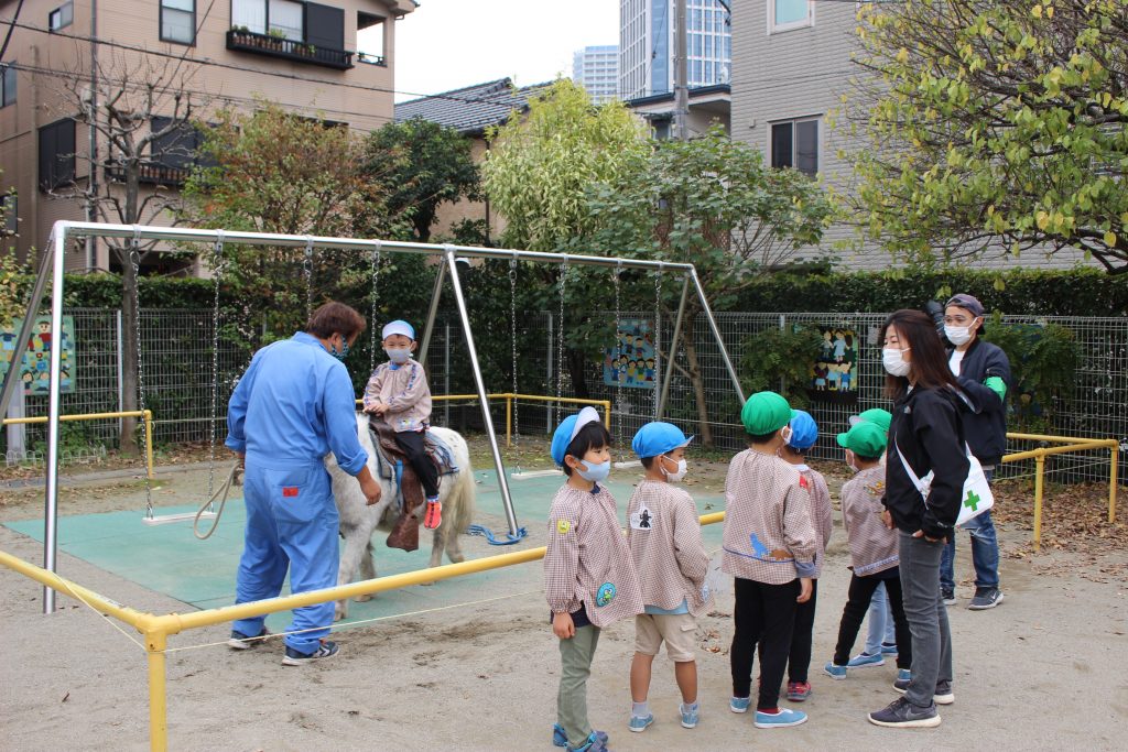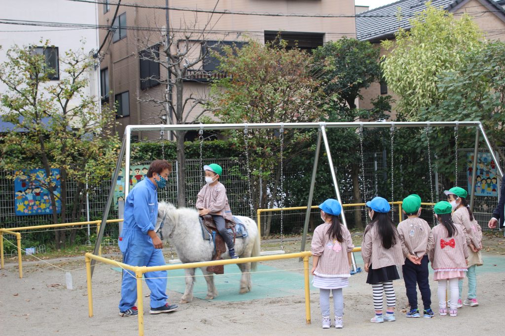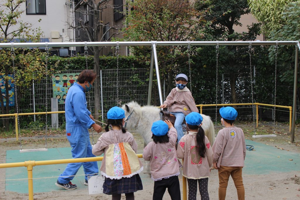 最後は、年長組。年長組は特別に一人ずつポニーに乗ったり、昼食後も触れ合う時間を設けました。