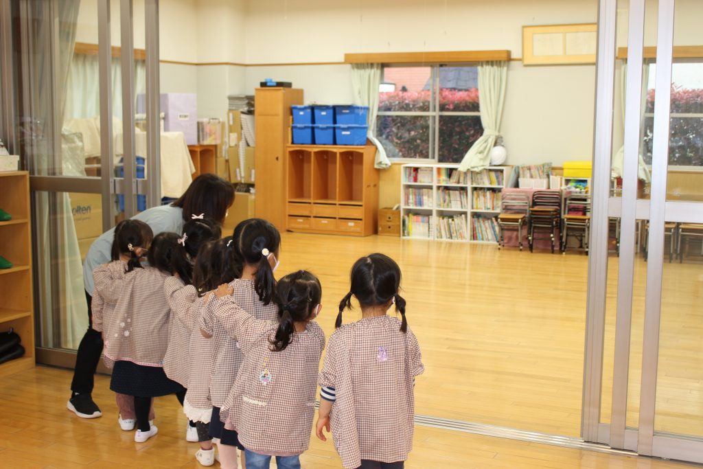 年少組の子ども達は、入園してから3日目。しばらくの間は、各クラスの前までおうちの方と一緒に毎日登園していただいています。すんなりと一人で入室する子、離れることを嫌がり泣く子、じっと周りの様子を見ている子、急に寂しくなりエントランスまでおうちの方を探しに来る子など、緊張と不安をいろいろな姿で表しています。