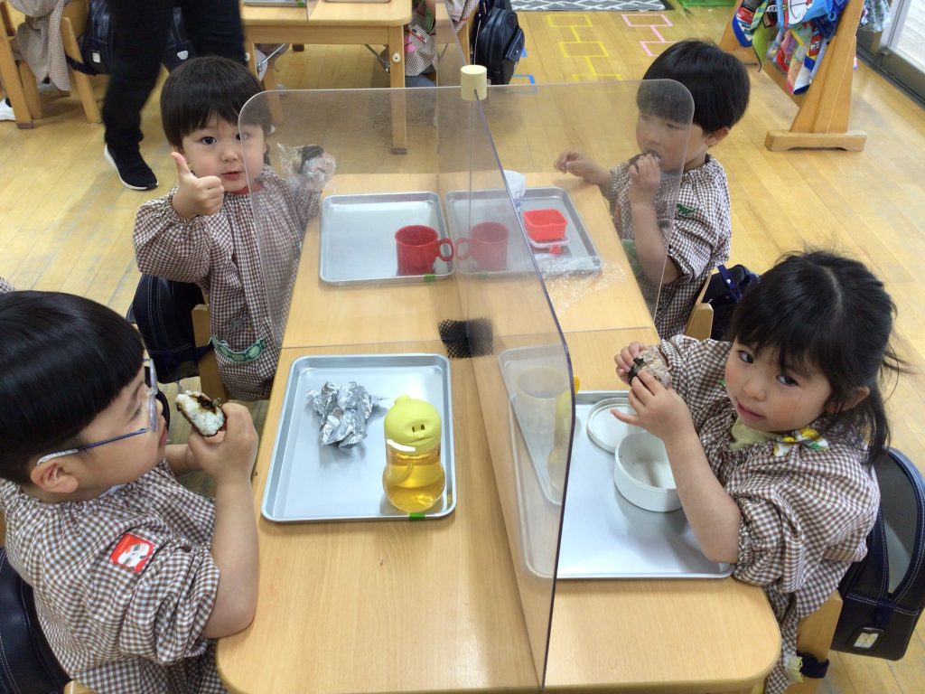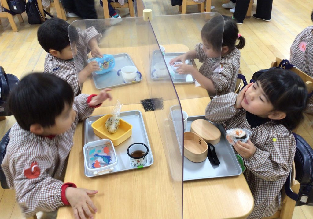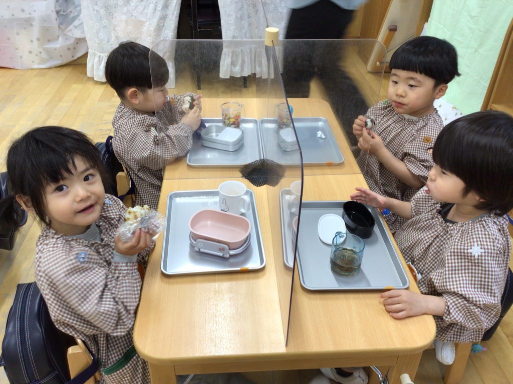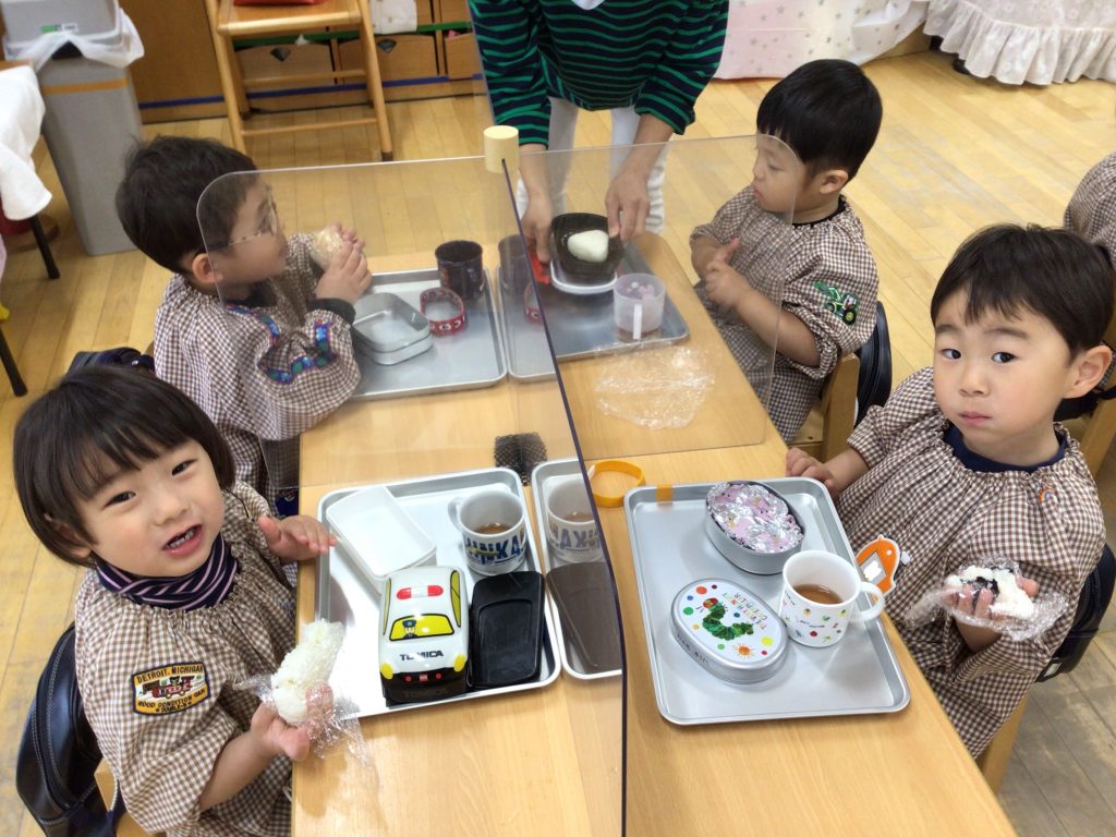 年少組の子ども達は初めておにぎりを持って登園しました。前日に『おにぎり』を題材にした折り紙の活動をしましたが、嬉しそうに持ち帰っていました。この日、「わたしは、ゆかりと梅!」「お肉だよ!」「塩おにぎり、おいしい!」「鮭入ってる!」「大好きなお豆だー!」とそれぞれのおにぎりの紹介をしてくれました。