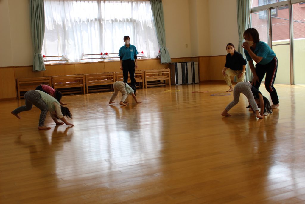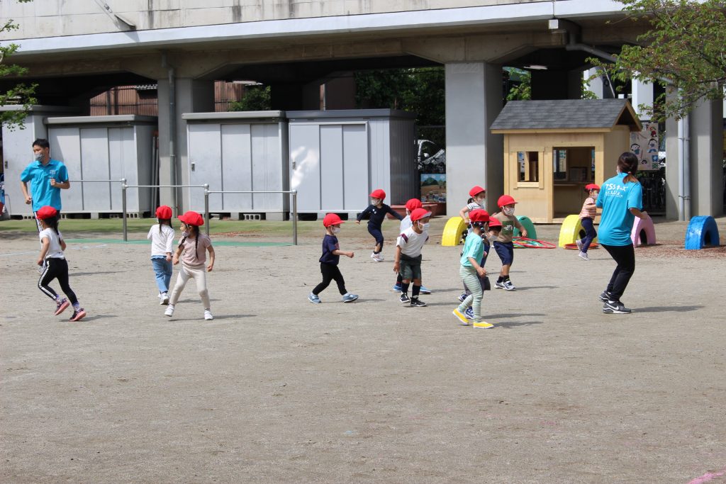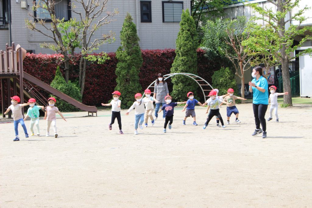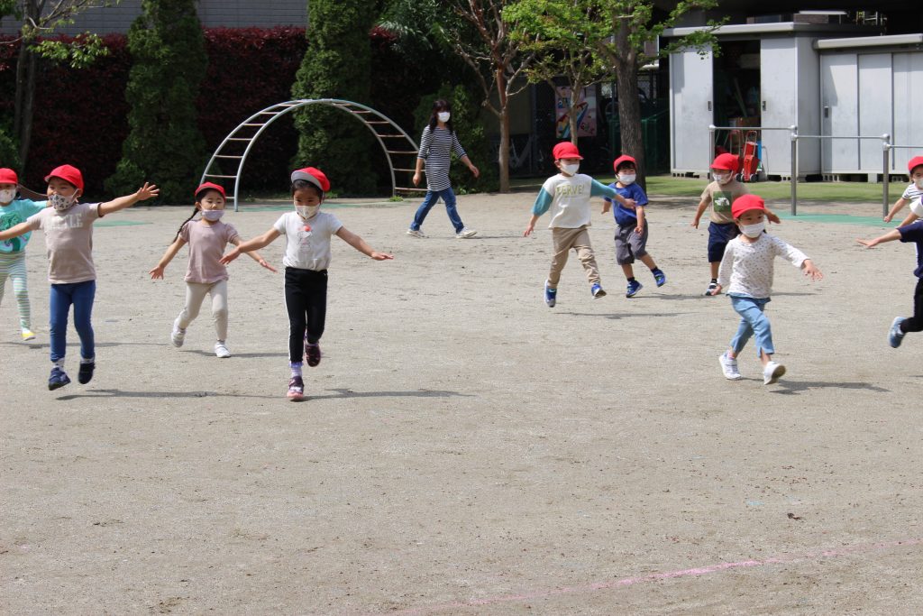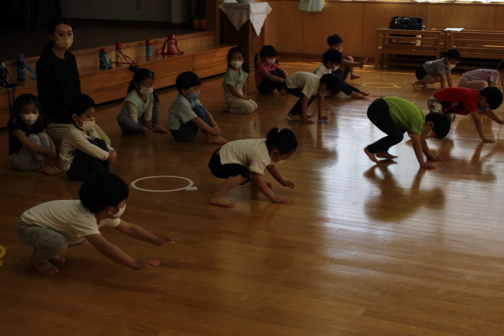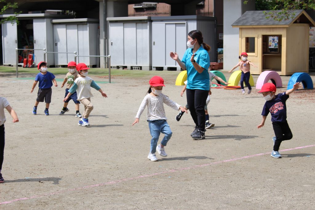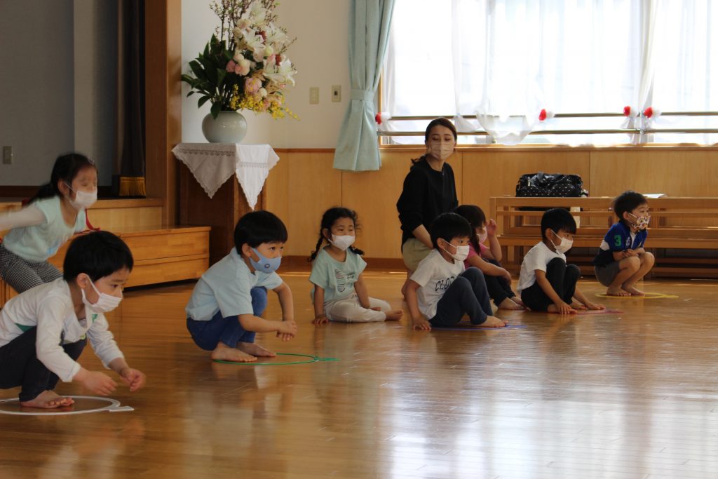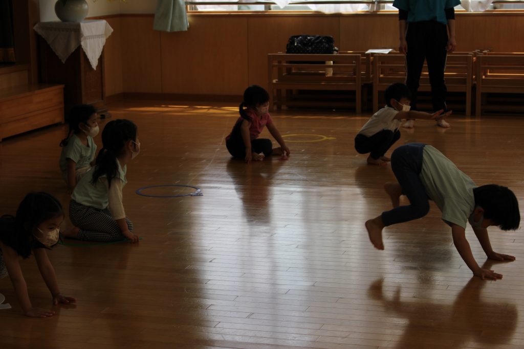 今年度の正課運動あそびが始まりました。この日は、年中組の子ども達の実施日。東急スポーツシステムからコーチの方が来園し、2クラスとも密を避けながらに園庭と遊戯室で指導していただきました。