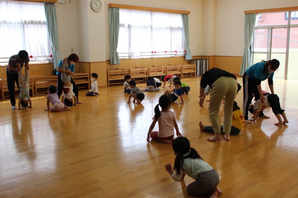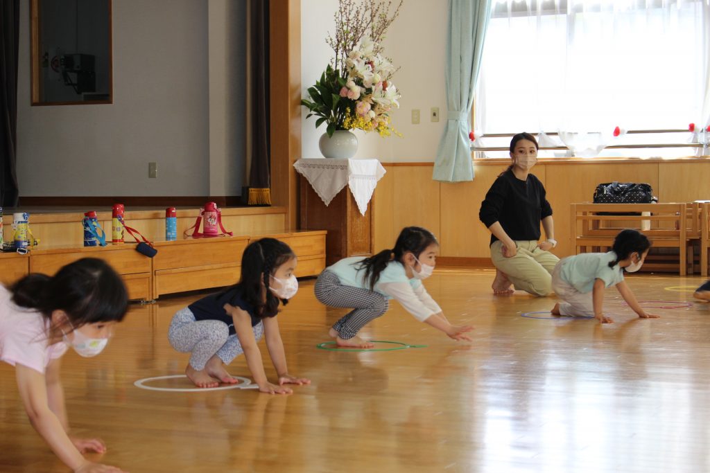 この正課運動あそびでの年間目標は、『様々な運動を通じて、身体を動かすことの楽しさを知り、コーディネーション能力を育む』としています。学年ごとに時期や子ども達の様子に合わせて指導内容等を工夫して進めてくださる予定で、遊戯室ではマット・跳び箱・平均台・フープを使った動き、園庭では大繩・鉄棒・ボールなどを使った動きを行います。他にも、物を使わない運動も毎回取り入れてくださいます。