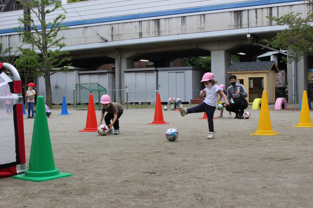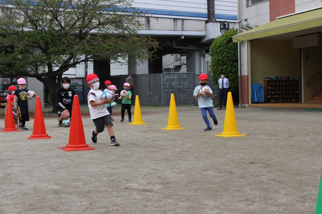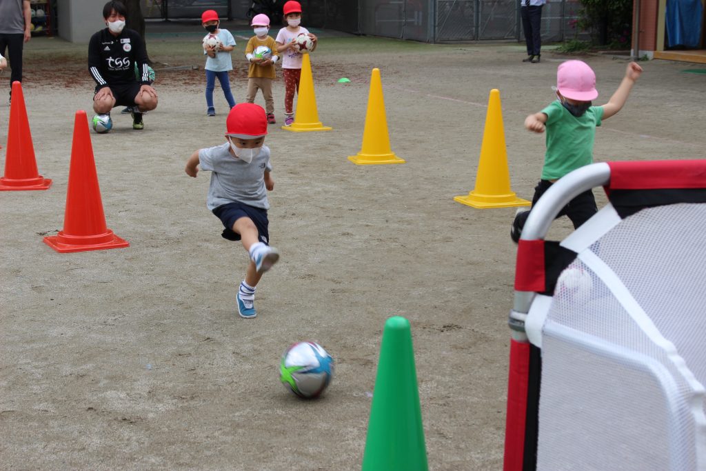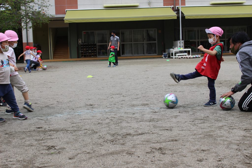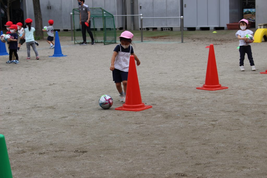 今年度から新しく課外あそびを2つ導入することに決まりました。その一つが『サッカーあそび』。正課運動あそびと同じく東急グループとの連携により実現することができました。保育後の年中・年長組の子ども達を対象に希望者がこの日に初めて参加しました。