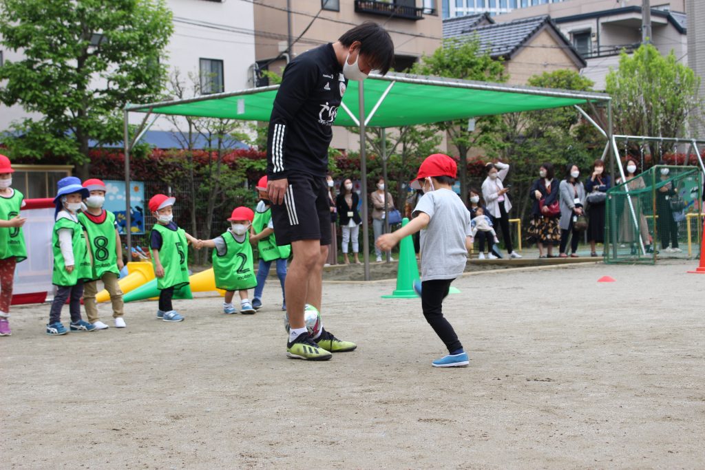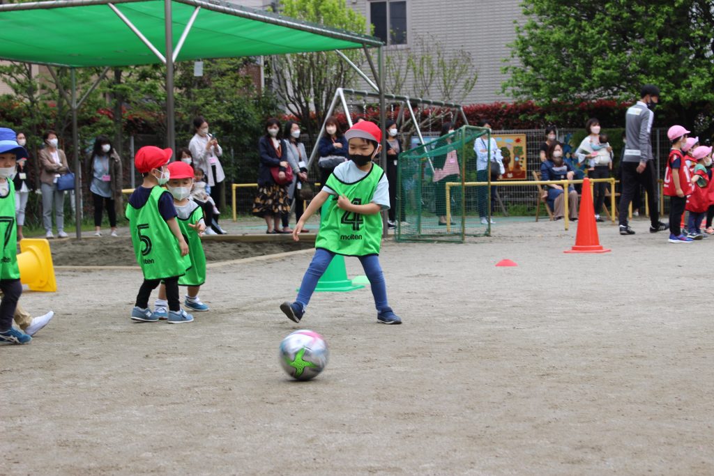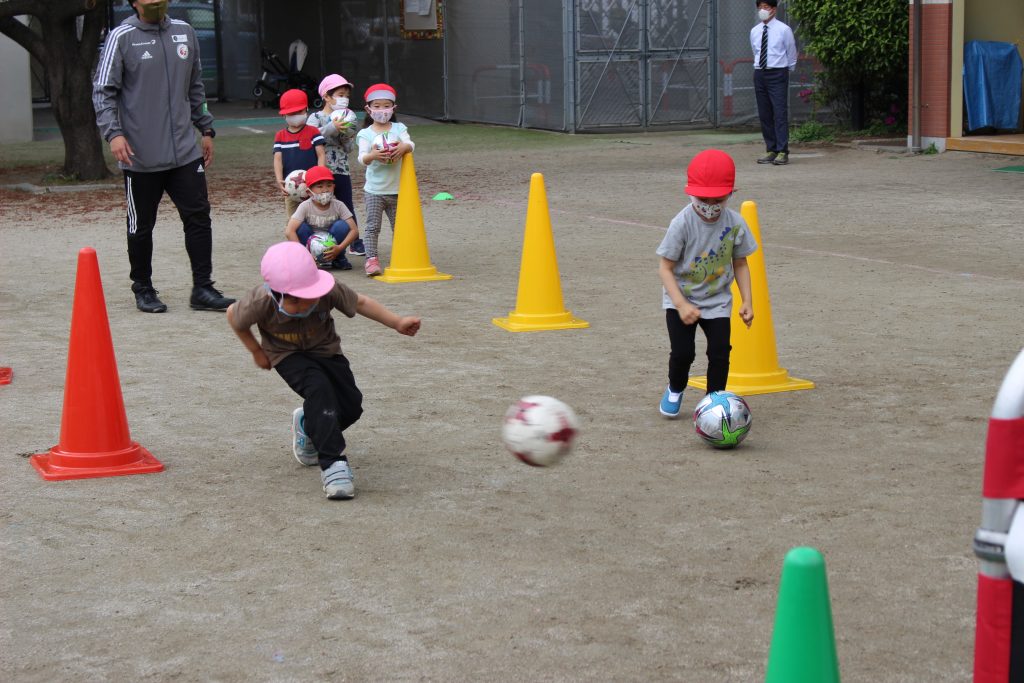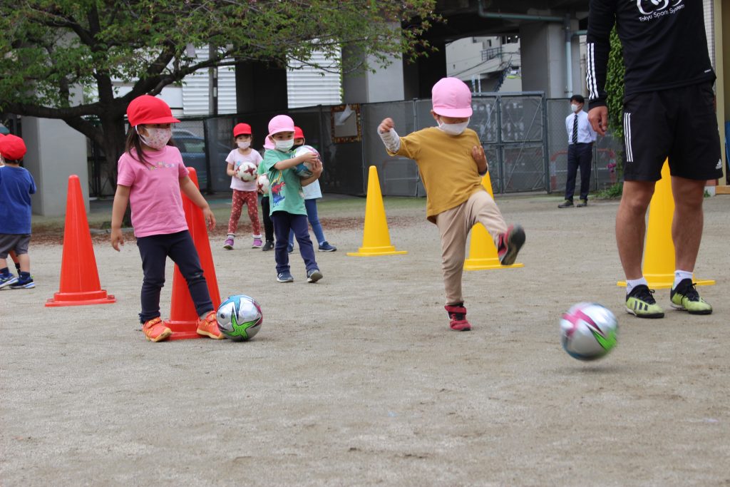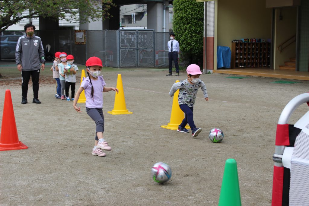 今年度から新しく課外あそびを2つ導入することに決まりました。その一つが『サッカーあそび』。正課運動あそびと同じく東急グループとの連携により実現することができました。保育後の年中・年長組の子ども達を対象に希望者がこの日に初めて参加しました。