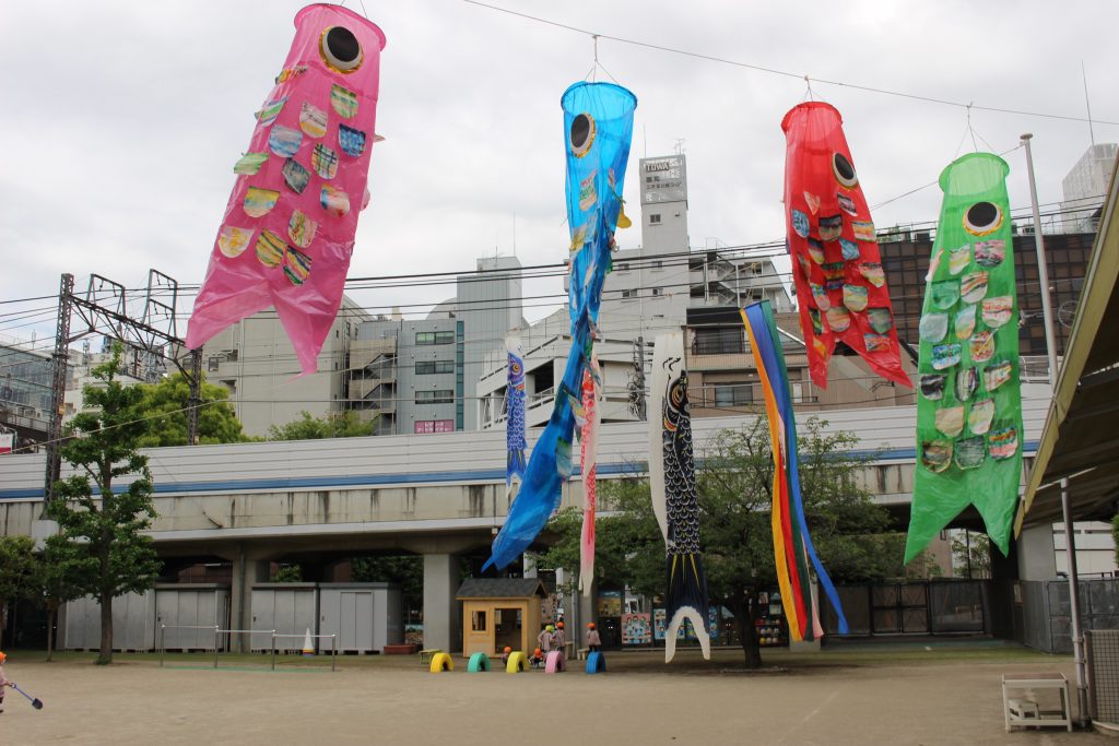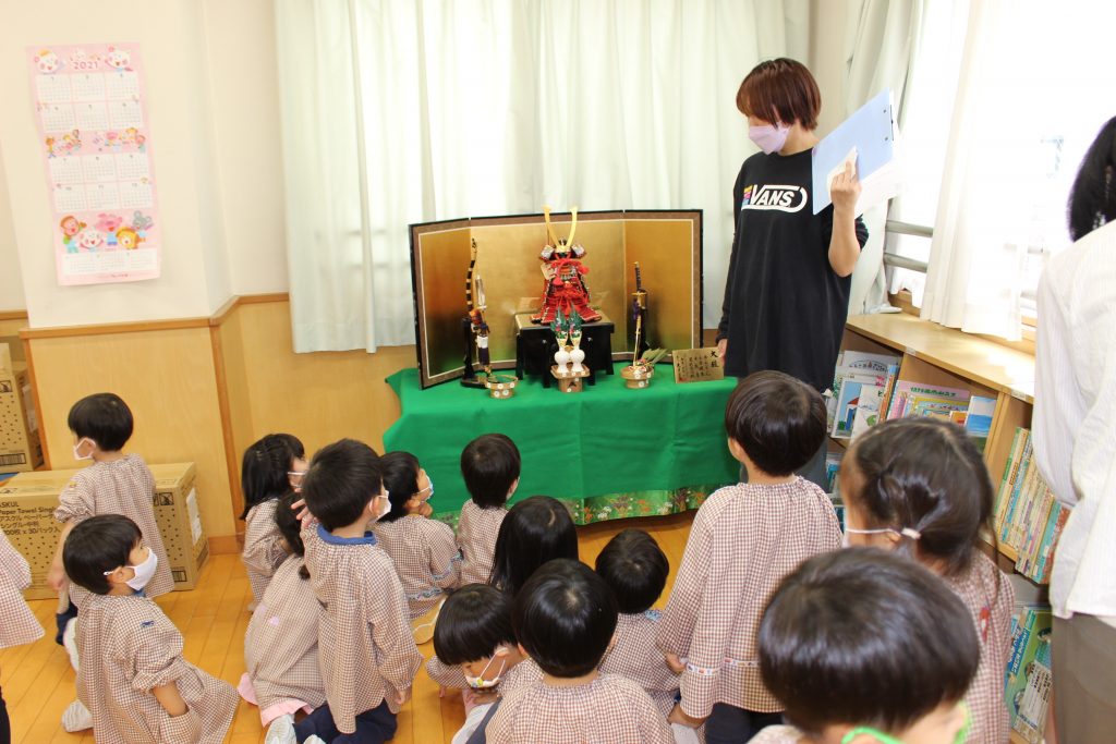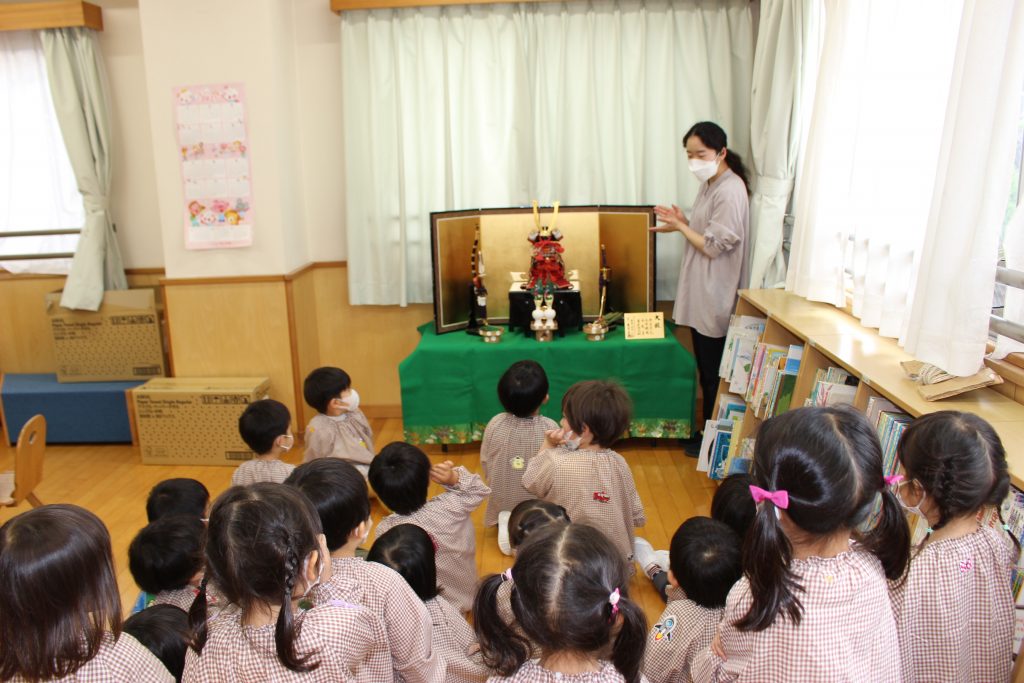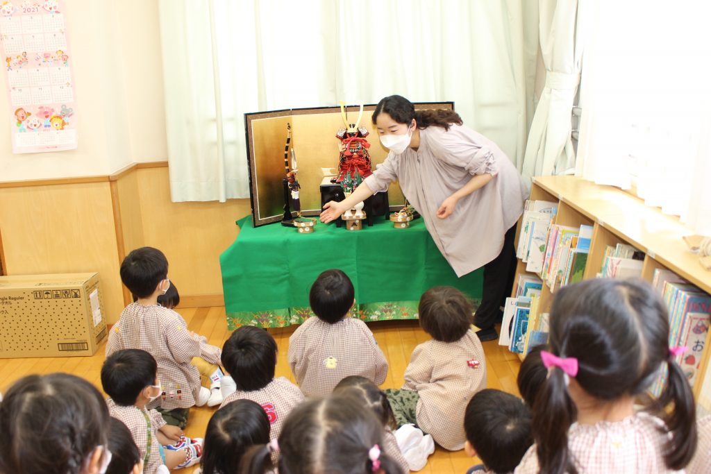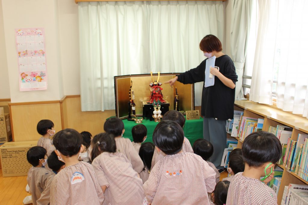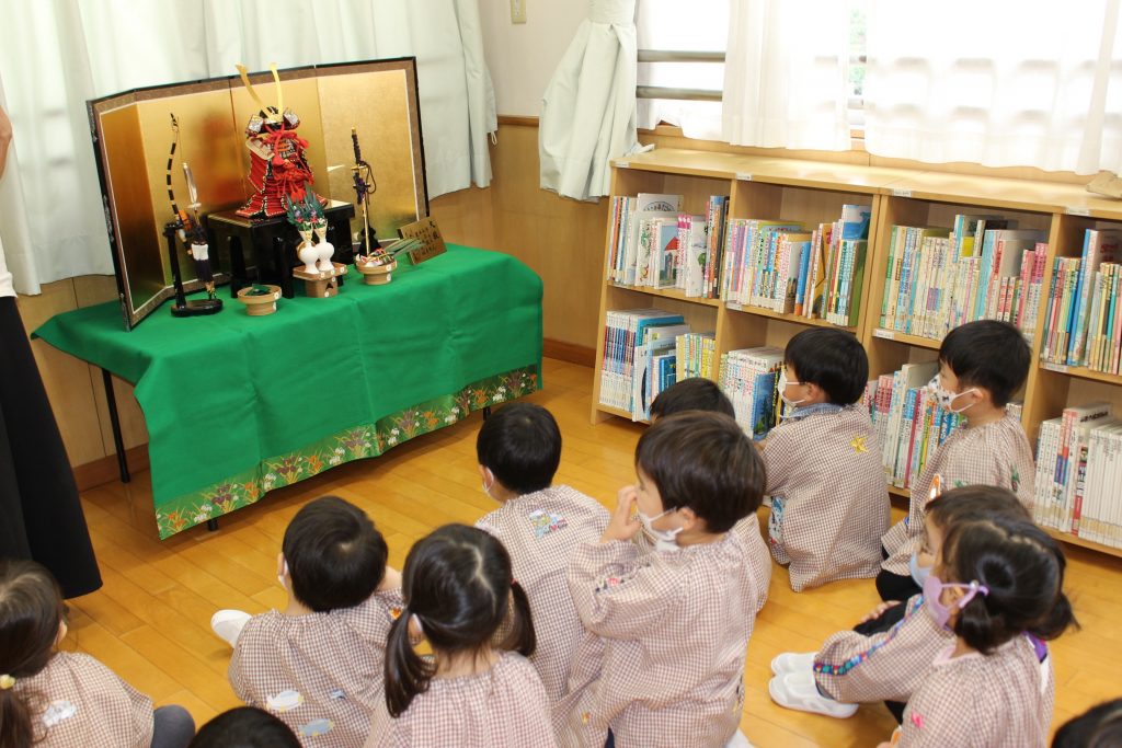 本園では、毎年このこどもの日にちなんで、『こどもの日の祝い』を行事として行っています。当日を迎えるまでに、4月半ば頃から図書室には五月人形が、園庭には天気を見て鯉のぼりが飾られます。飾った初日の登園時、「何かあるね!」「こいのぼりだ!」とすぐに気づく子ども達の姿があり、観察力に驚き、感心していました。