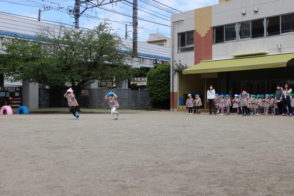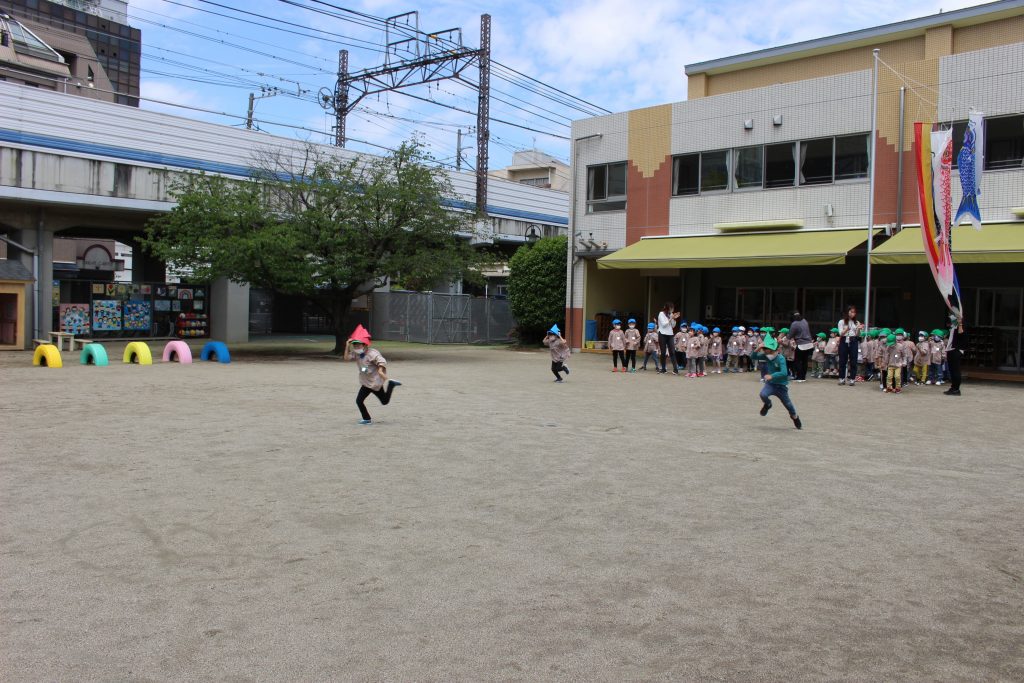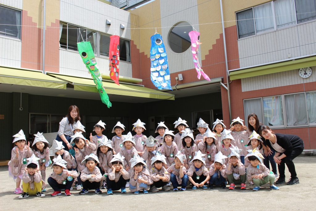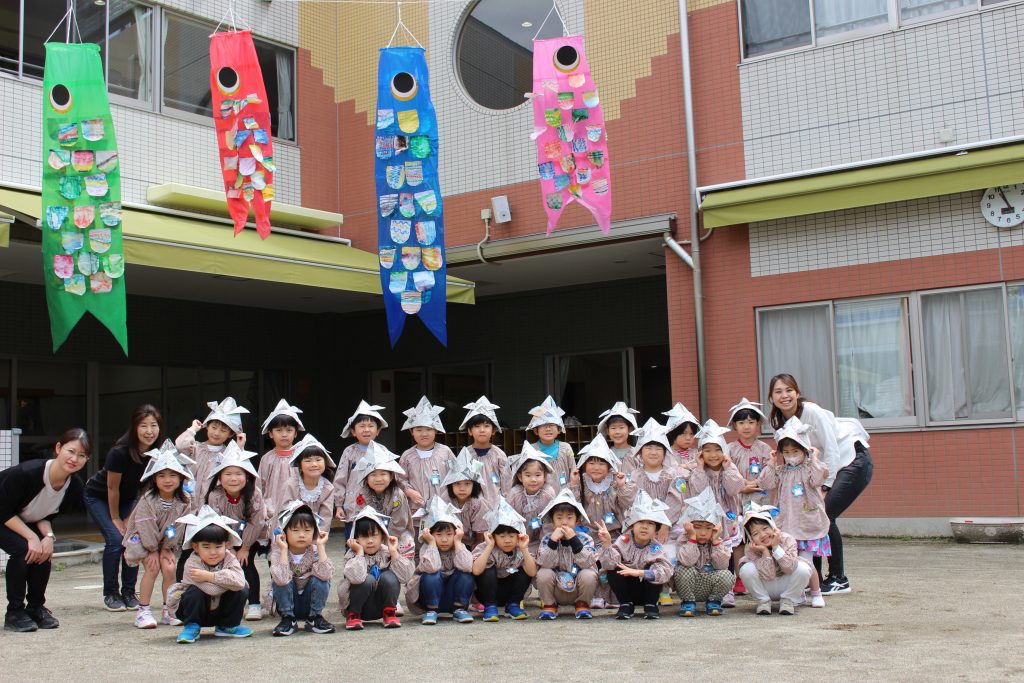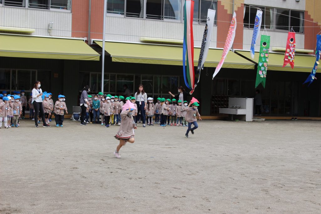 『こどもの日の祝い』の今日は、各クラスや各学年で謂れについて担任から話を聞いたり、クイズをしたり、紙芝居や絵本の読み聞かせをしてもらったりして一日を過ごしていました。年長組は、新聞紙で兜を折り、それを被ってクラス写真を撮影したり、最後は兜をバトン代わりにしてリレーをしました。その姿を目にし、年長組の子ども達が入園した2年前、5月末まで臨時休園をしたことが思い出されました。思いきり元気いっぱい走っている姿に、無事に今日のこども日の祝いを迎えることができたこと、そして一人ひとりの成長を感じ、嬉しく、この時間を過ごせる尊さを実感しました。