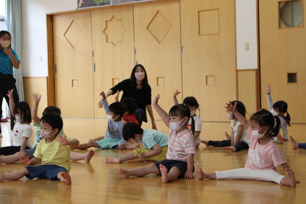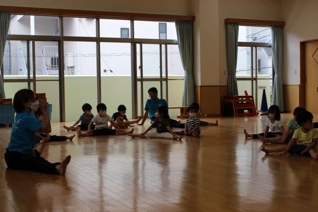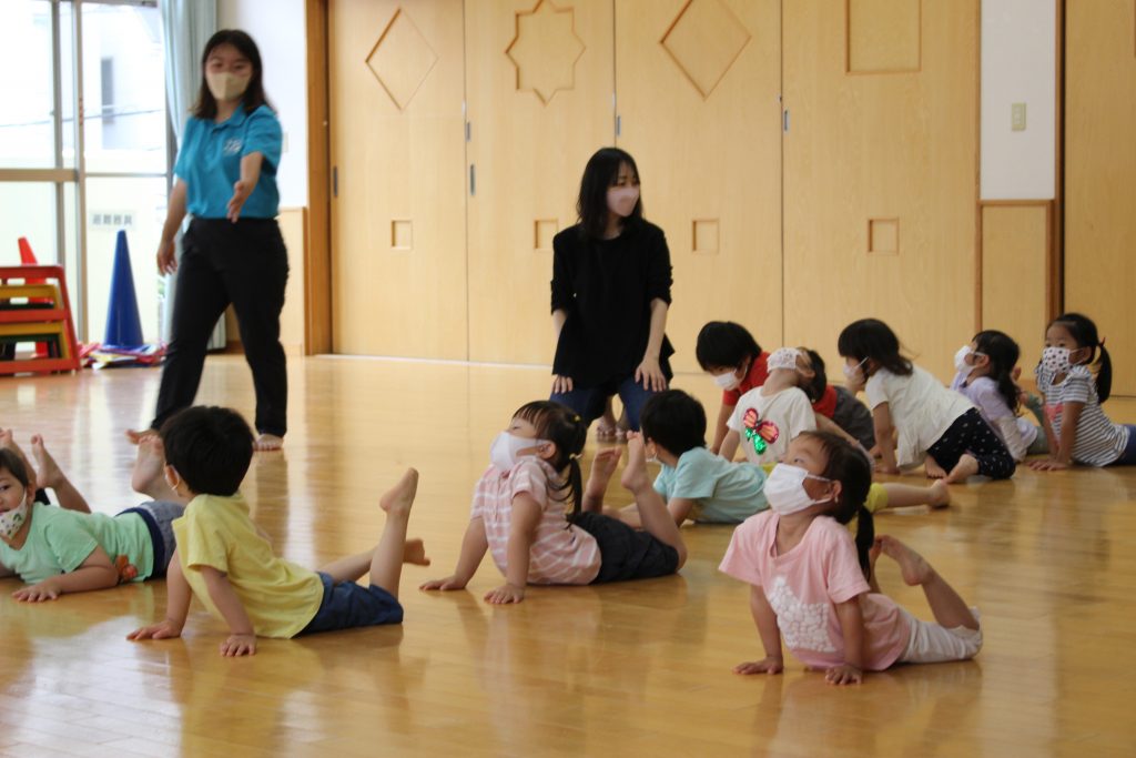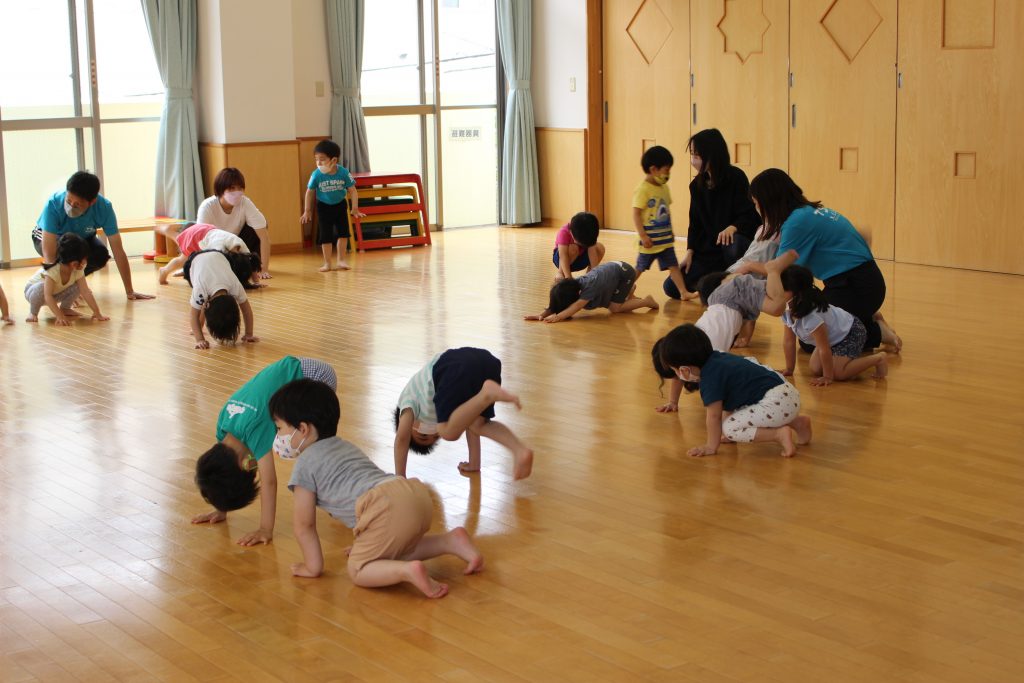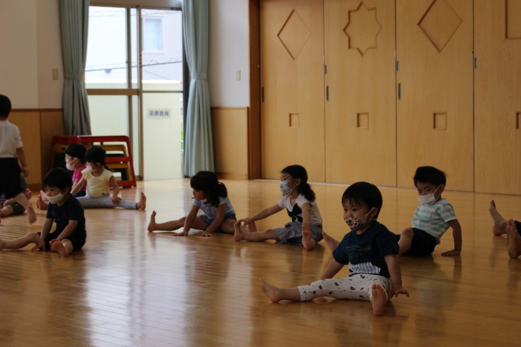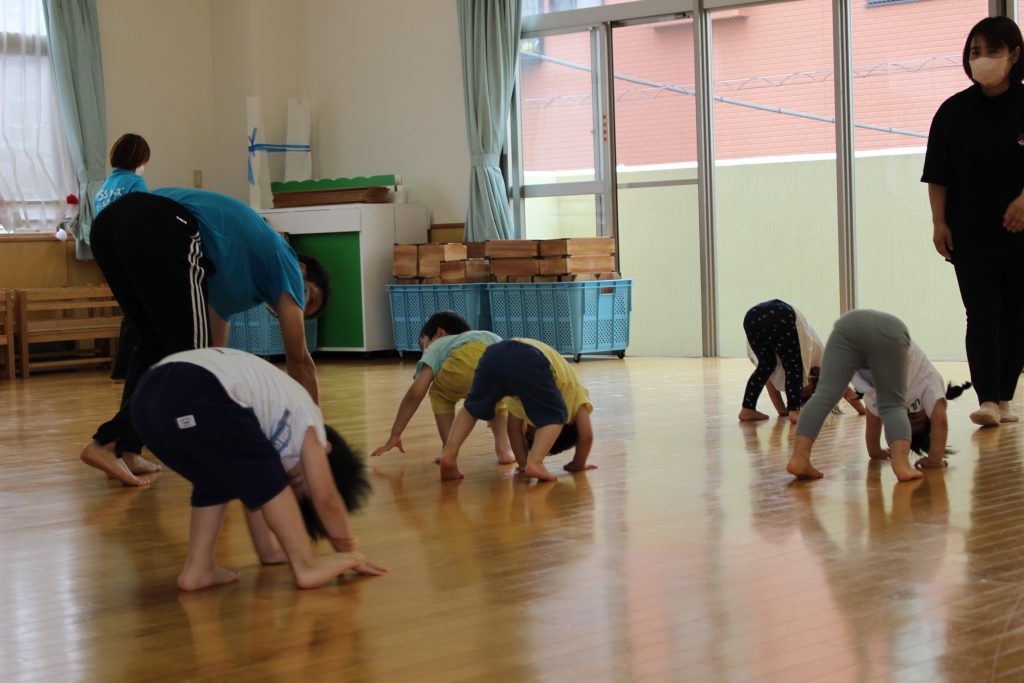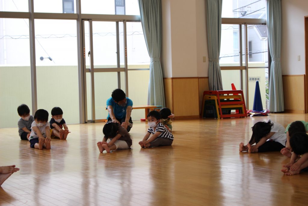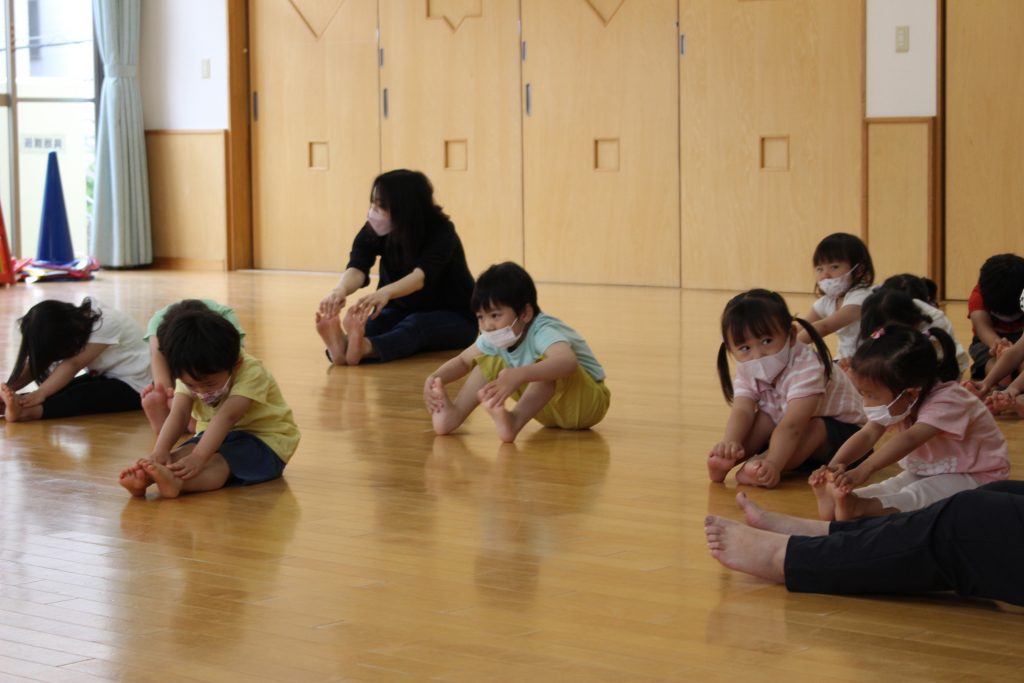 初めて正課運動あそびに参加した年少組。開始前に各クラスで運動あそびについて話を聞いた後、並んで順番に階段を上がり、遊戯室へ向かいました。「おはよう!」と声を掛けて出迎えてくださるコーチをじっと見つめたり、キョロキョロと遊戯室内を見渡したりし、子ども達の楽しみにしている気持ちと何が始まるのかドキドキしている様子がうかがえました。始まる直前には、どの学年も裸足になって準備をします。年少組もこの日から履いていた靴と靴下を自分で脱ぎ、決まった場所に揃えて置きますが、一つ一つにまだ時間がかかる様子が見られていました。担任やコーチに個別でかかわってもらい、全員がそろったら並びました。コーチの名前の紹介を聞いて言葉に出したり、『からだダンダン』の音楽に合わせて身体を動かすことからスタート。その後は、柔軟やジャンプ、くま歩きを中心に進んでいきました。