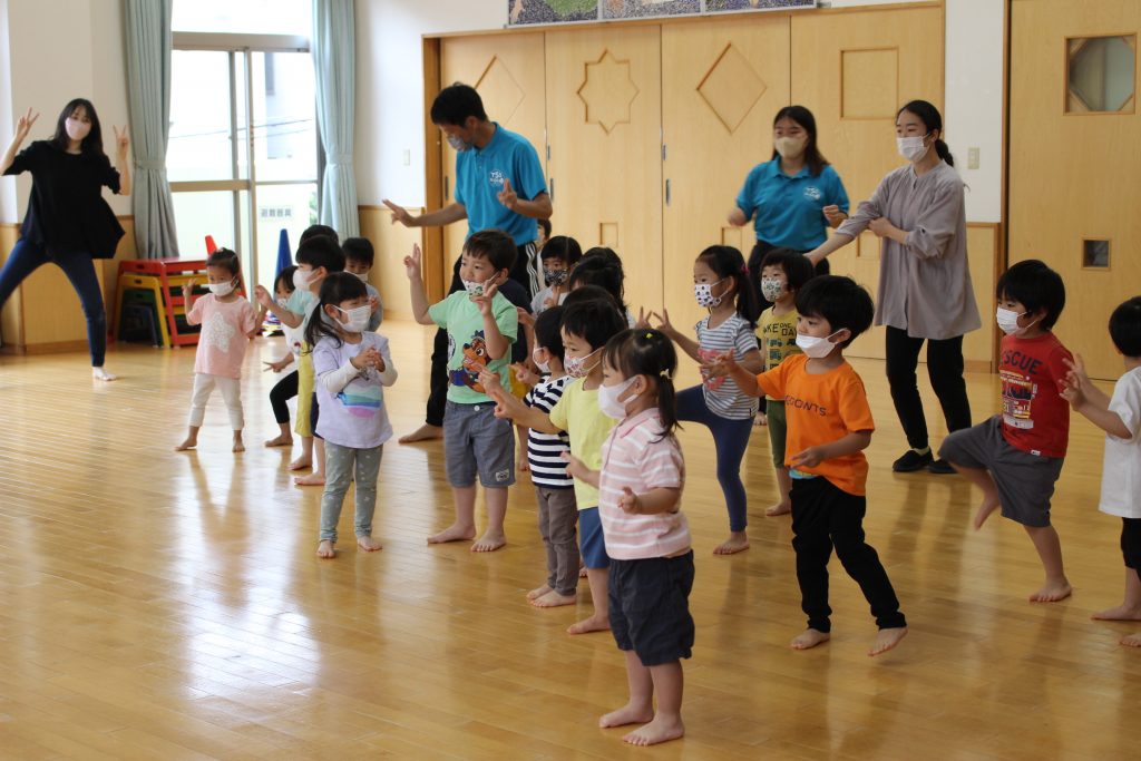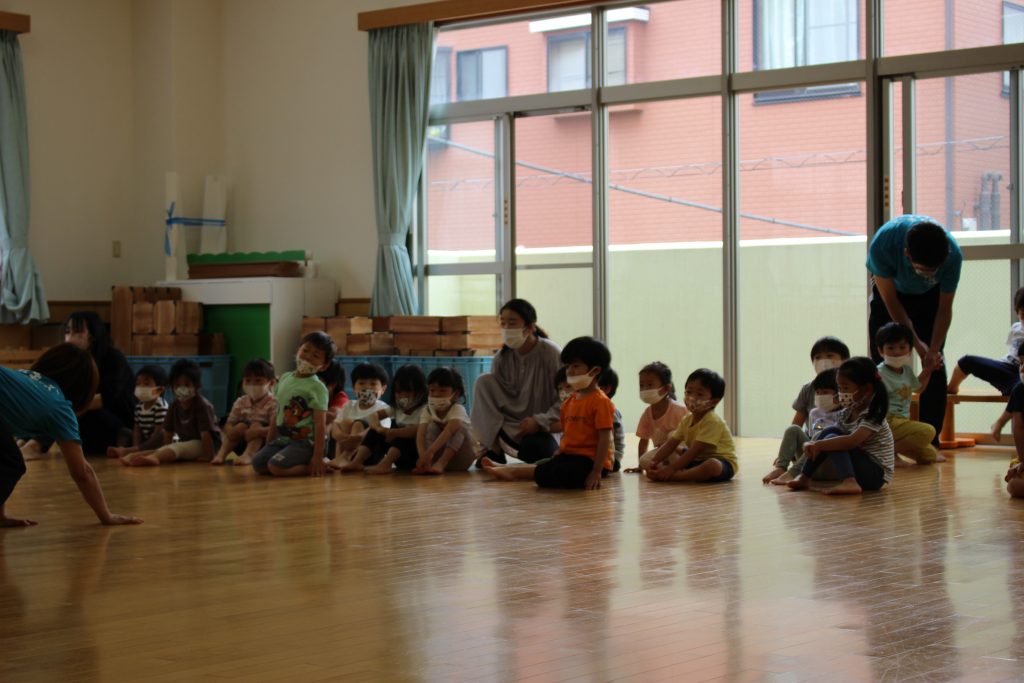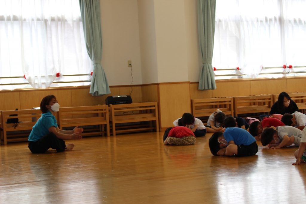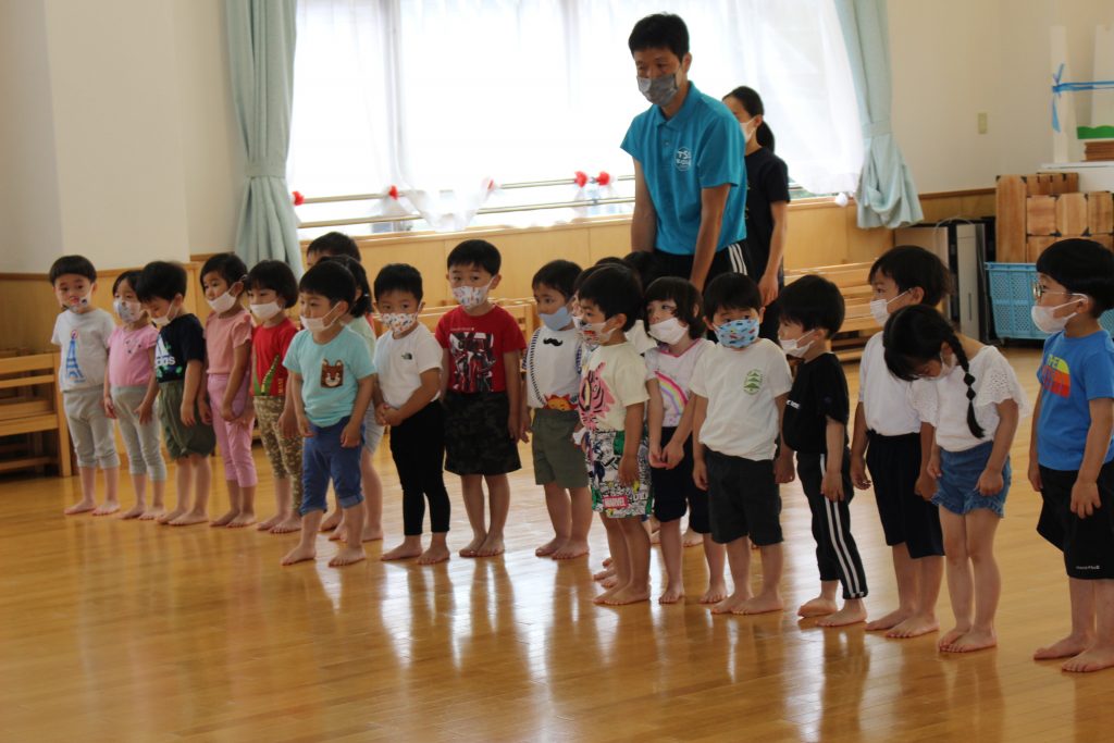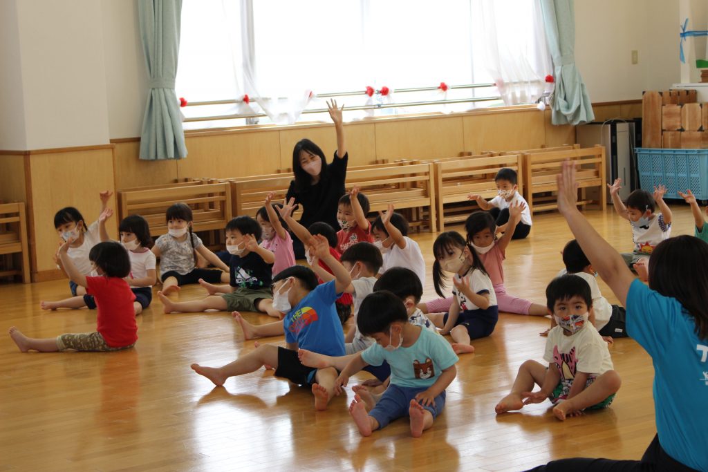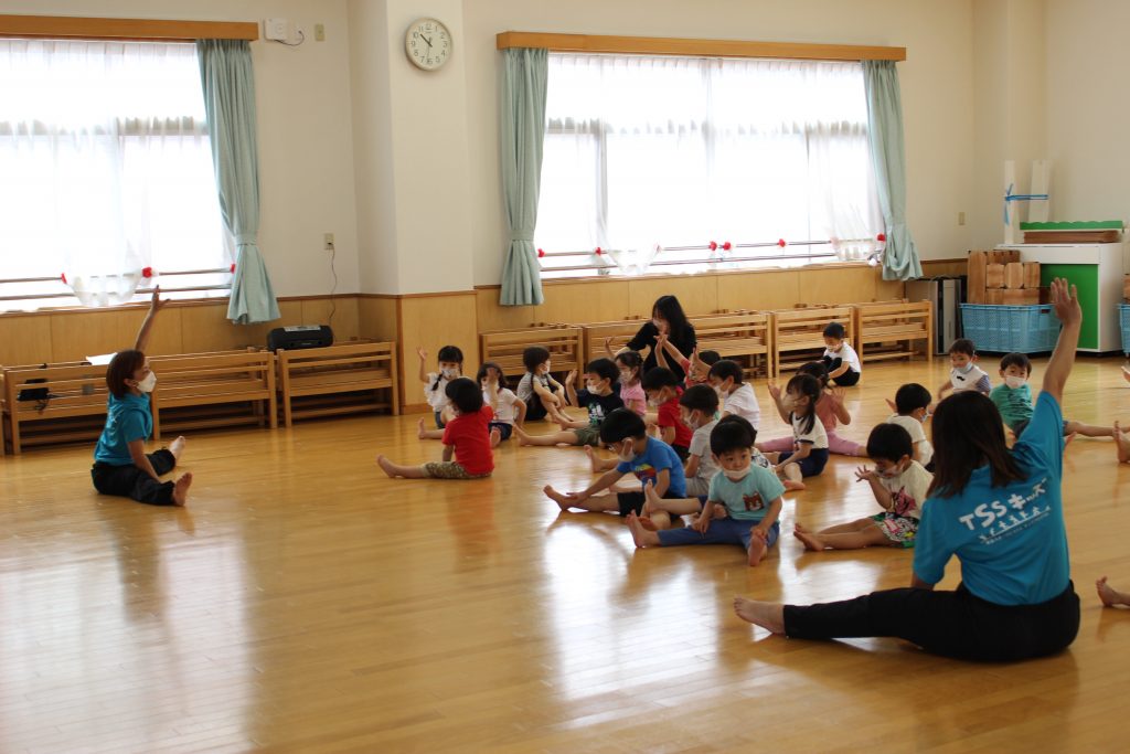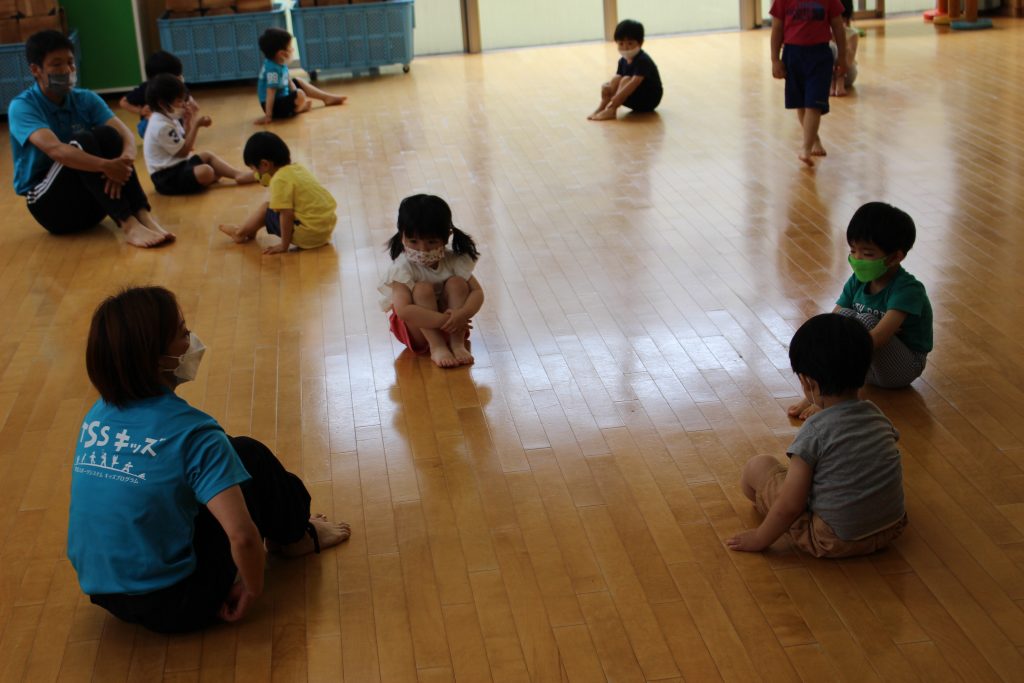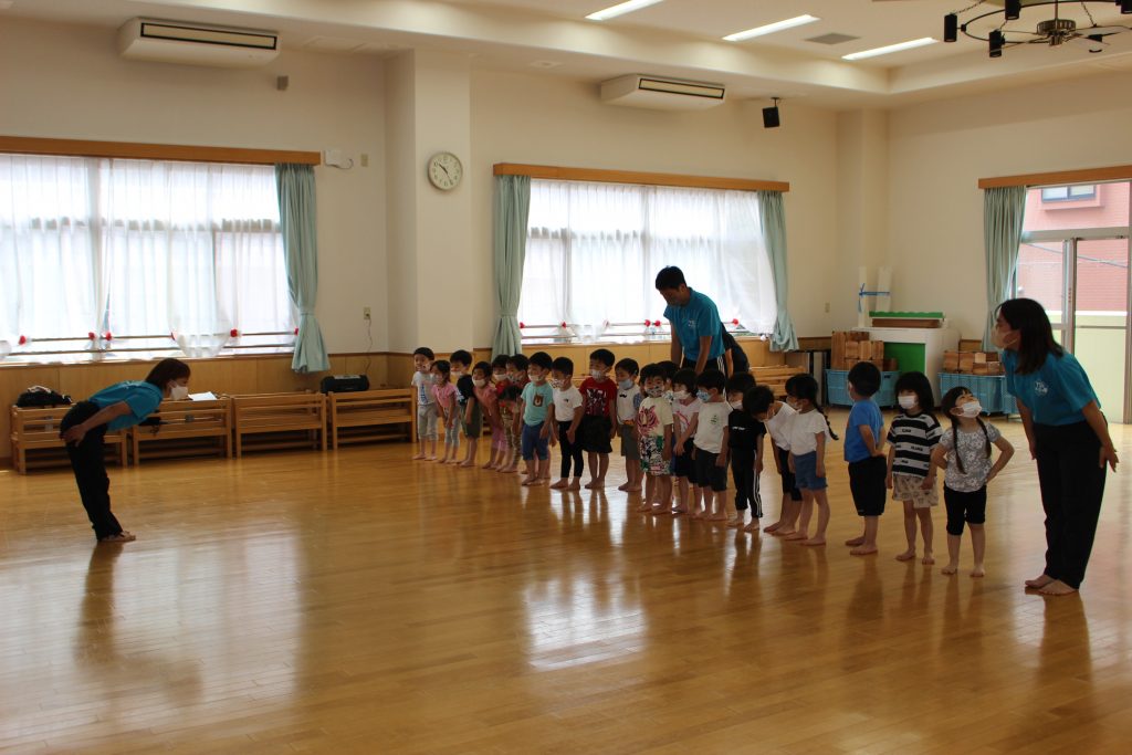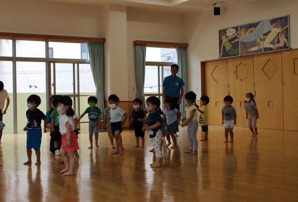 初めて正課運動あそびに参加した年少組。開始前に各クラスで運動あそびについて話を聞いた後、並んで順番に階段を上がり、遊戯室へ向かいました。「おはよう!」と声を掛けて出迎えてくださるコーチをじっと見つめたり、キョロキョロと遊戯室内を見渡したりし、子ども達の楽しみにしている気持ちと何が始まるのかドキドキしている様子がうかがえました。始まる直前には、どの学年も裸足になって準備をします。年少組もこの日から履いていた靴と靴下を自分で脱ぎ、決まった場所に揃えて置きますが、一つ一つにまだ時間がかかる様子が見られていました。担任やコーチに個別でかかわってもらい、全員がそろったら並びました。コーチの名前の紹介を聞いて言葉に出したり、『からだダンダン』の音楽に合わせて身体を動かすことからスタート。その後は、柔軟やジャンプ、くま歩きを中心に進んでいきました。