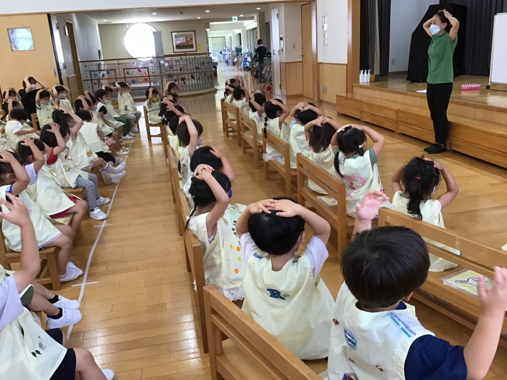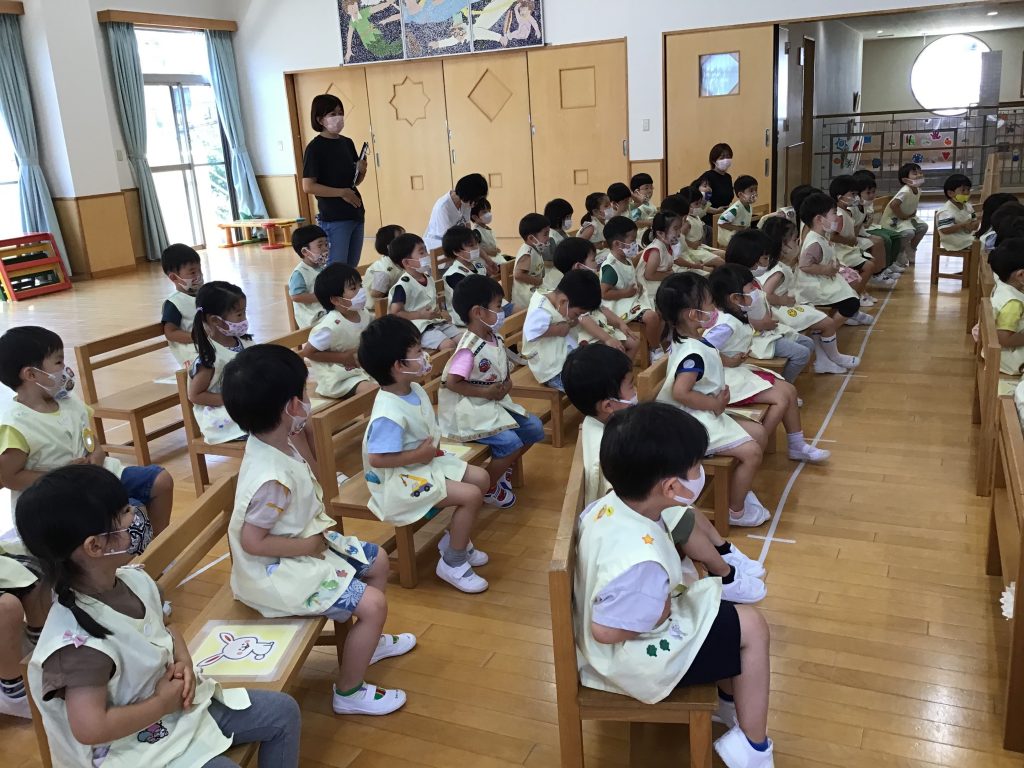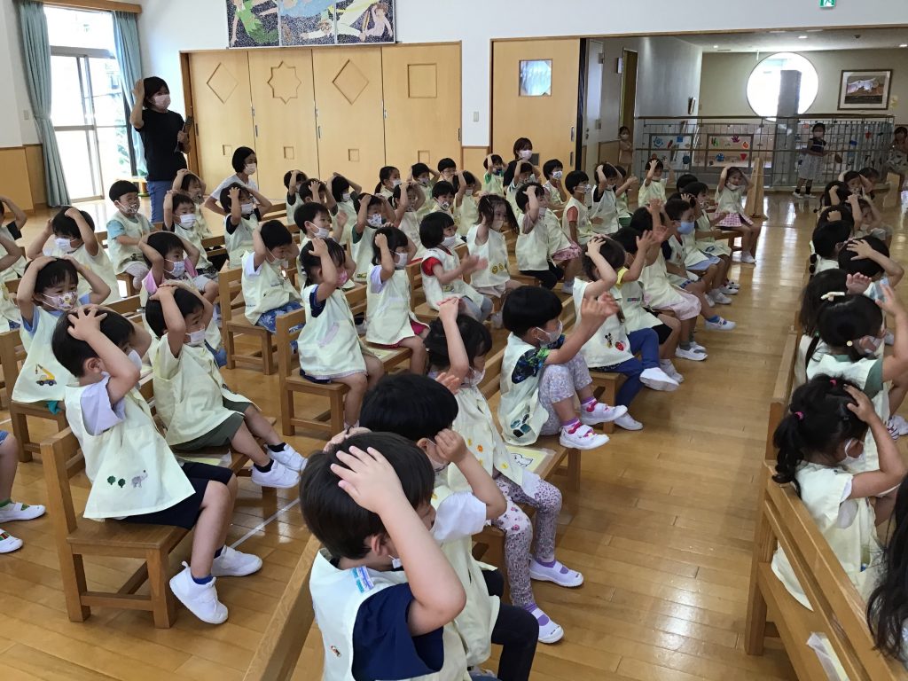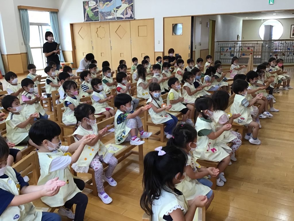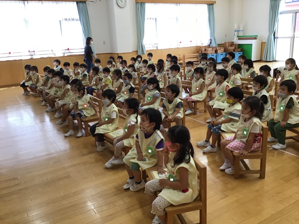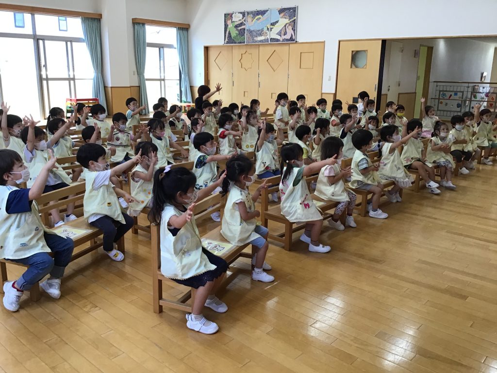 年少組の全クラスが遊戯室に集まりました。学年全員で集まって活動することをどの学年も『仲良し会』と名づけています。