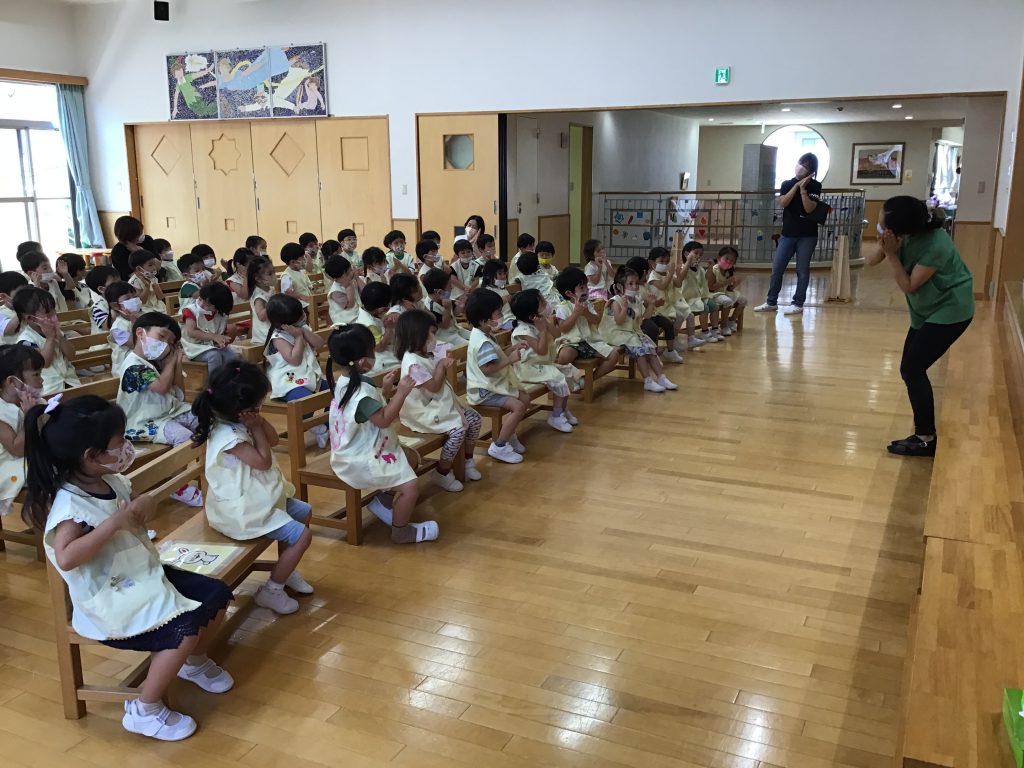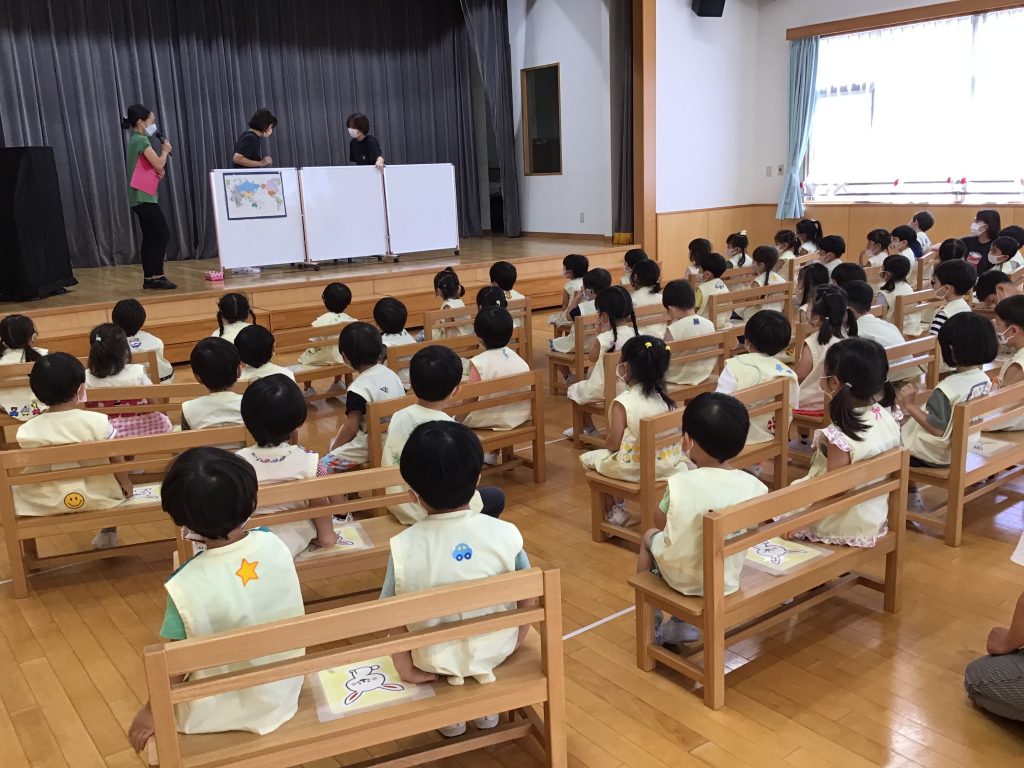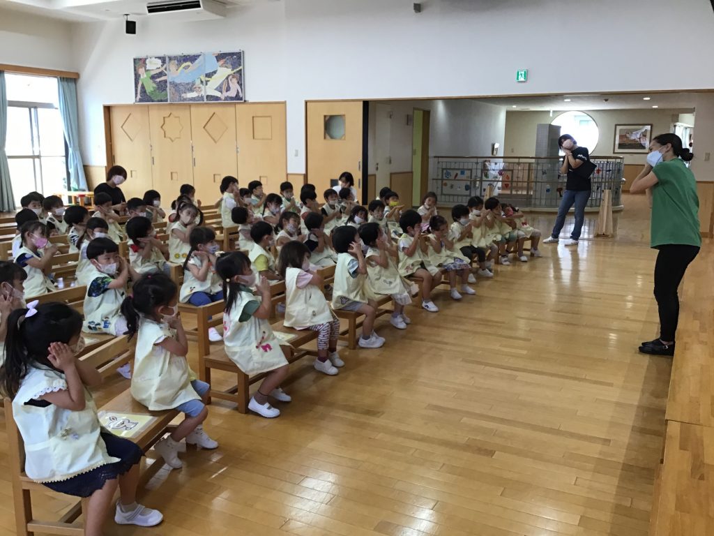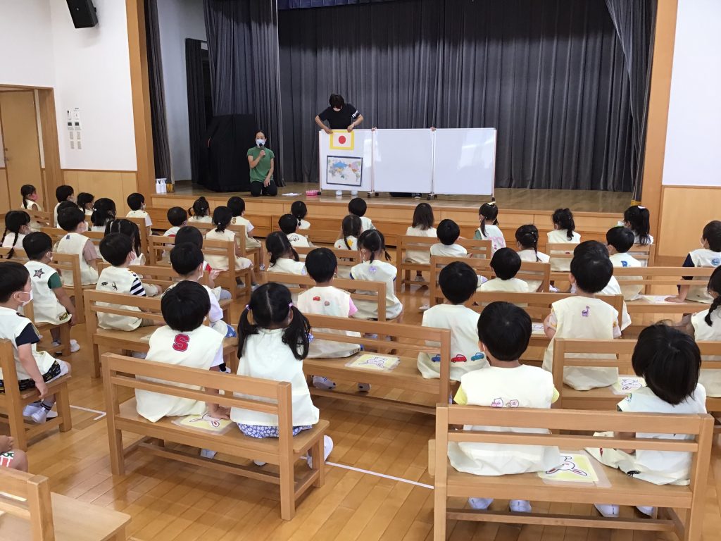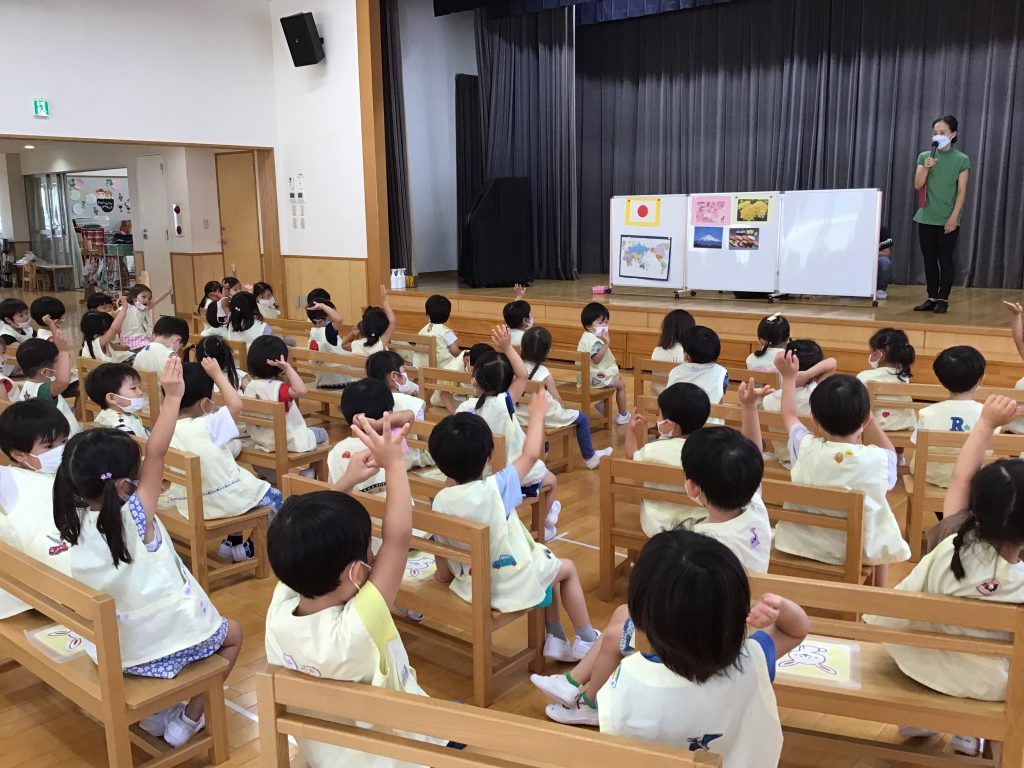 さて、この日は『日本』をテーマにした仲良し会。世界地図を見ながら、日本の場所はどこなのかや海に囲まれていることなどの話を聞きました。その後は、国旗や国花の紹介の時間。日本にちなんだ二択クイズでは手を挙げて元気に答えていたようです。最後は、日本のわらべうたである「げんこつやまのたぬきさん」を楽しみ、会は締めくくりとなりました。自分たちの住んでいる日本のついて知ることができ、集団の中で話を聞くことも上手になってきました。今後は、他の国についても触れていきます。