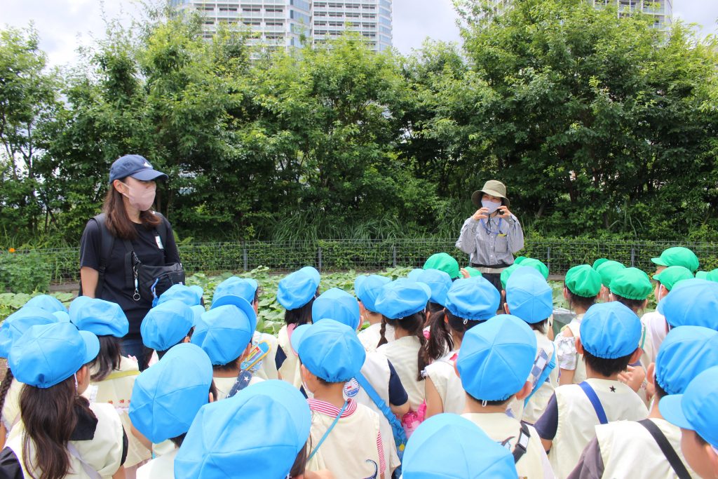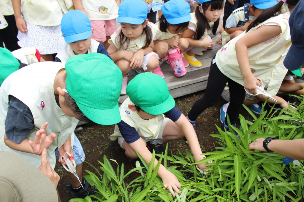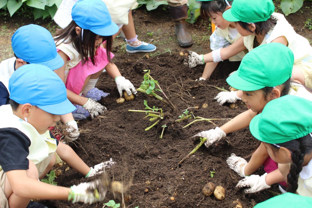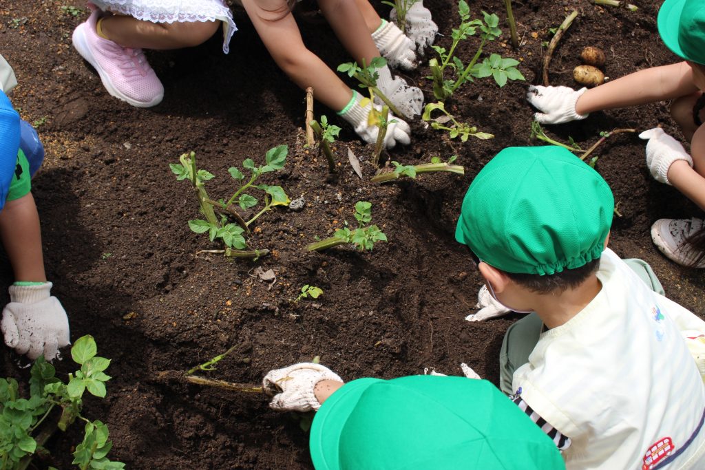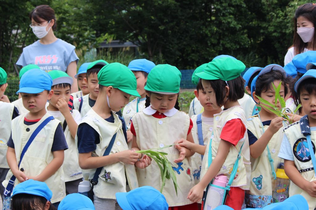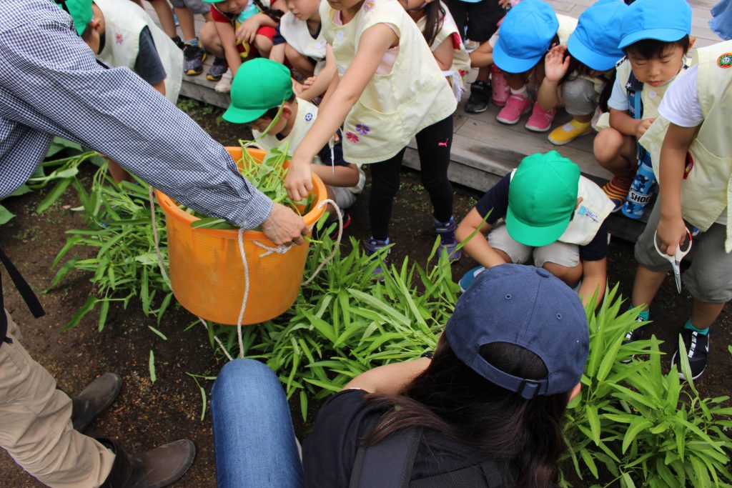 箱根植木の方からジャガイモと空心菜が大きく育ったことや収穫の仕方についての話があり、ジャガイモはメークインという種類であることも教わりました。土の中からどんどんと出てくるジャガイモを「あったー!」「見て!」と当番の子が皆に伝えてくれました。空心菜はハサミを使って茎の下のほうを切って収穫し、茎の中が空洞でストローのようであることを発見したり、そこから空心菜という名前で呼ばれていることを知りました。