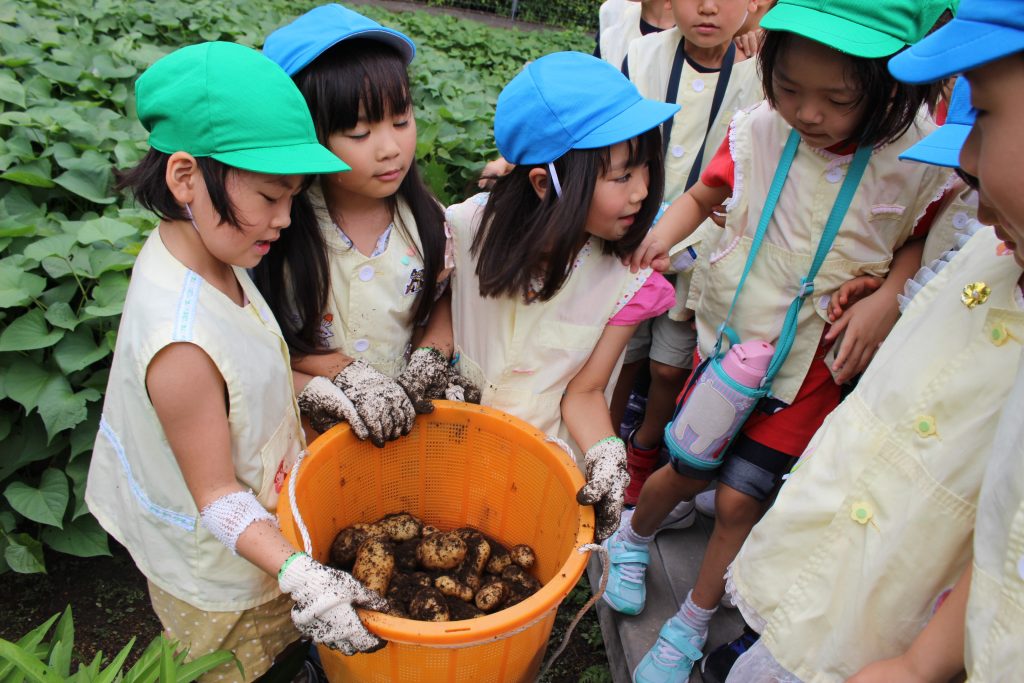 籠に入った2種類の収穫物をそれぞれに観察し、思っていた以上の収穫量に拍手が起きたり、「やったね!」「すごい!!」と声に出して喜ぶ年長組でした。どちらもお泊まり保育の食材として年長組の皆で味わいたいと思います。