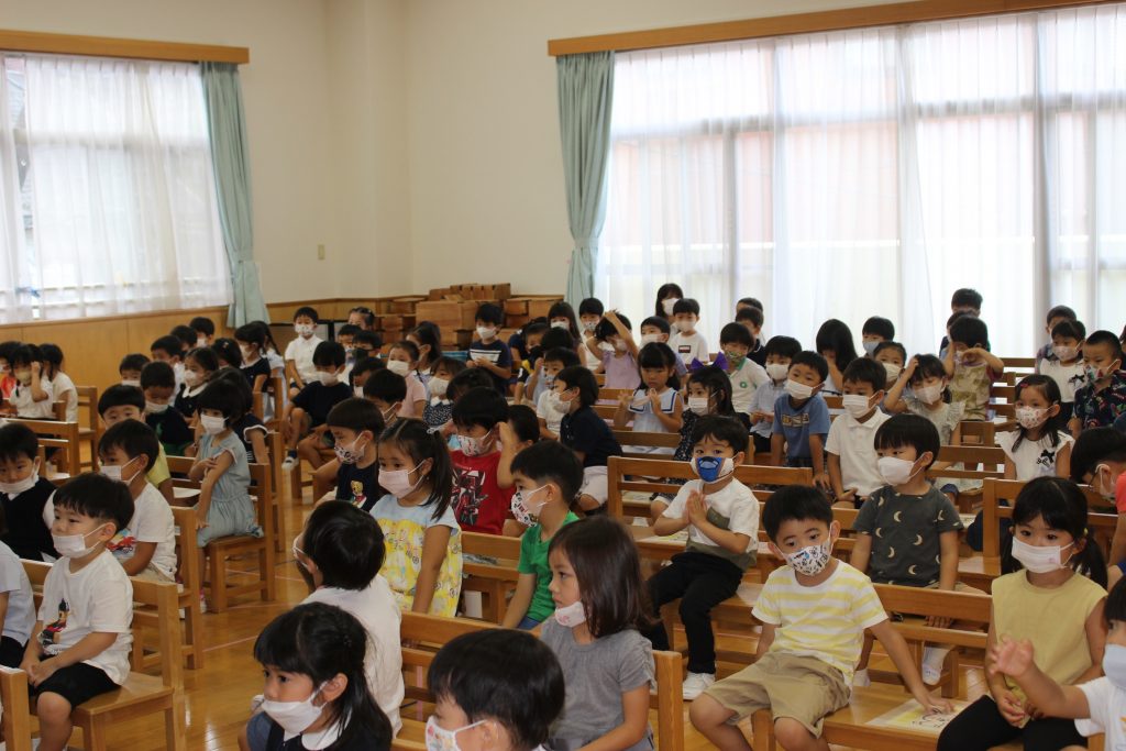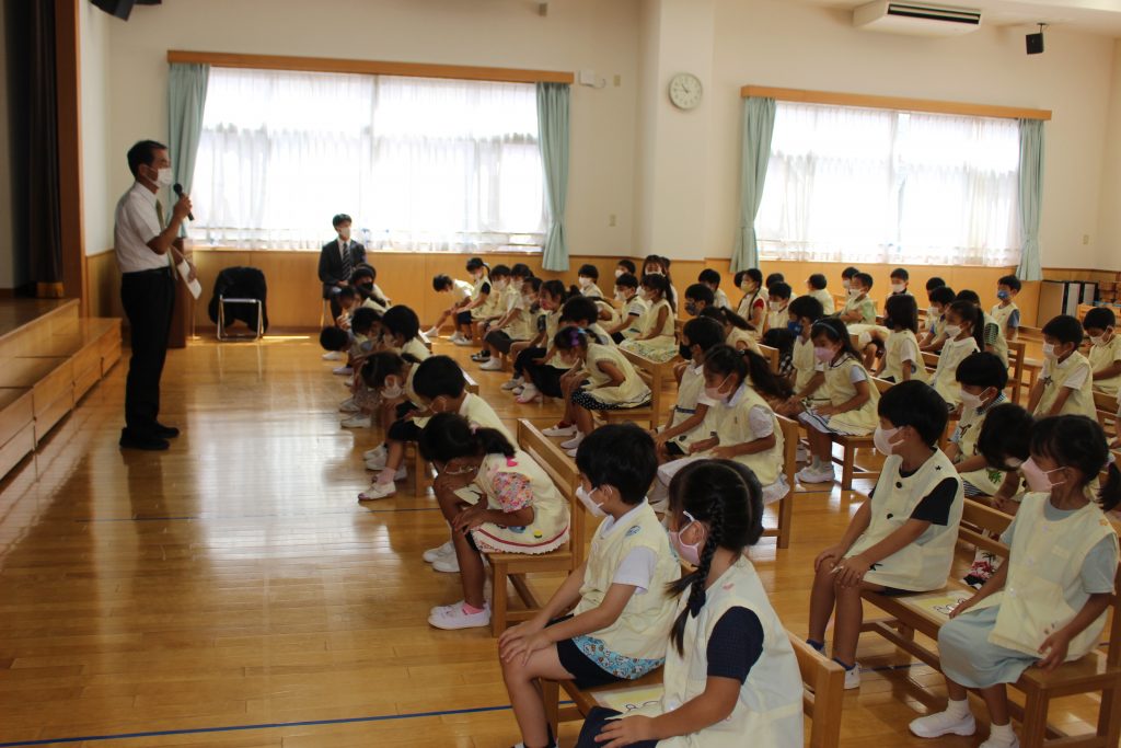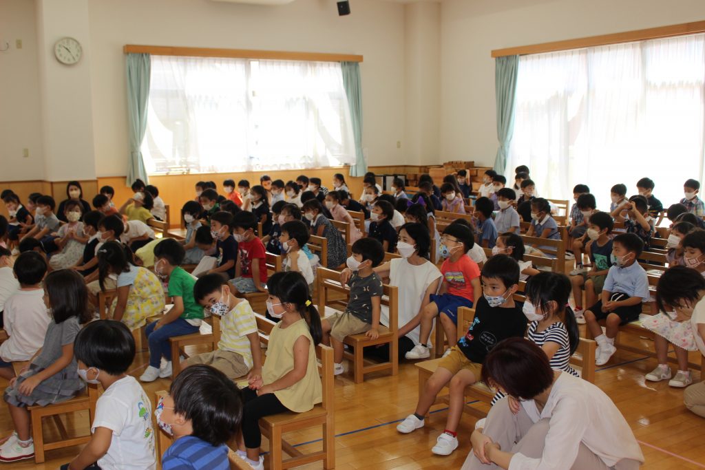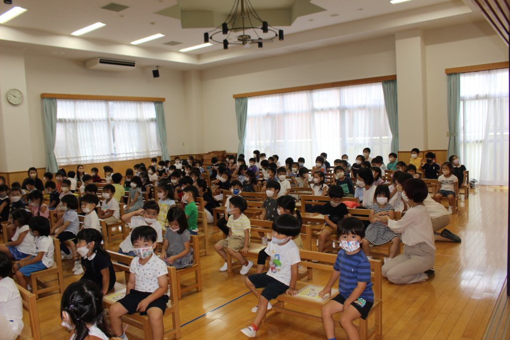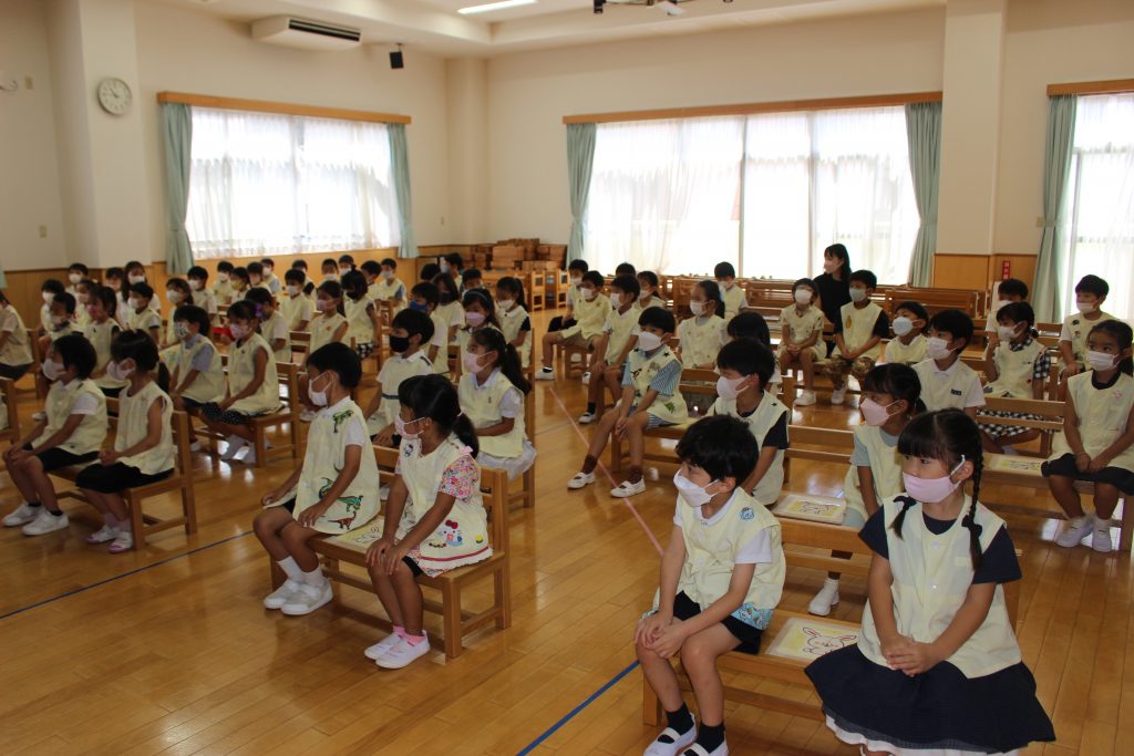 長い夏休みが終わり、2学期の始業式を行いました。久しぶりの登園に少し緊張した表情が見られましたが、予想していたよりも元気に、そして園が始まることに期待感をもってくれていたことがうかがえる姿がありました。夏休みに入る前にご家庭での過ごし方についてお手紙でお知らせしたり、園長先生から終業式の中で子どもたちへ約束の話がいくつかありました。それぞれがどのような夏休みを過ごしたのかお話を聞くことを楽しみにしています。