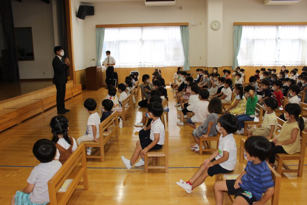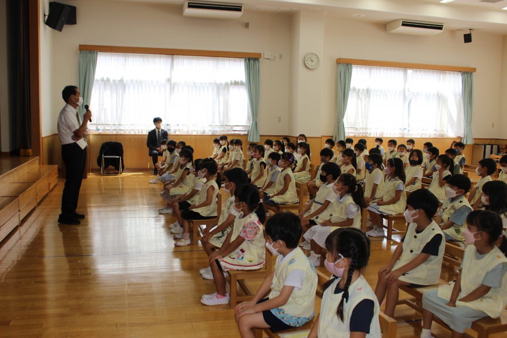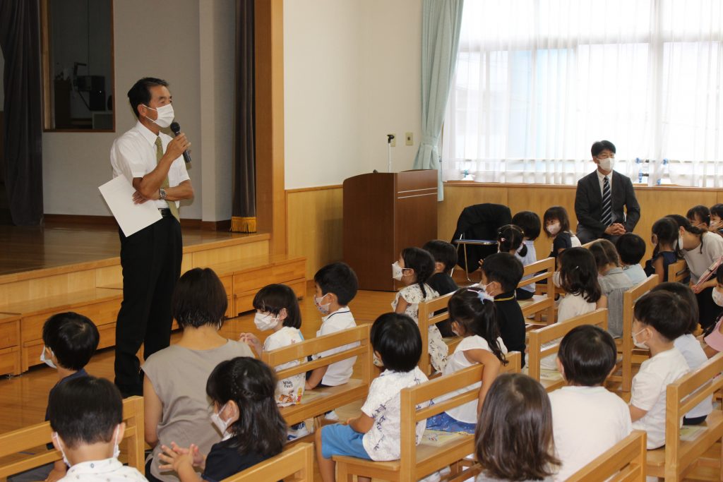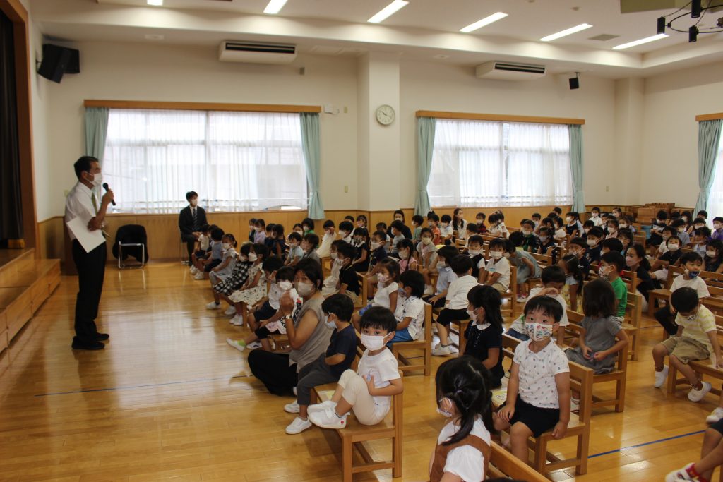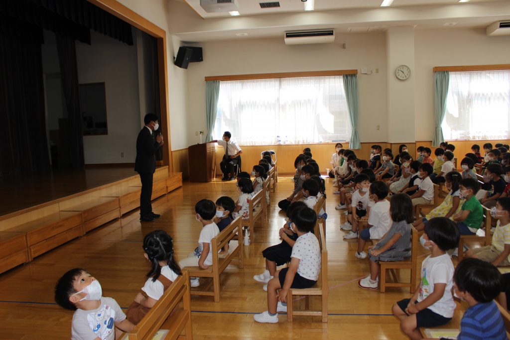 長い夏休みが終わり、2学期の始業式を行いました。久しぶりの登園に少し緊張した表情が見られましたが、予想していたよりも元気に、そして園が始まることに期待感をもってくれていたことがうかがえる姿がありました。夏休みに入る前にご家庭での過ごし方についてお手紙でお知らせしたり、園長先生から終業式の中で子どもたちへ約束の話がいくつかありました。それぞれがどのような夏休みを過ごしたのかお話を聞くことを楽しみにしています。