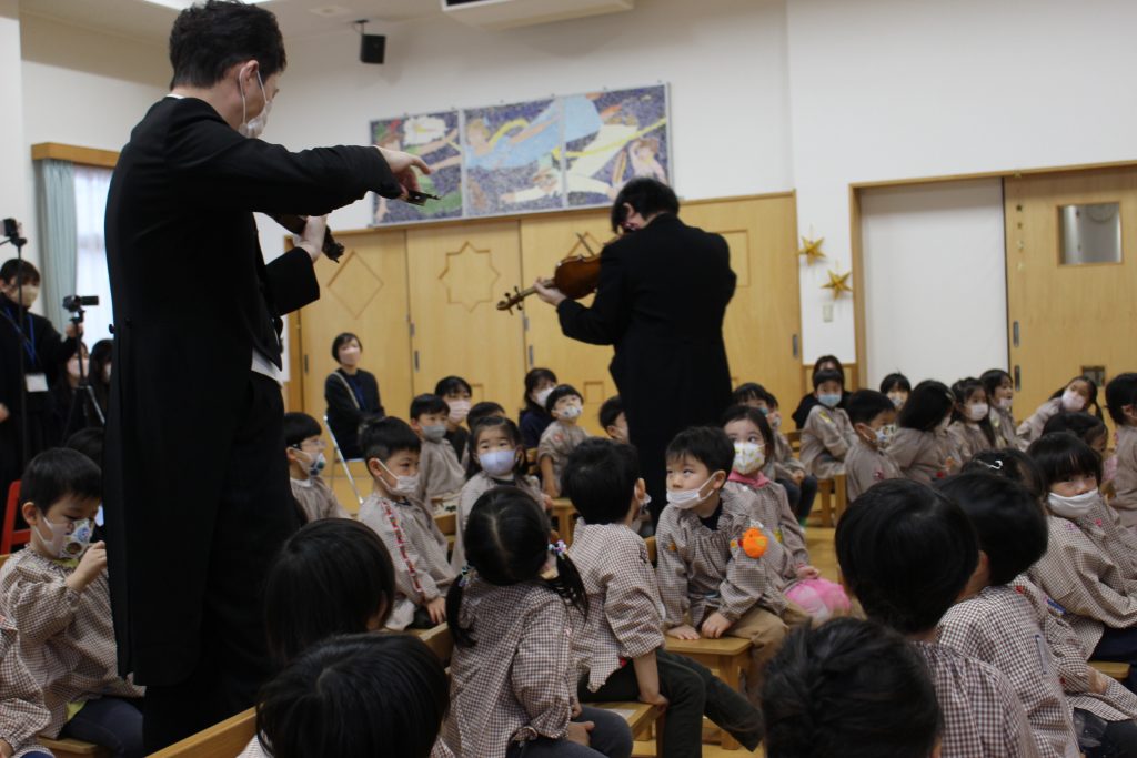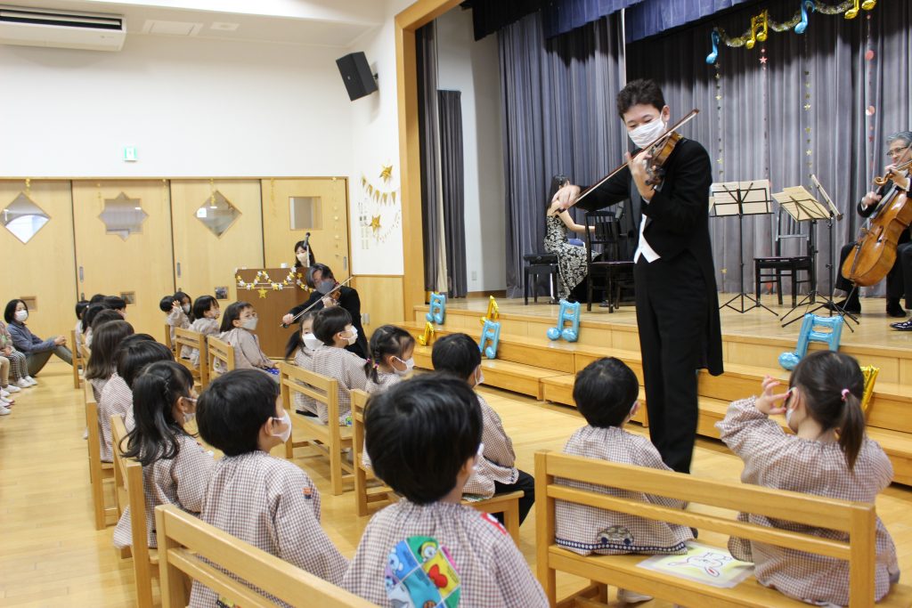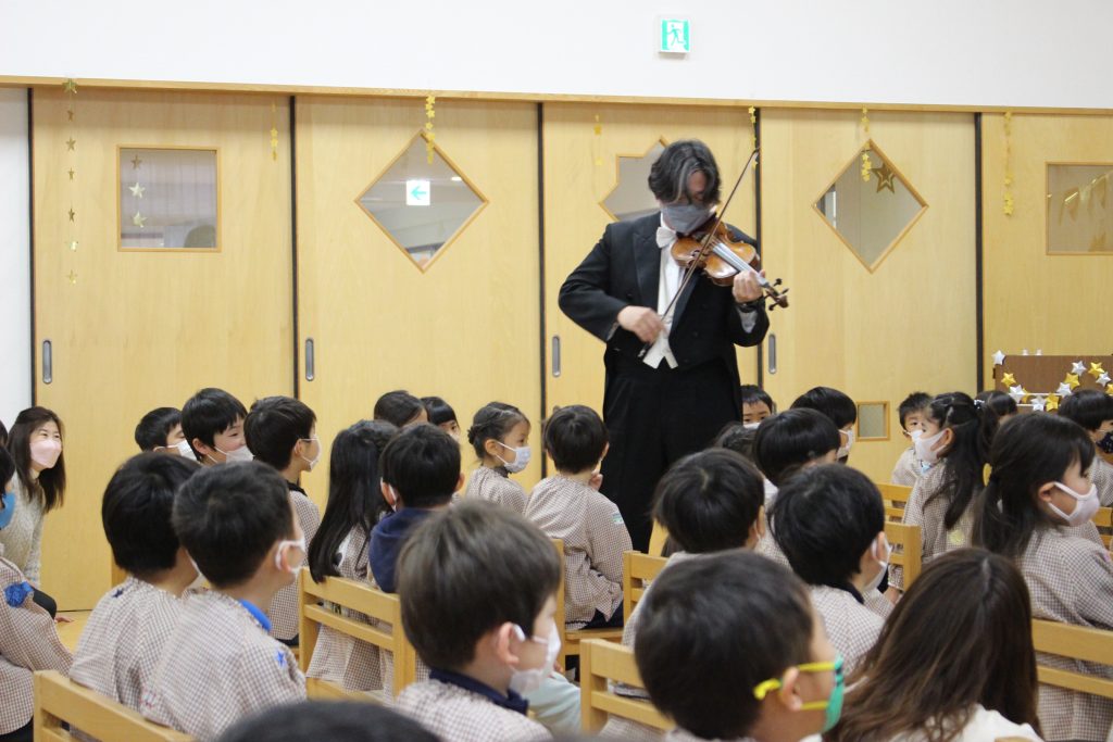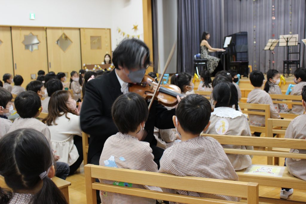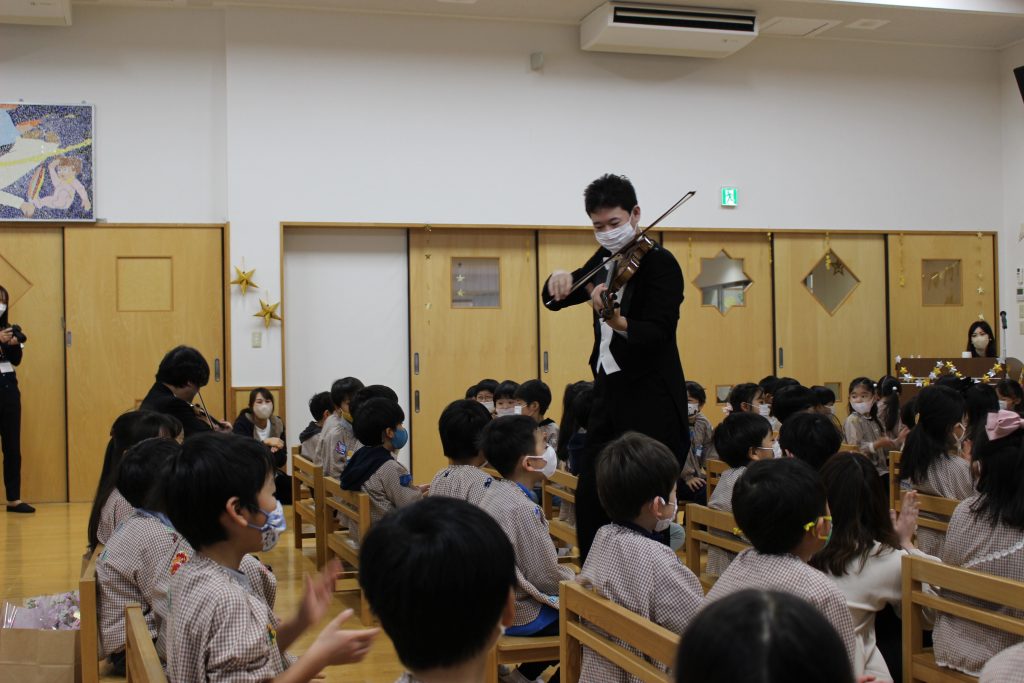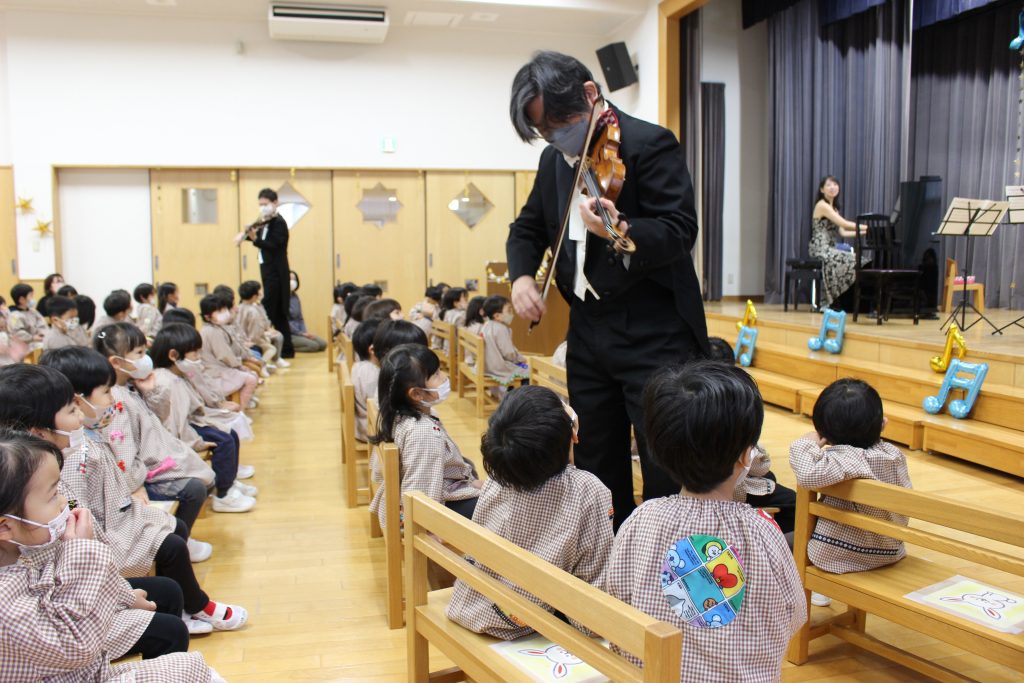 2曲目はディズニーメドレー。ミッキーマウスマーチから始まり、自分の知っている曲が出てくると「これ、知ってる!」「ディズニーランドの曲だよね。」と隣の子と話したり、自然と一部で手拍子が起きると、遊戯室中が湧きました。3曲目のチャルダッシュでは、舞台を下りて子ども達の近くでの演奏でした。目の前に演奏者の方が来ると、弓や指の動きをじっと見つめたり、少し恥ずかしそうにはにかむような表情をしたり、ユーモアのある演奏に笑い声が起きたりしていました。