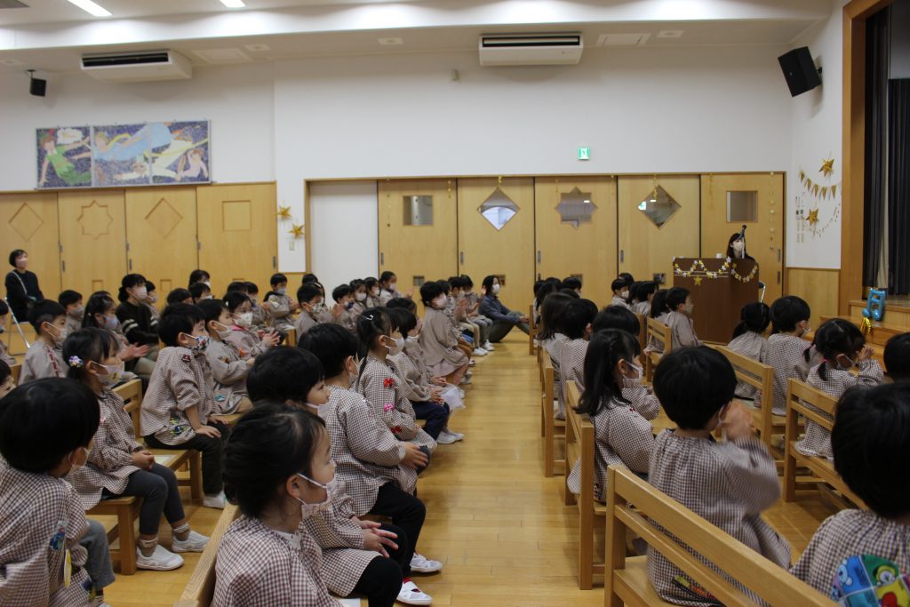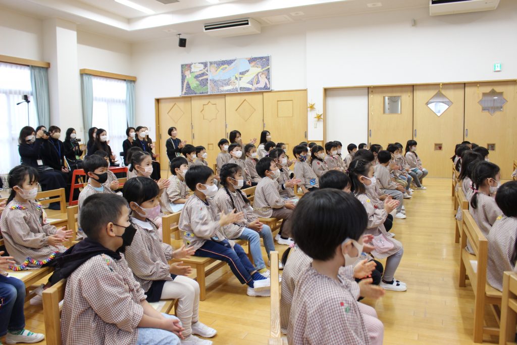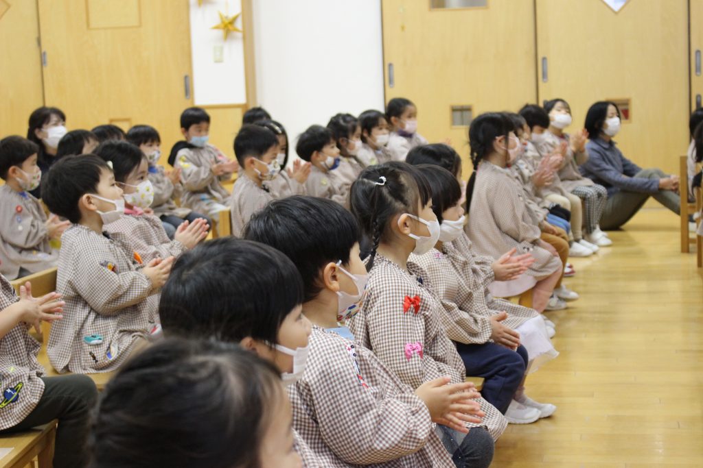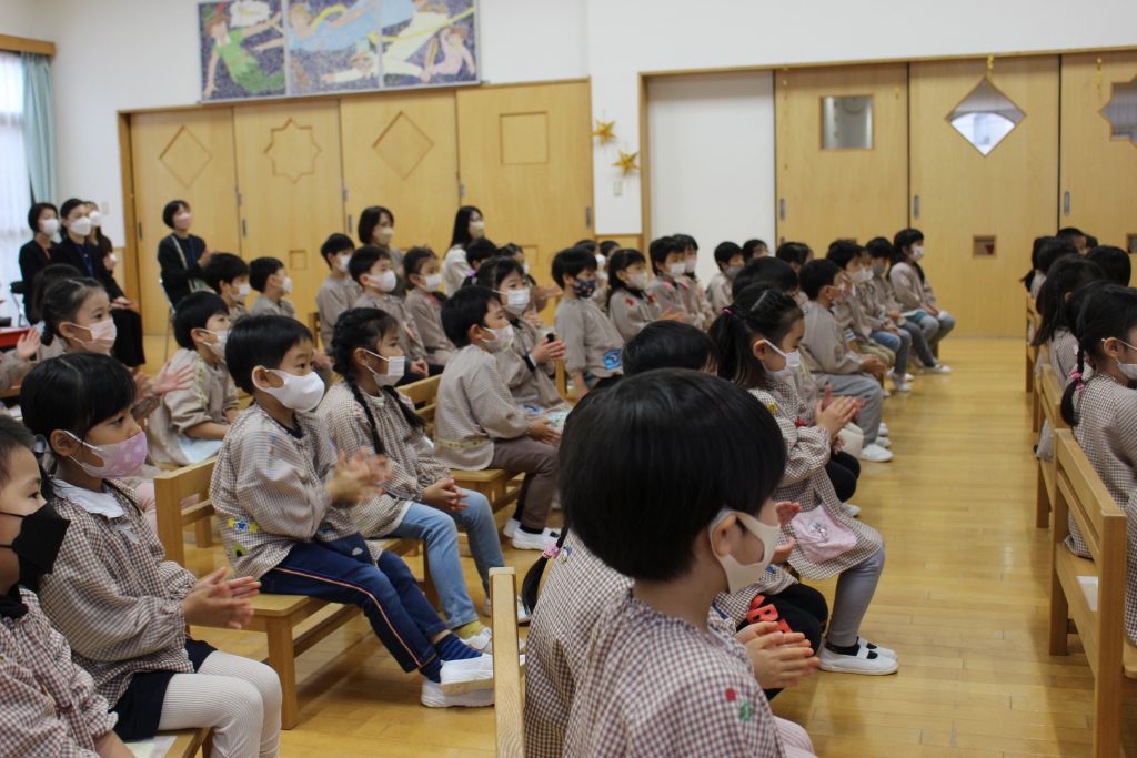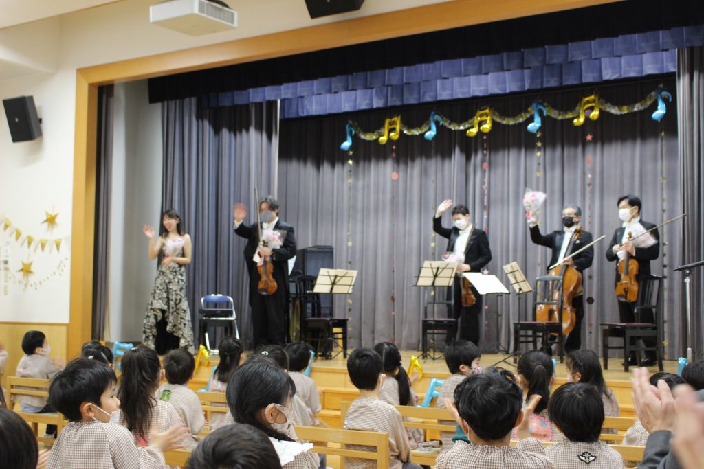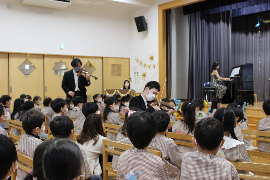 2曲目はディズニーメドレー。ミッキーマウスマーチから始まり、自分の知っている曲が出てくると「これ、知ってる!」「ディズニーランドの曲だよね。」と隣の子と話したり、自然と一部で手拍子が起きると、遊戯室中が湧きました。3曲目のチャルダッシュでは、舞台を下りて子ども達の近くでの演奏でした。目の前に演奏者の方が来ると、弓や指の動きをじっと見つめたり、少し恥ずかしそうにはにかむような表情をしたり、ユーモアのある演奏に笑い声が起きたりしていました。
