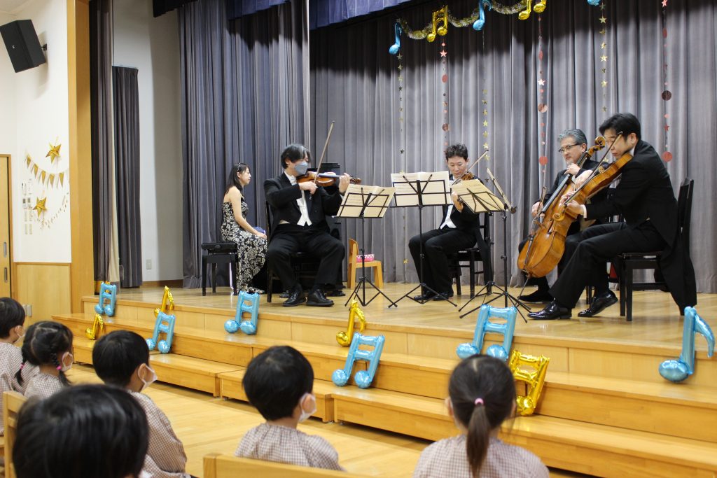 風船やガーランドなどの素敵な飾りつけがされ、いつもの遊戯室が一日限定の演奏ホールに変身。始まる前の子ども達は、期待に溢れていたように見えました。1曲目は、アイネ・クライネ・ナハトムジーク。美しい音色に真剣な表情で聴き入っていました。1曲目の演奏後、「モーツァルトが作った曲で有名ですよ。」という話や、各楽器や演奏者の方の紹介の時間がありました。バイオリンとビオラの違いなどにも触れてくださり、子ども達の興味を引き出すようなお話に大変有り難く思いました。