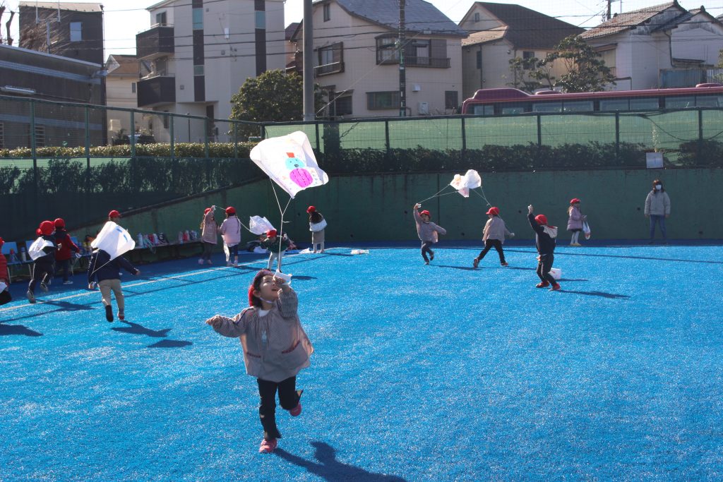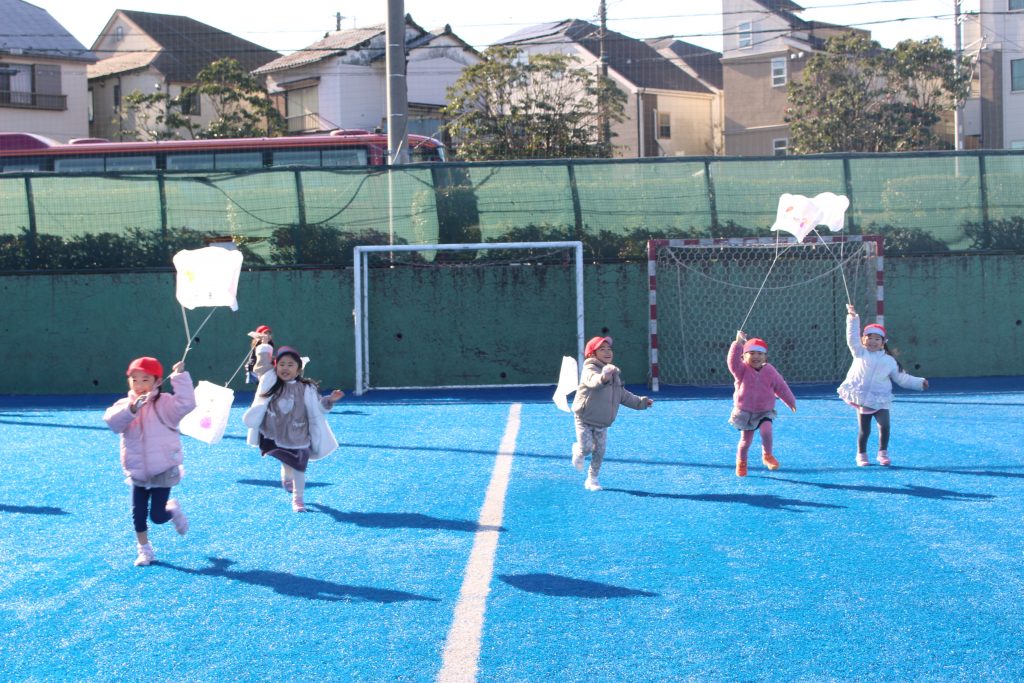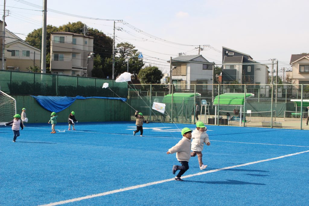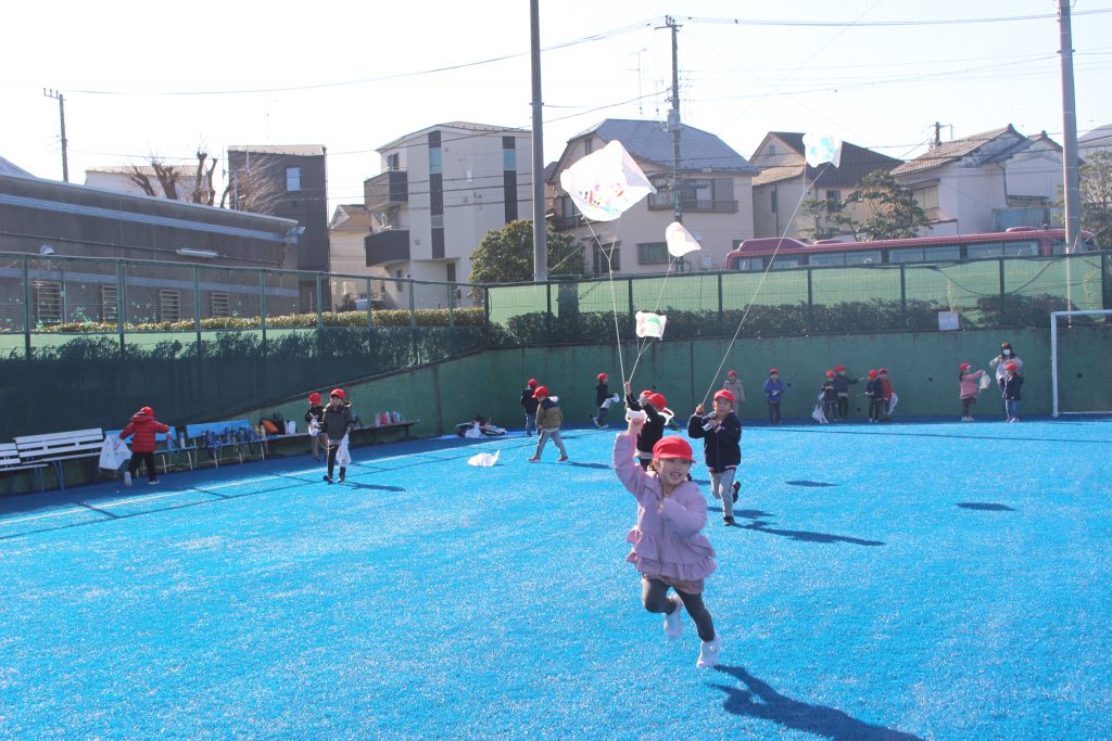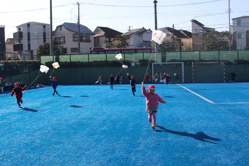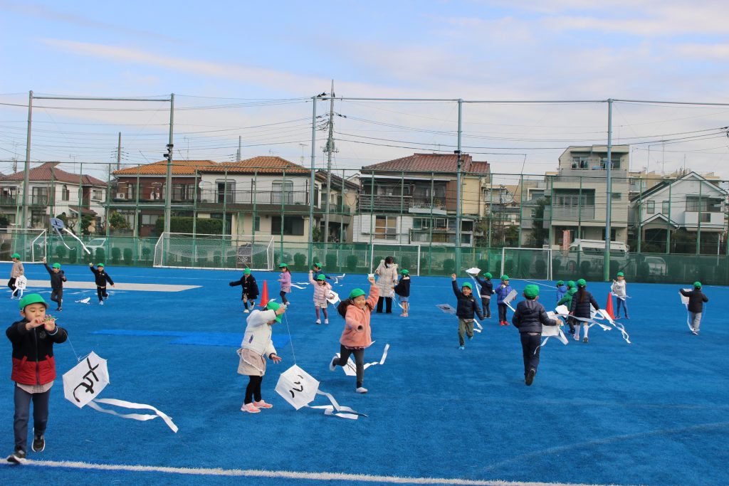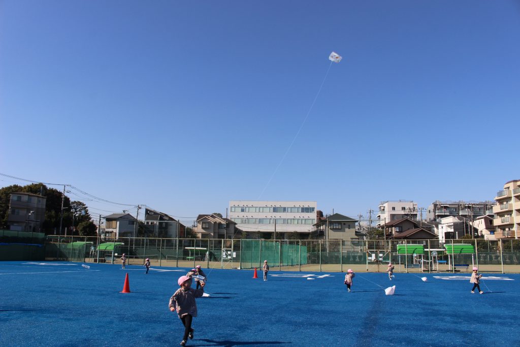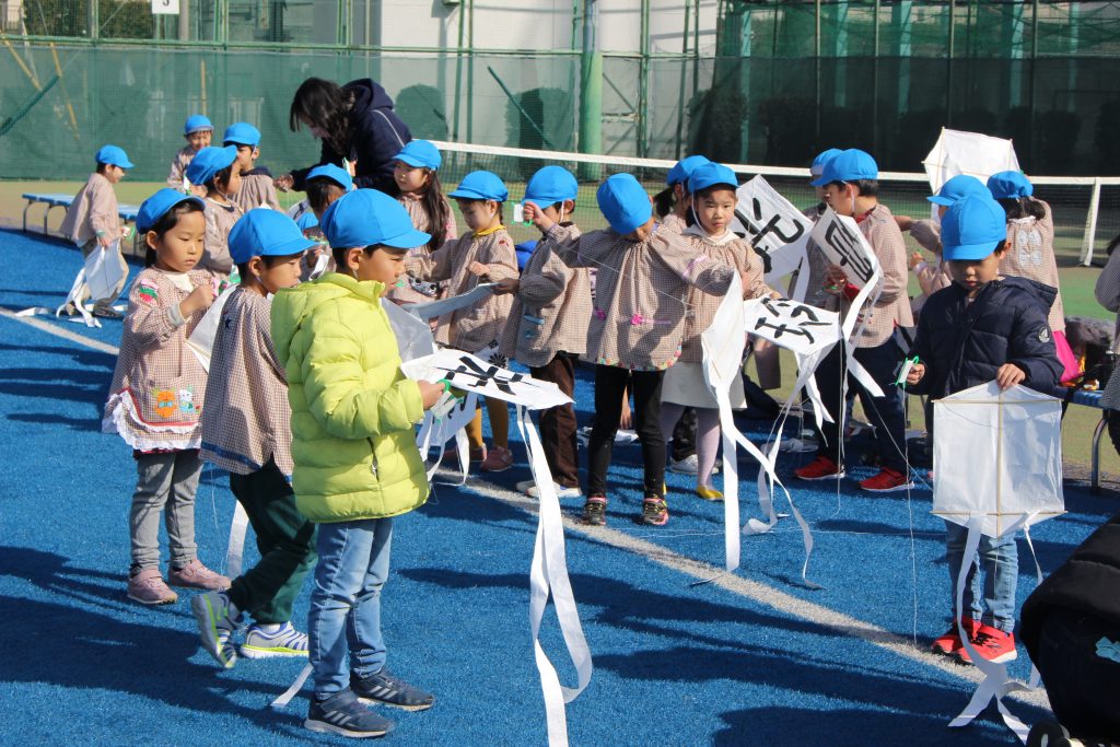 正月あそびの一つである『凧あげ』。本園では、年少・年中組は絵凧、年長組は字凧を描き(書き)、仕上げました。出来上がった後は、学年別に日程を分散して東京都市大学総合グラウンドにお邪魔させていただき、凧あげを行いました。