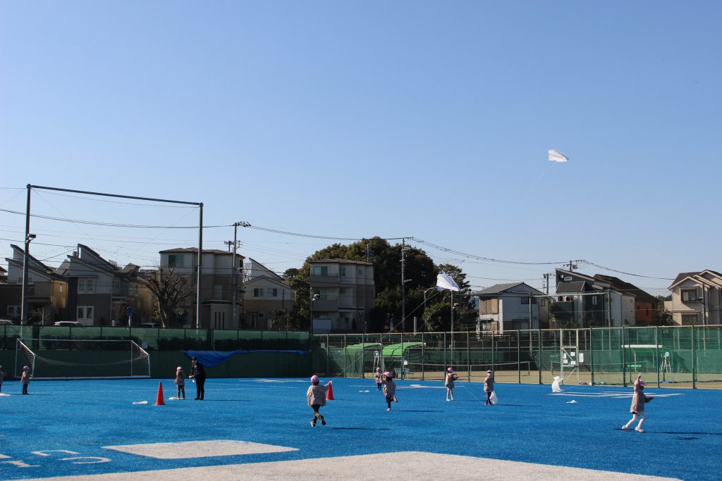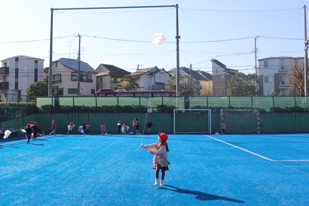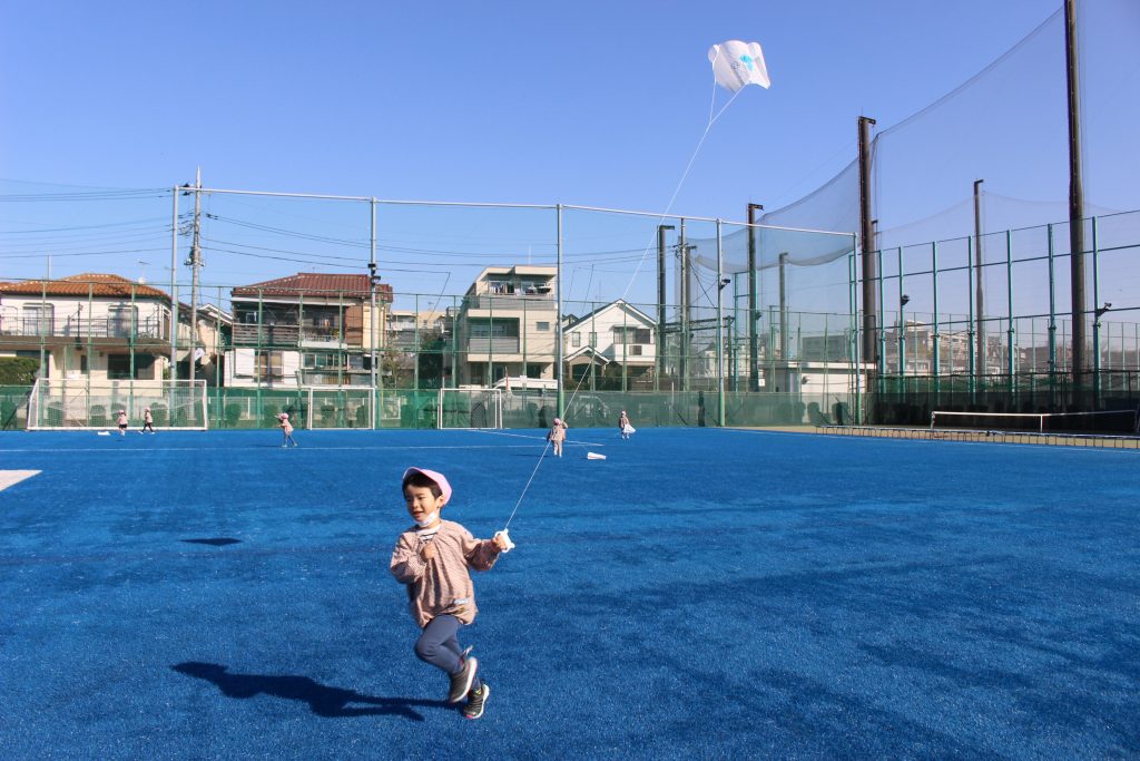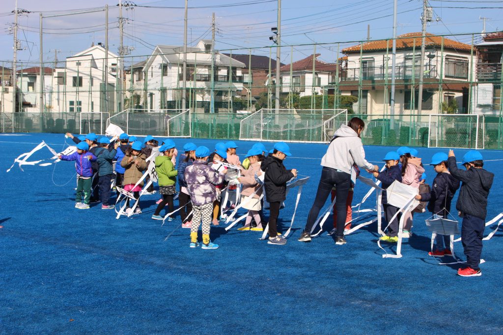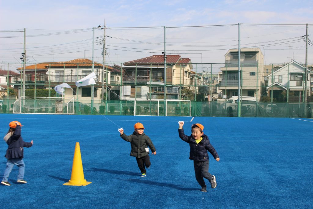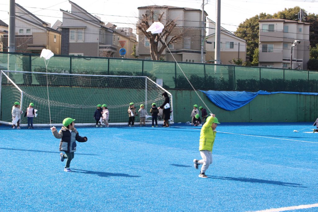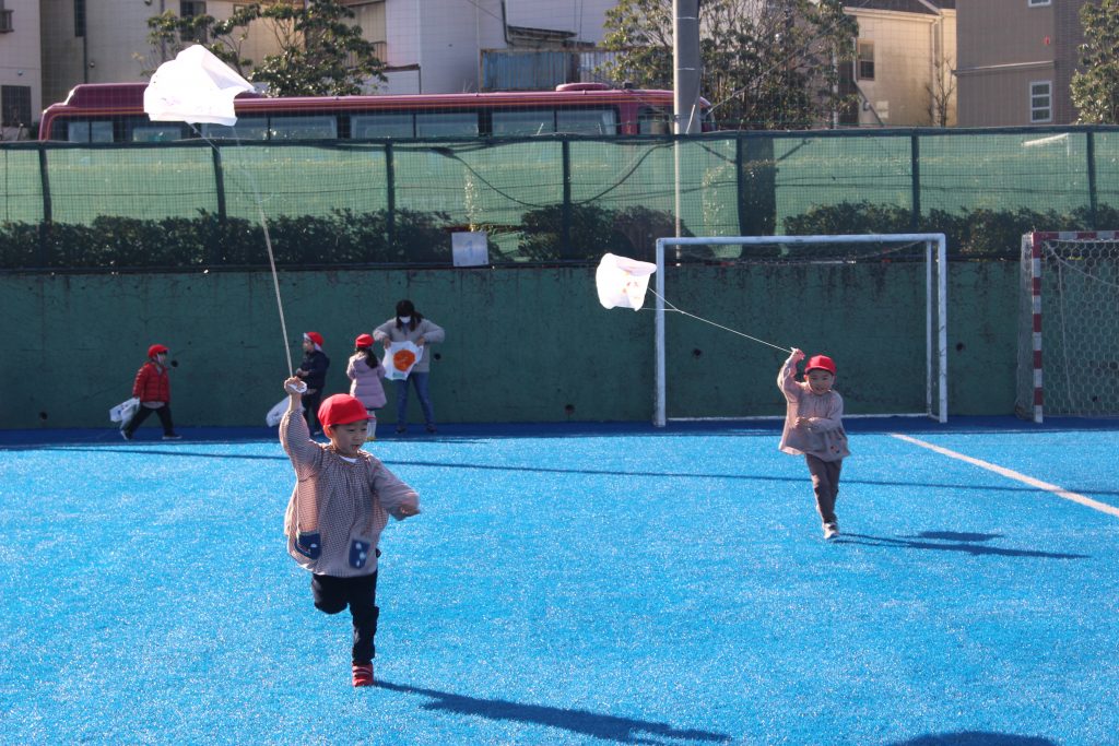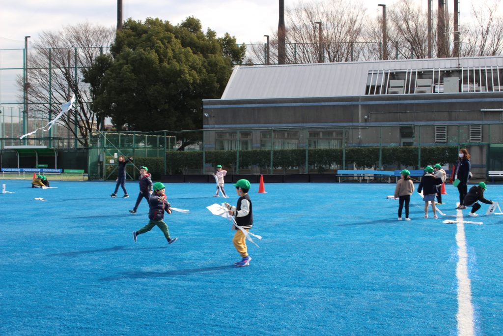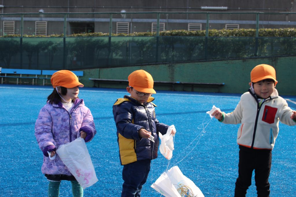 正月あそびの一つである『凧あげ』。本園では、年少・年中組は絵凧、年長組は字凧を描き(書き)、仕上げました。出来上がった後は、学年別に日程を分散して東京都市大学総合グラウンドにお邪魔させていただき、凧あげを行いました。