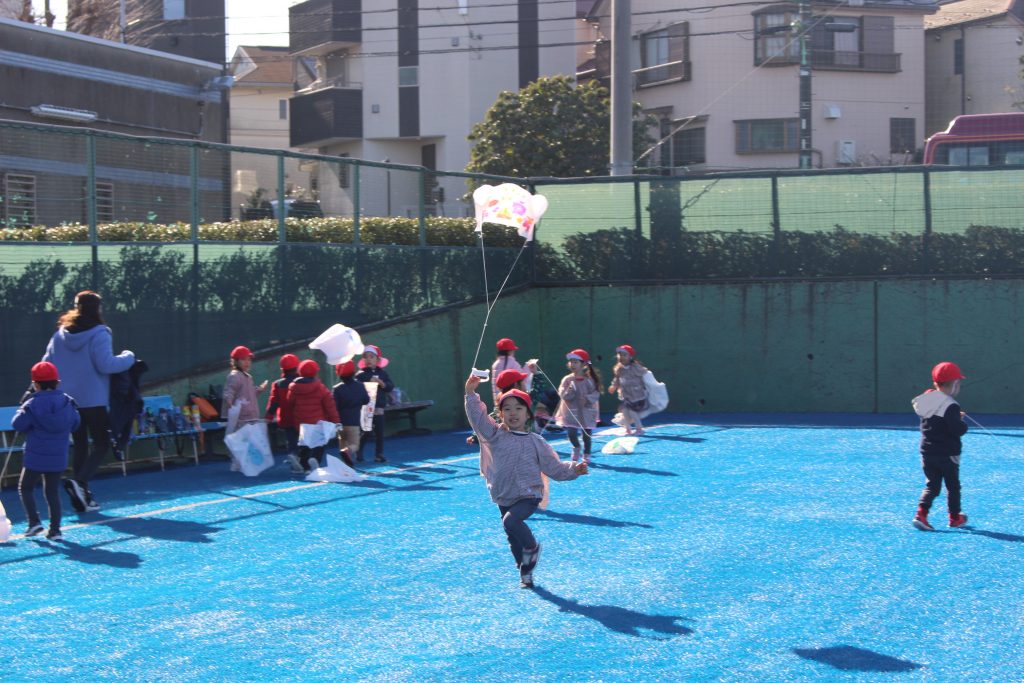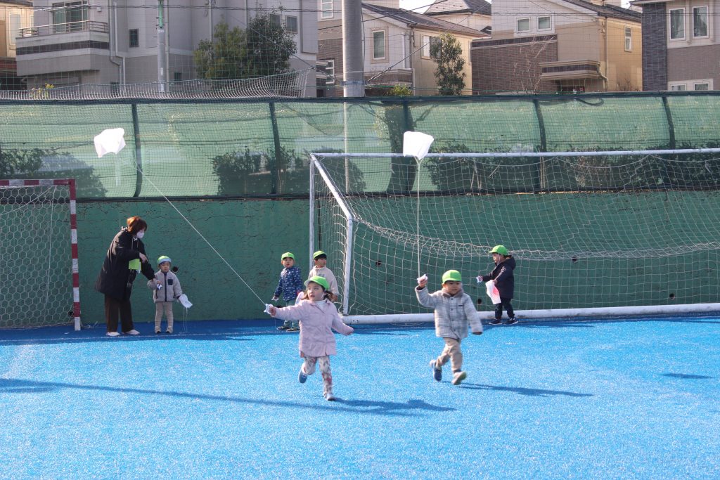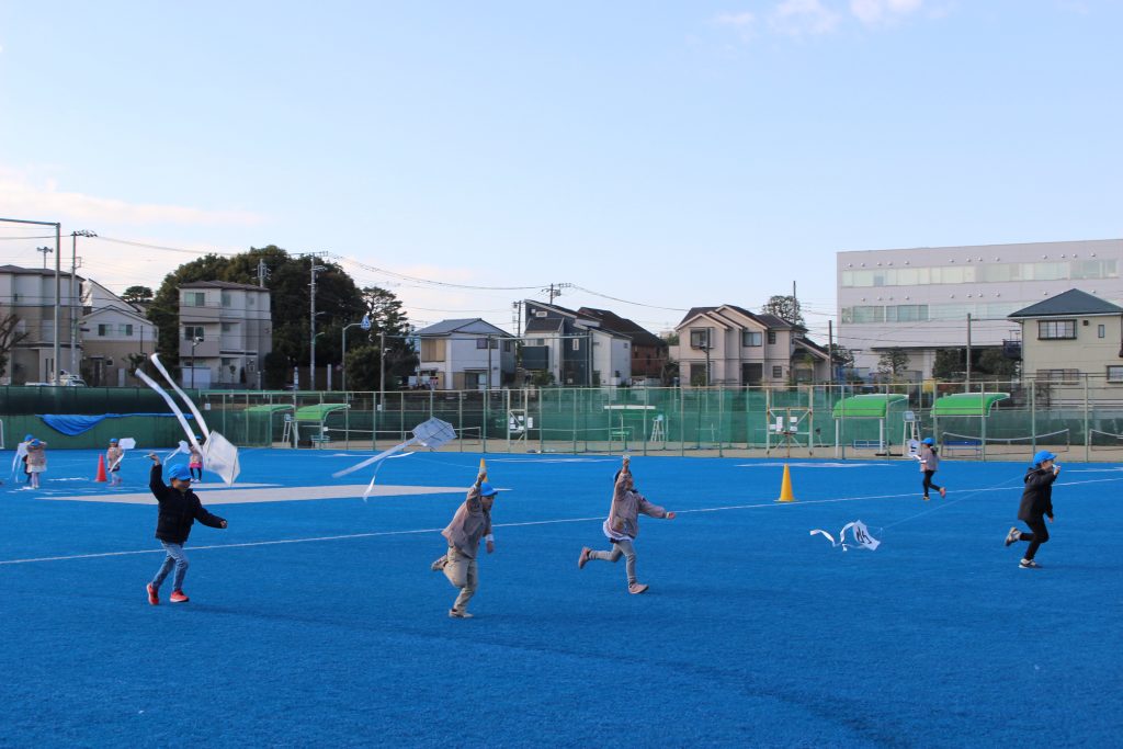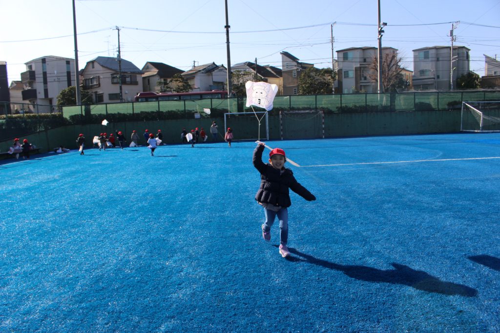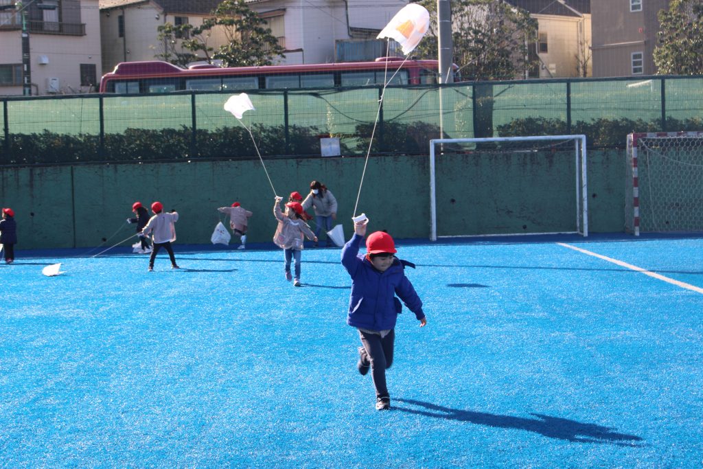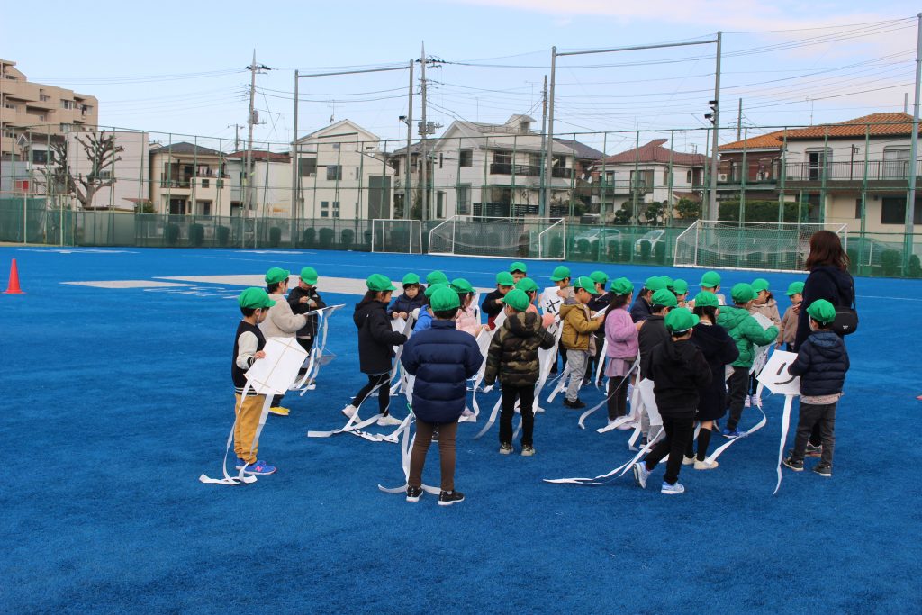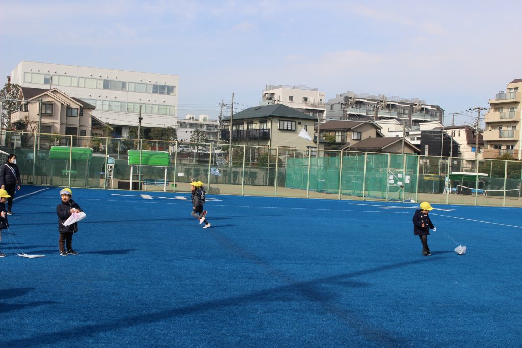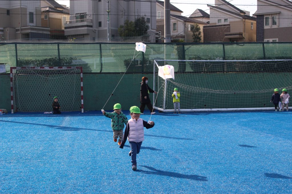 正月あそびの一つである『凧あげ』。本園では、年少・年中組は絵凧、年長組は字凧を描き(書き)、仕上げました。出来上がった後は、学年別に日程を分散して東京都市大学総合グラウンドにお邪魔させていただき、凧あげを行いました。