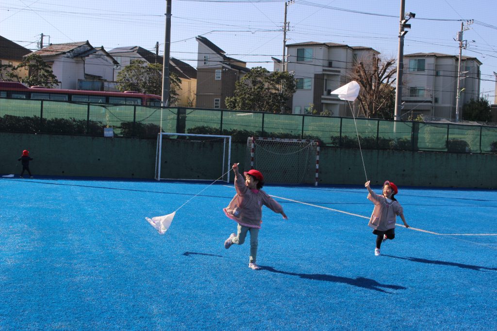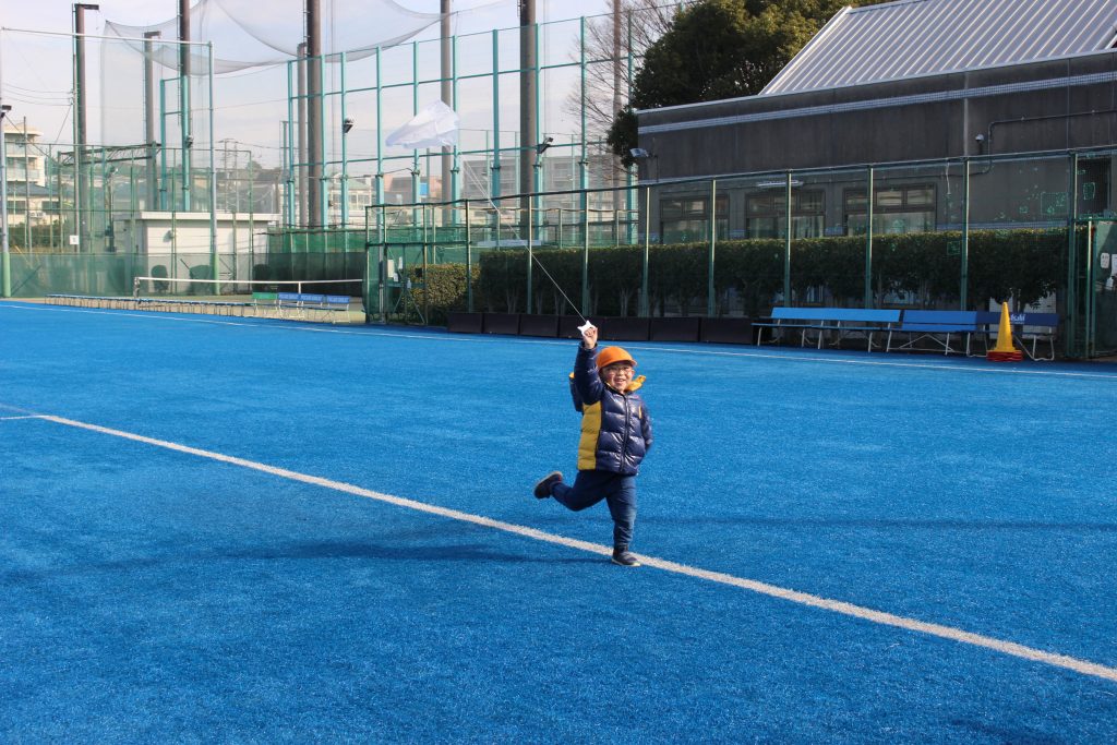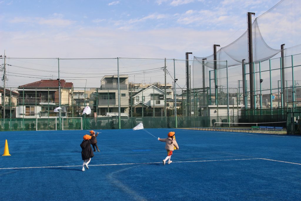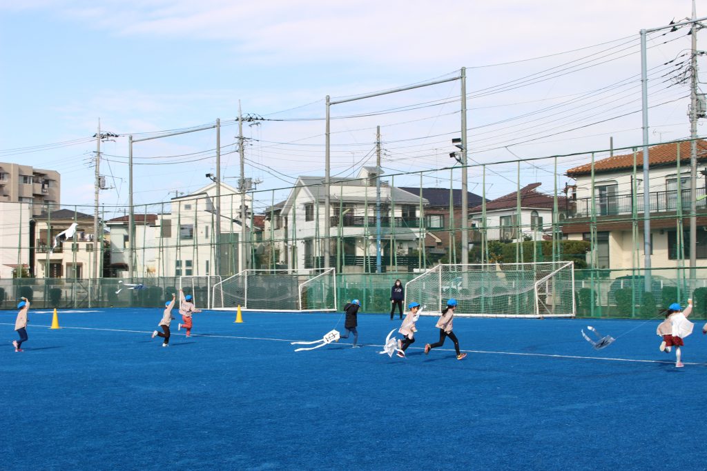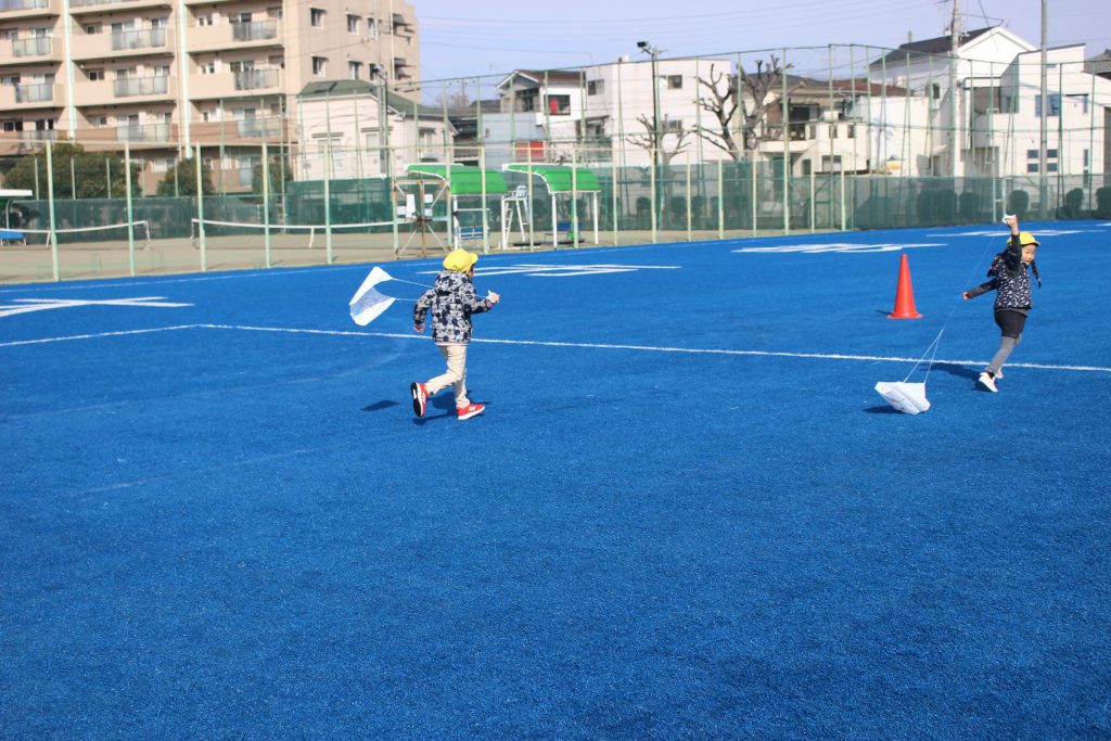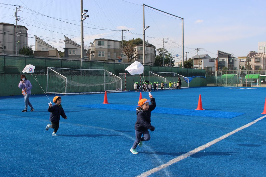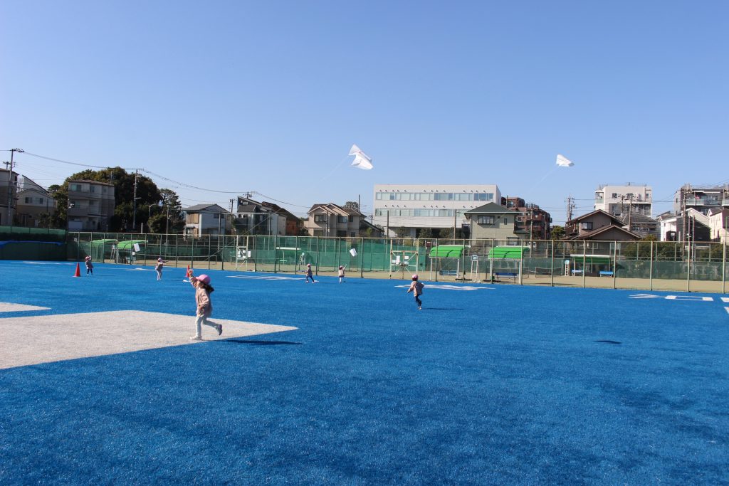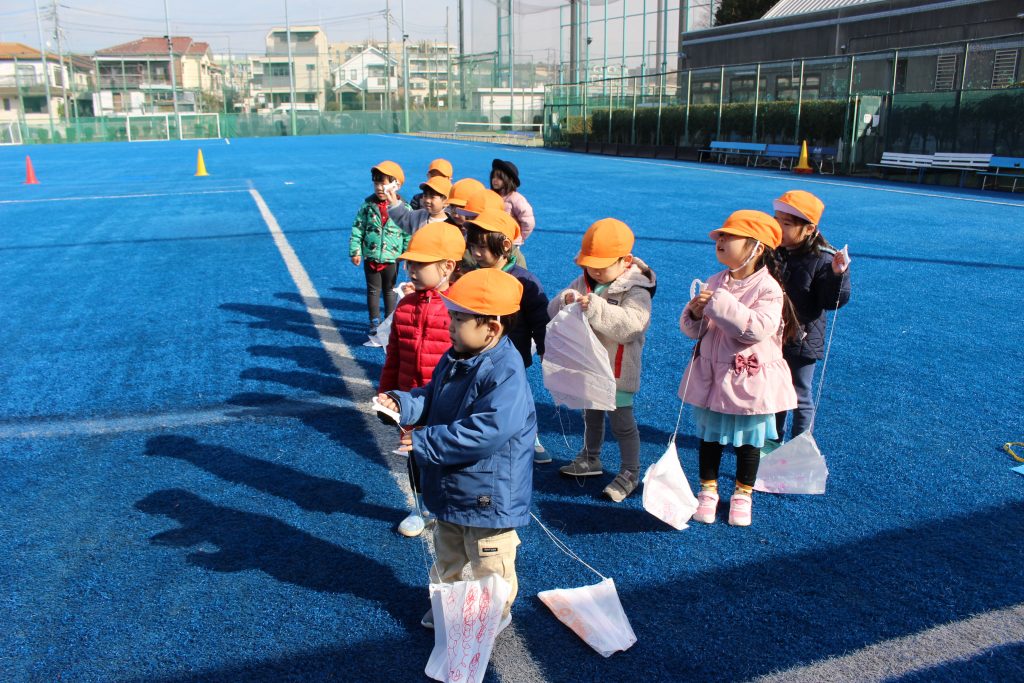 正月あそびの一つである『凧あげ』。本園では、年少・年中組は絵凧、年長組は字凧を描き(書き)、仕上げました。出来上がった後は、学年別に日程を分散して東京都市大学総合グラウンドにお邪魔させていただき、凧あげを行いました。