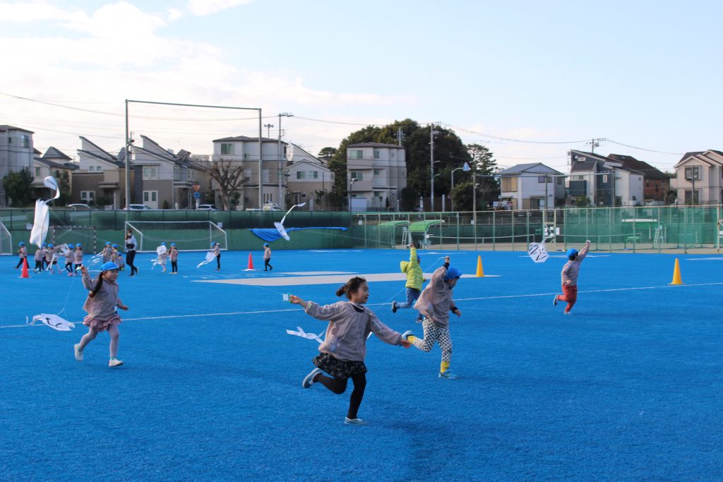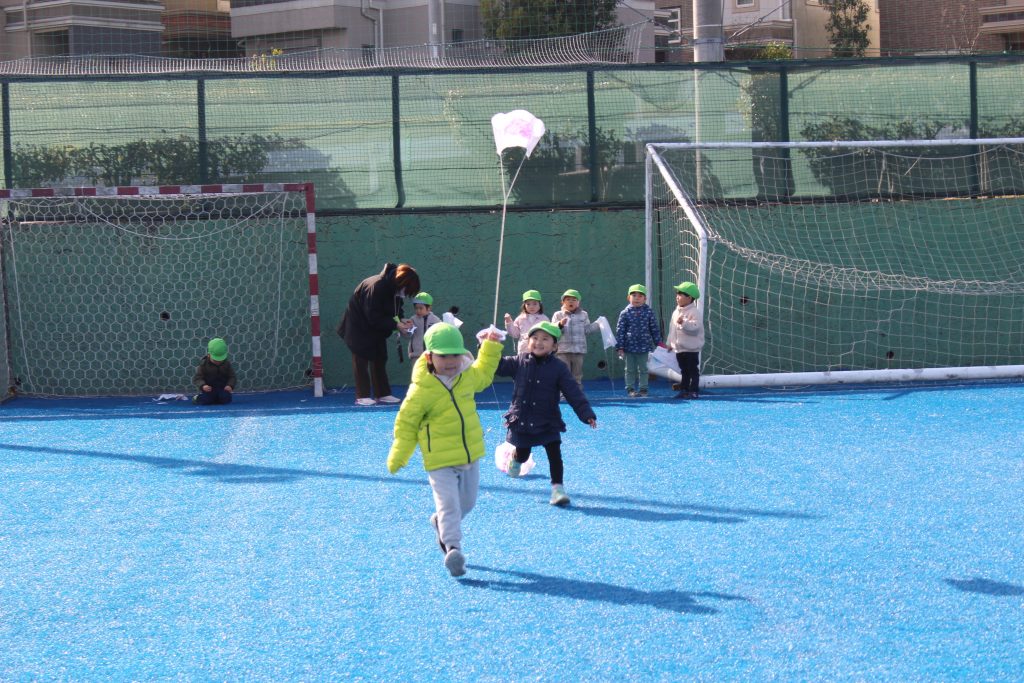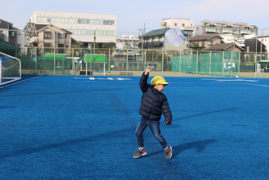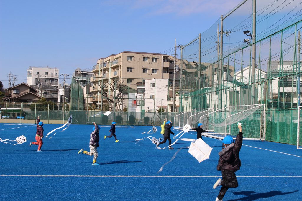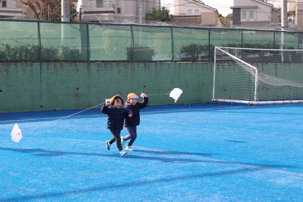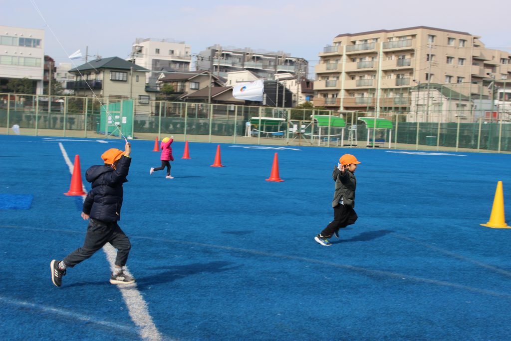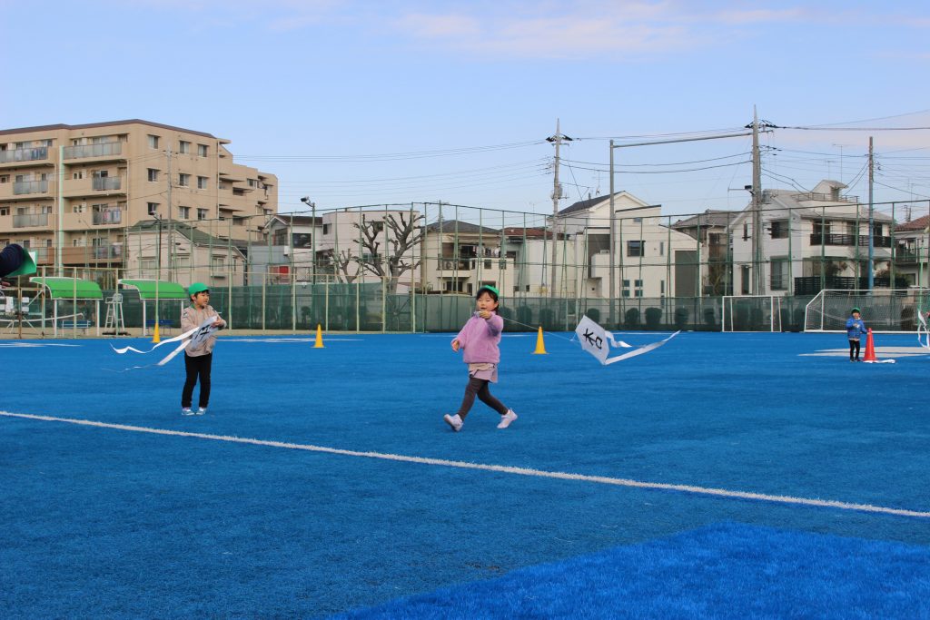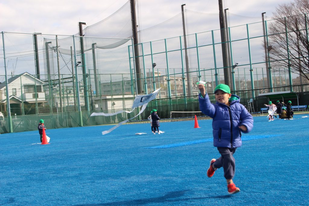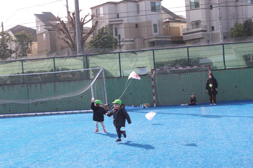 正月あそびの一つである『凧あげ』。本園では、年少・年中組は絵凧、年長組は字凧を描き(書き)、仕上げました。出来上がった後は、学年別に日程を分散して東京都市大学総合グラウンドにお邪魔させていただき、凧あげを行いました。