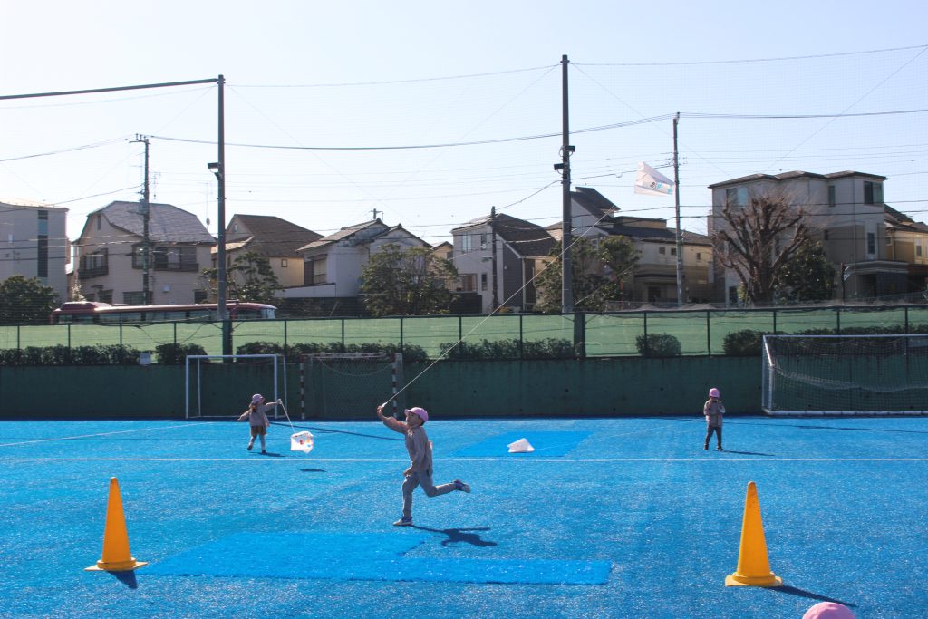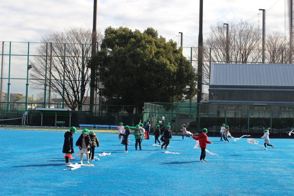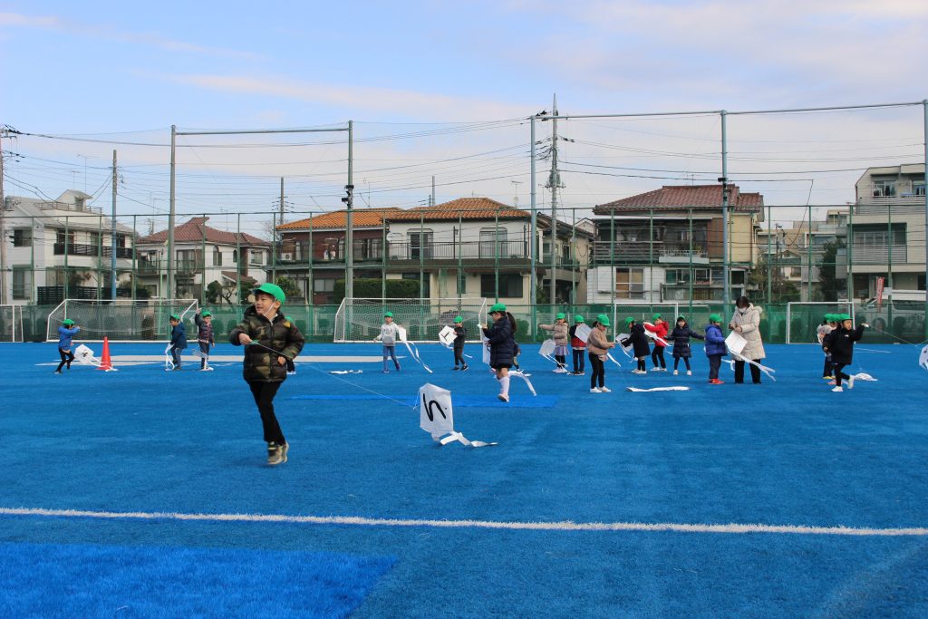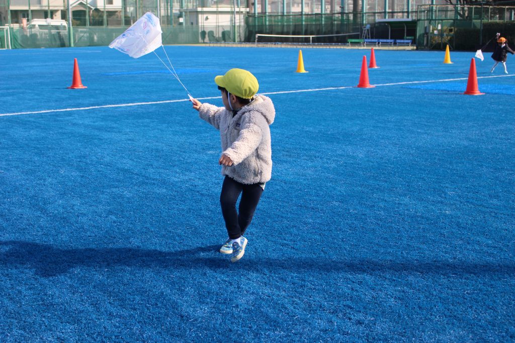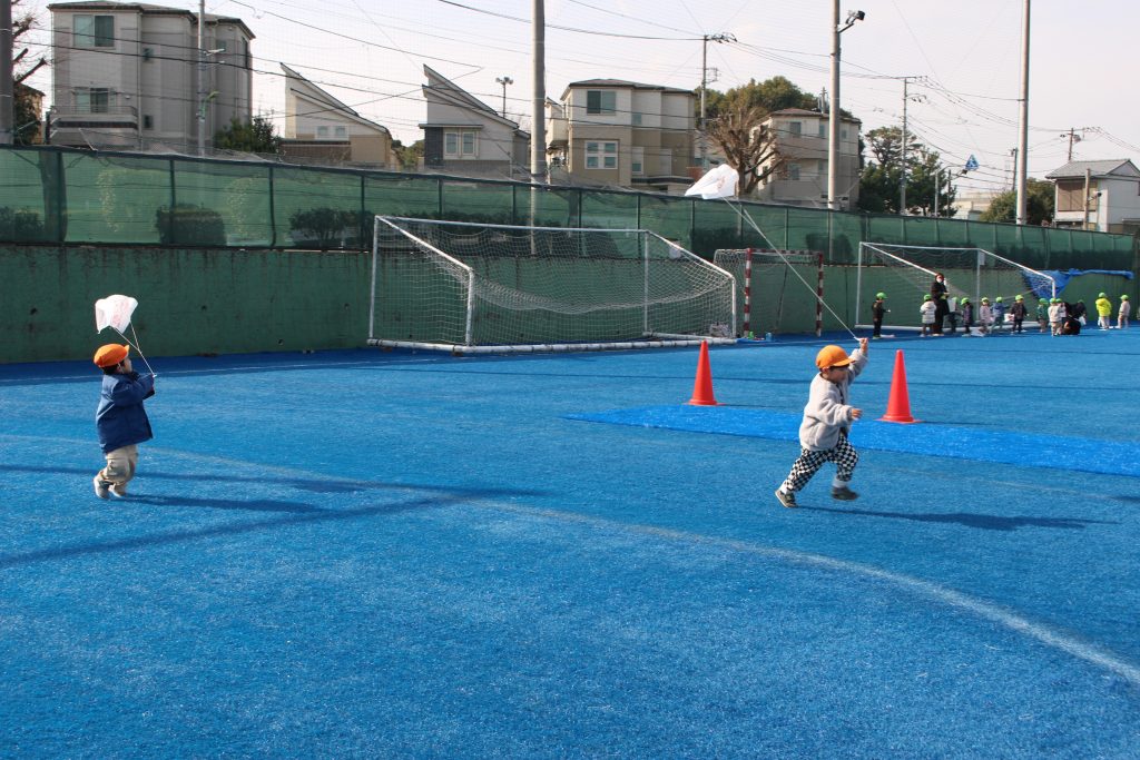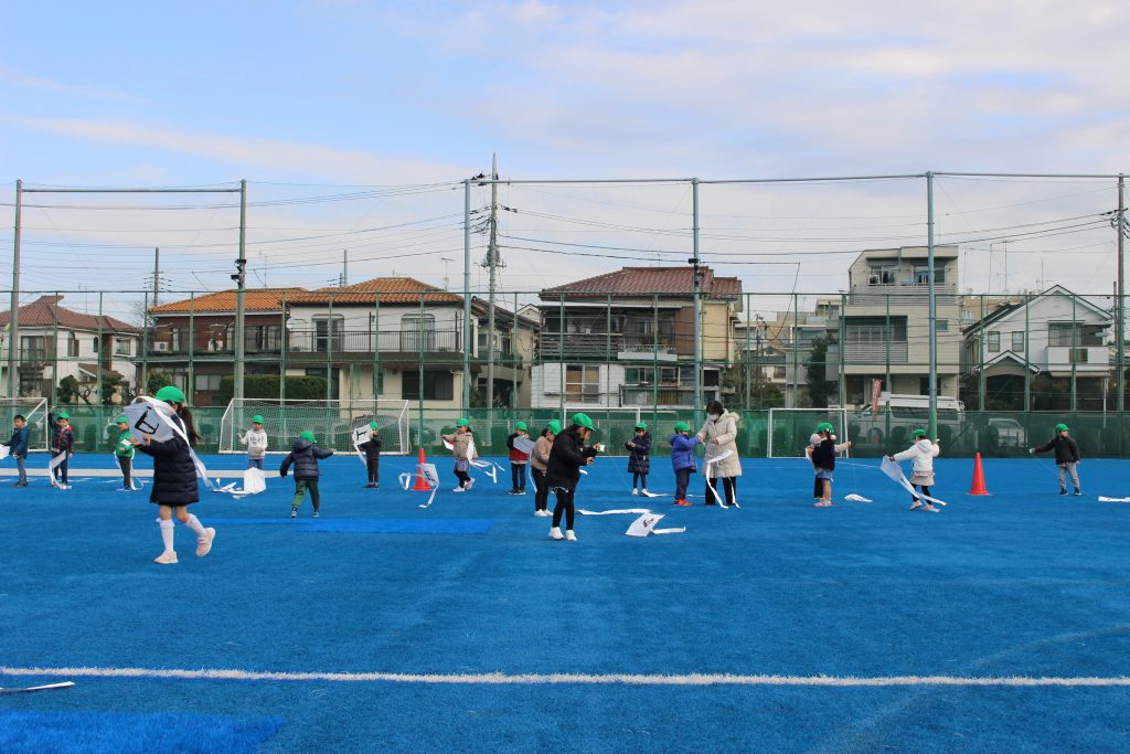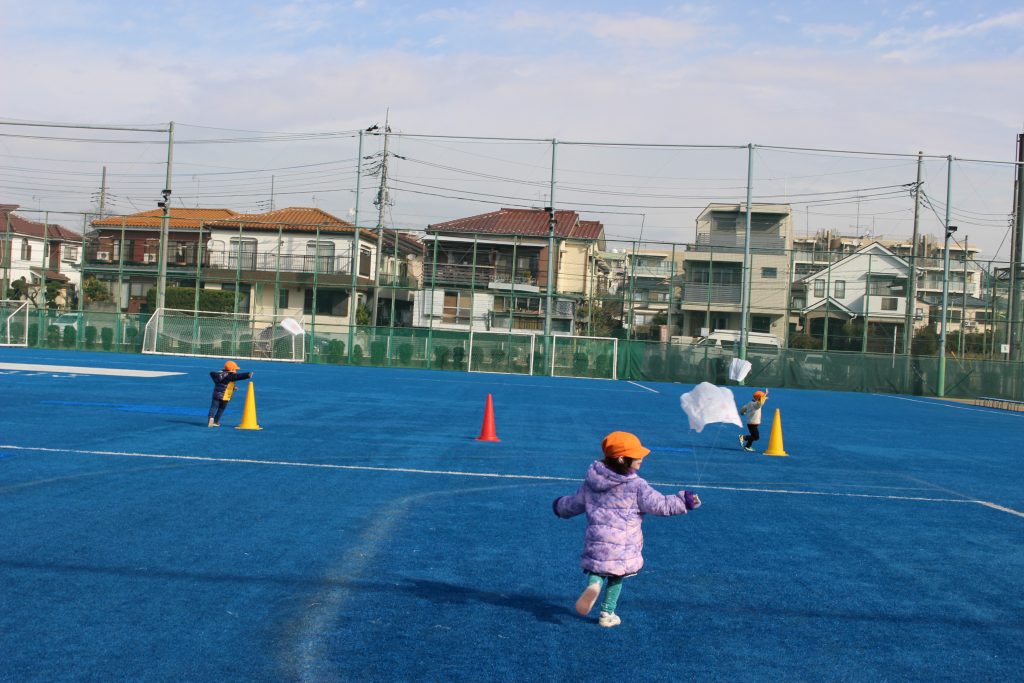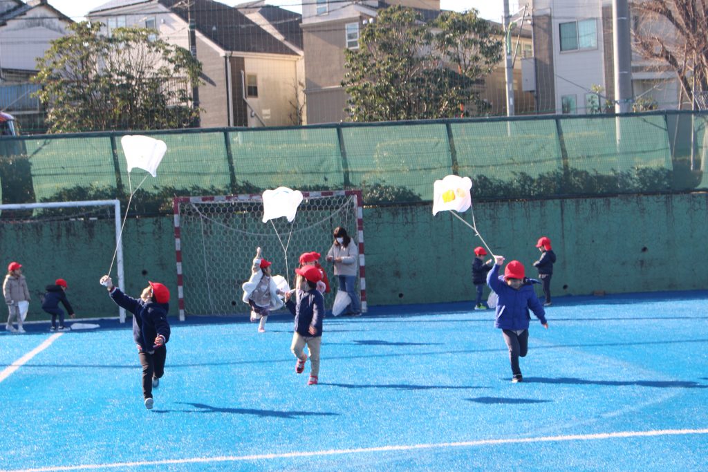 正月あそびの一つである『凧あげ』。本園では、年少・年中組は絵凧、年長組は字凧を描き(書き)、仕上げました。出来上がった後は、学年別に日程を分散して東京都市大学総合グラウンドにお邪魔させていただき、凧あげを行いました。